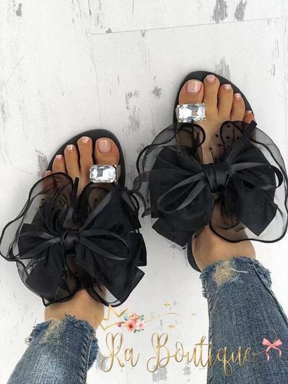 Ciabatta estiva con fiocco in tulle e strass sul pollice per renderla ancora più adorabile.