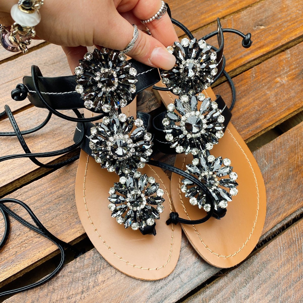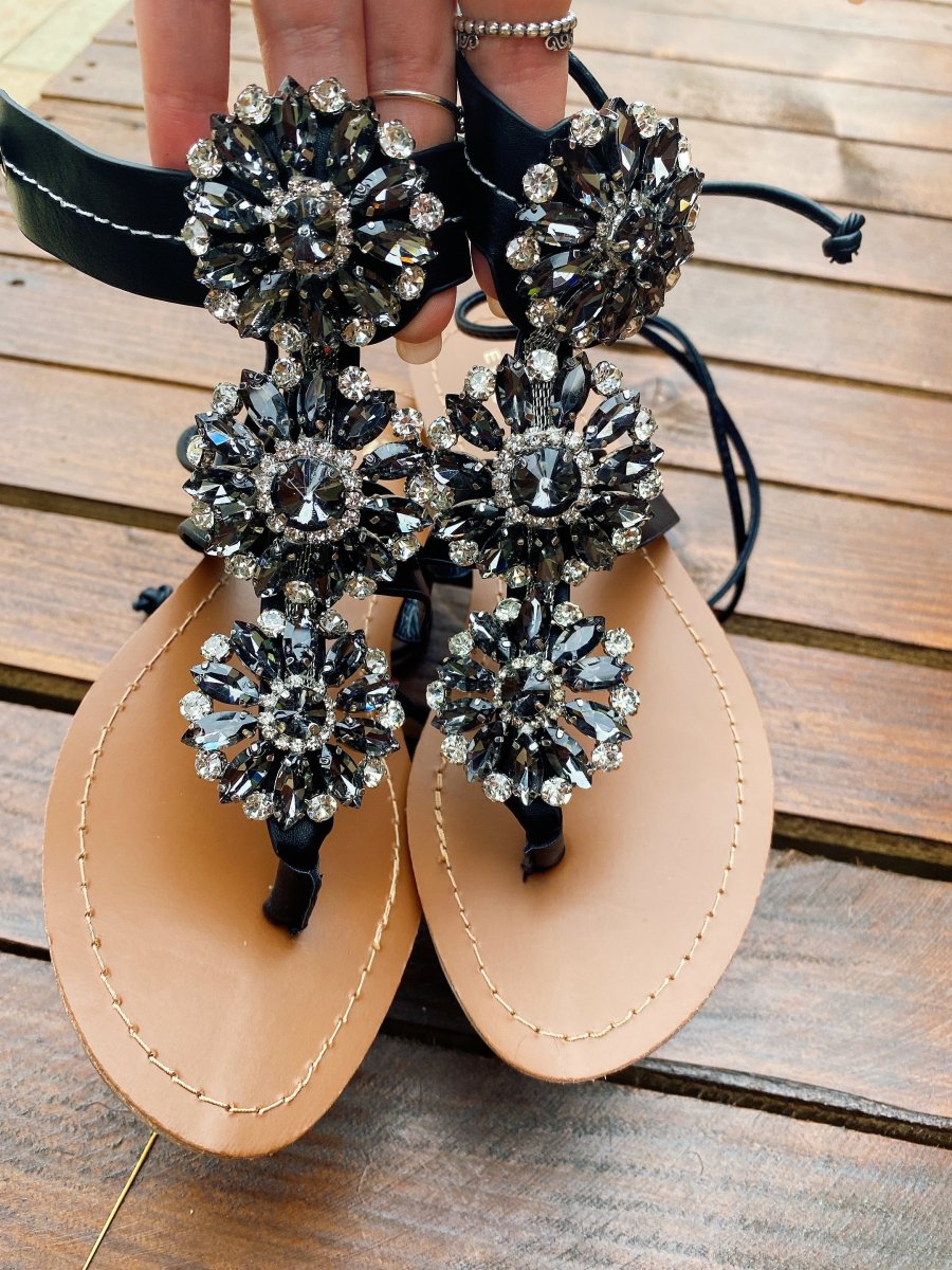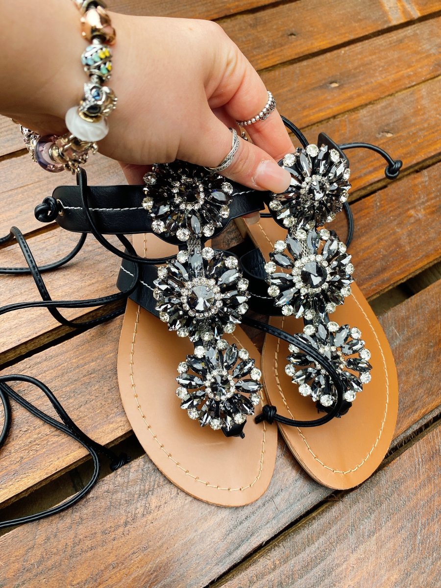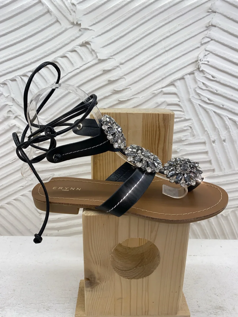 Infradito Con strass grandi nere con lacci alla caviglia, molto comode, estive.