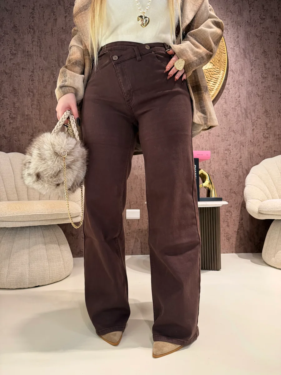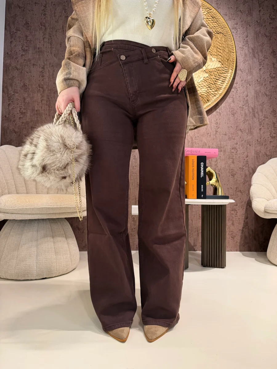 Jeans a vita alta con chiusura asimmetrica, il dettaglio di tendenza che slancia la figura e dona un effetto snellente immediato 🤎