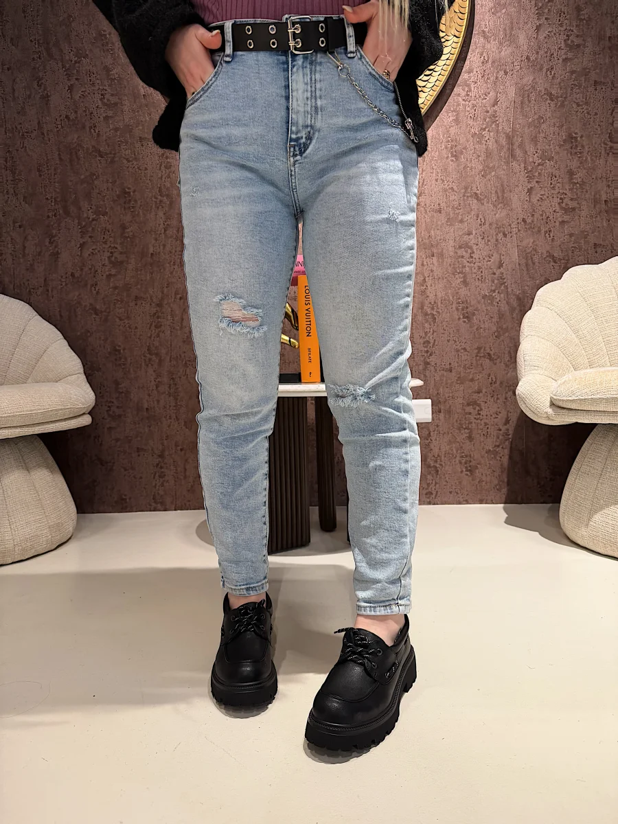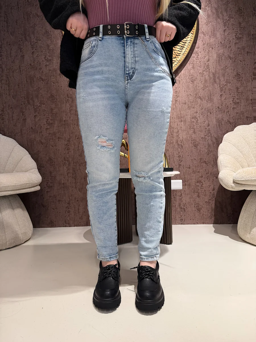“I jeans aderenti con cintura e catenina in denim chiaro sono la scelta perfetta per uno stile moderno e di tendenza. Grazie alla cintura e alla catenina, questi jeans aggiungono un tocco di eleganza al tuo look. Inoltre, il denim resistente e gli strappi conferiscono un tocco di grinta e personalità. Non solo comodi, ma anche alla moda!”
