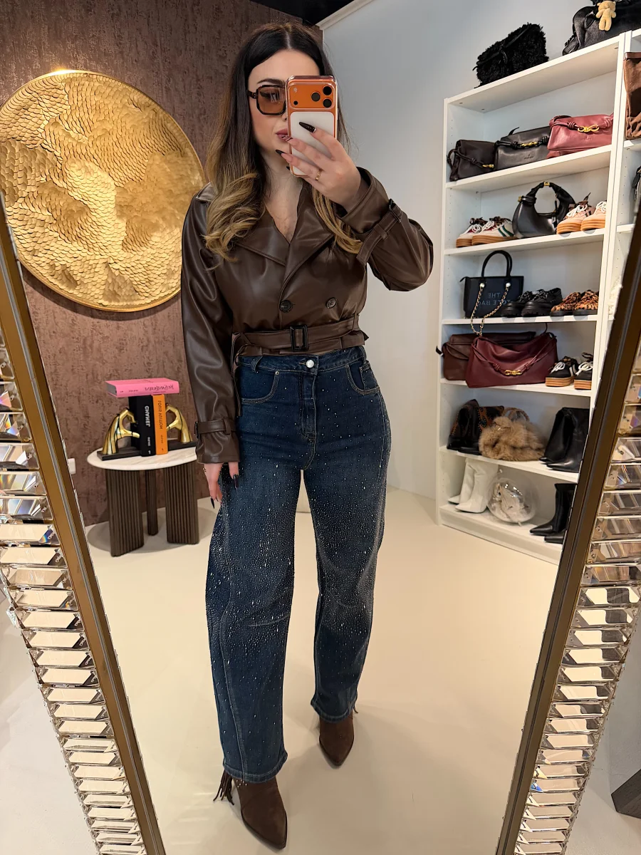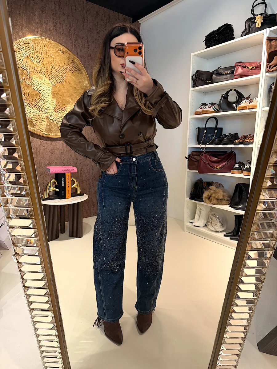 Un capo che unisce comfort e glamour, perfetto per distinguersi. Questi jeans a gamba larga presentano un design moderno con sul fondo e una cascata di strass luminosi che catturano la luce ad ogni movimento.