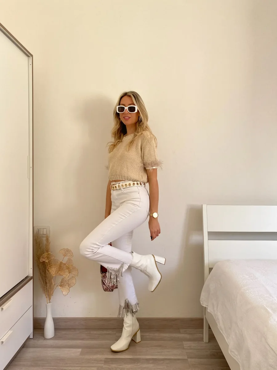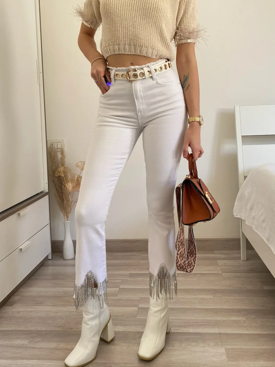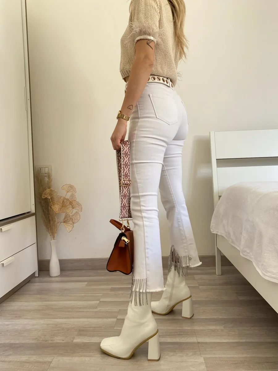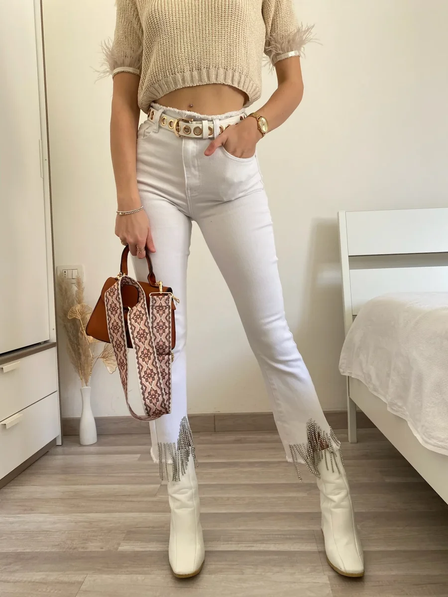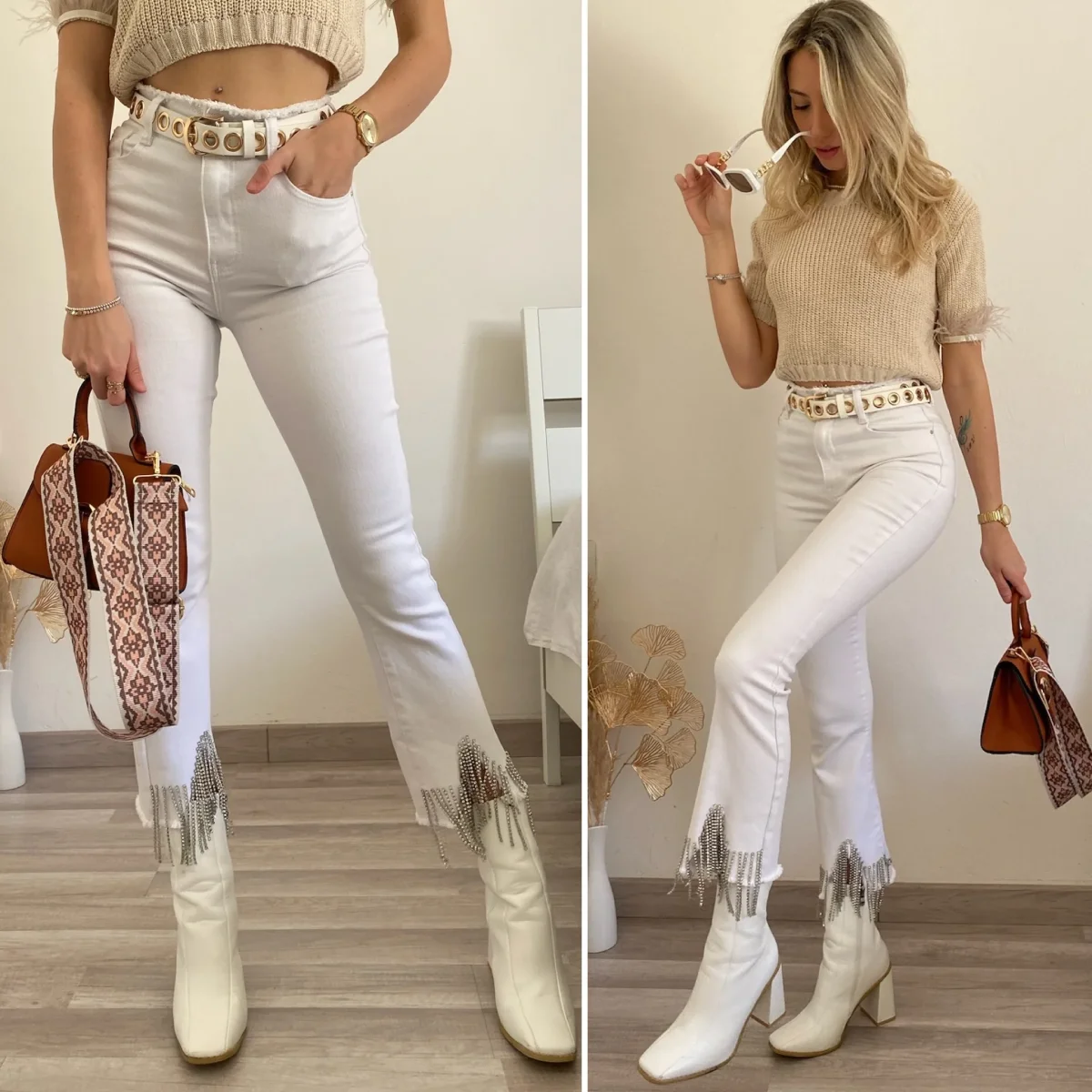 Jeans bianco molto aderente con effetto push up frange argento sul fondo.
