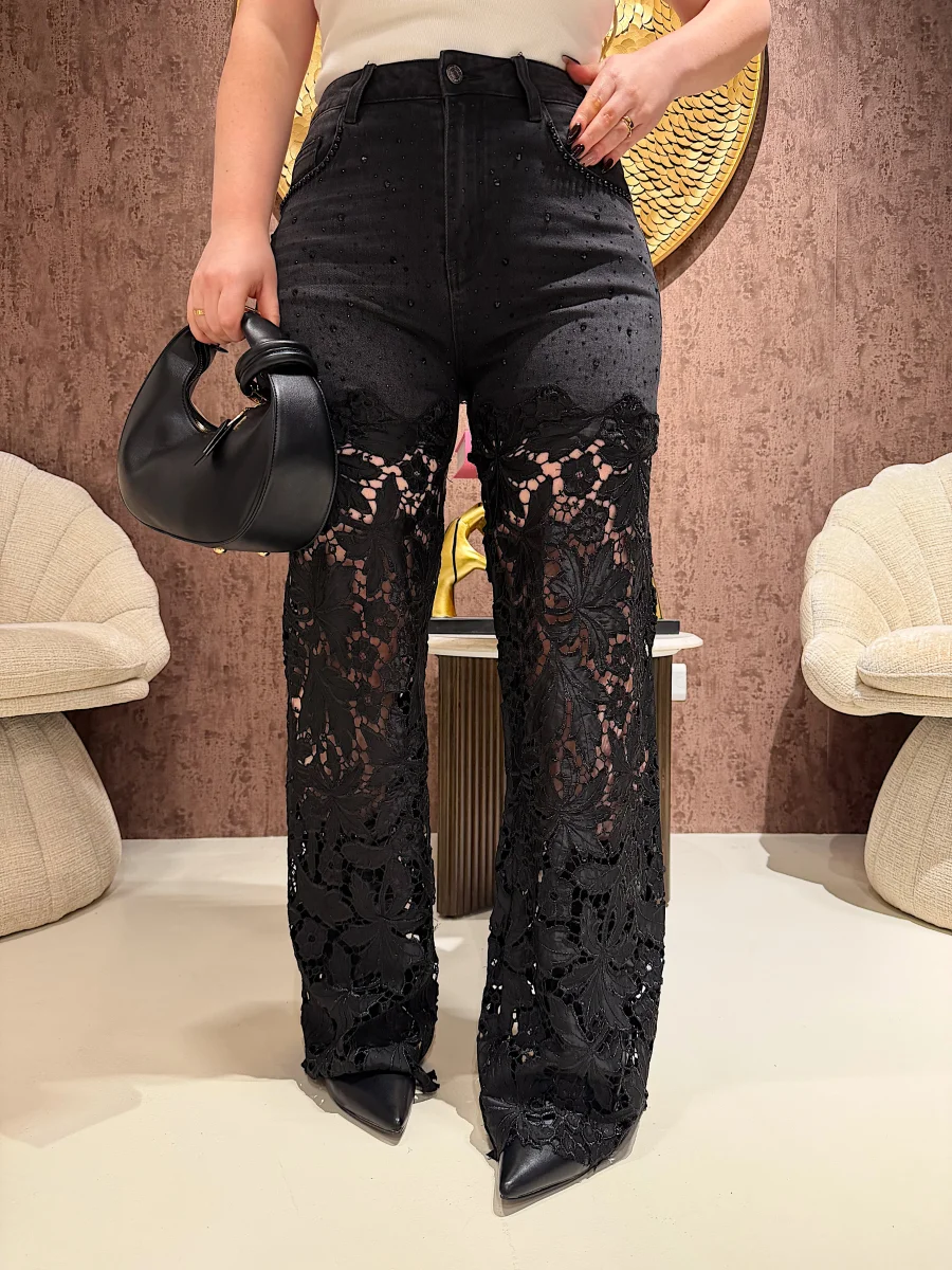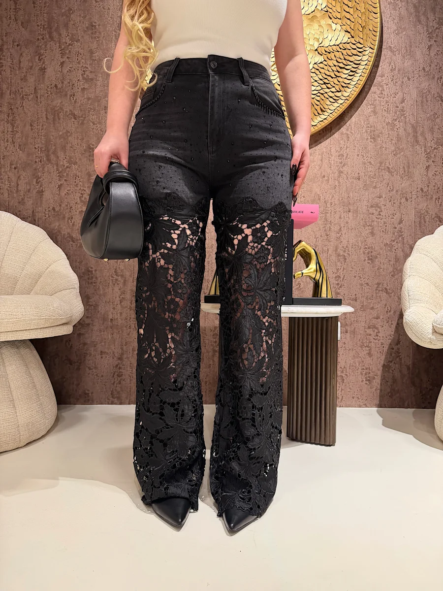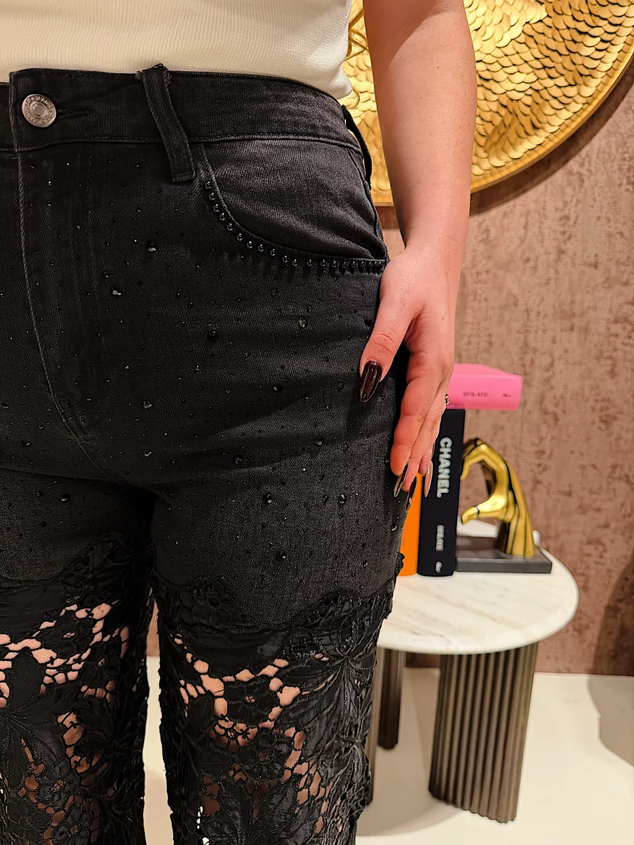 Jeans nero dal design ultra femminile, impreziosito da micro strass luminosi su tutta la parte superiore e da uno spettacolare inserto in pizzo trasparente lungo la gamba, che crea un raffinato effetto vedo-non-vedo.