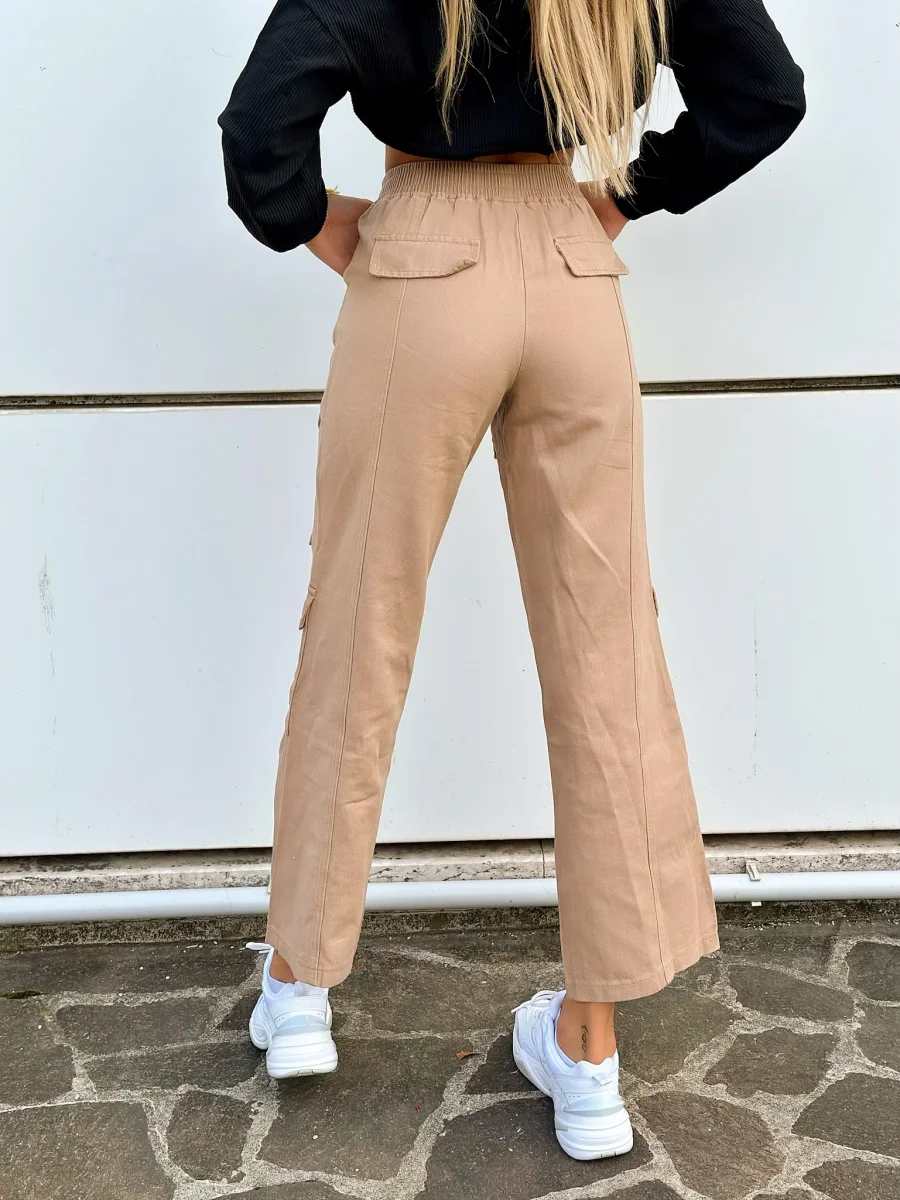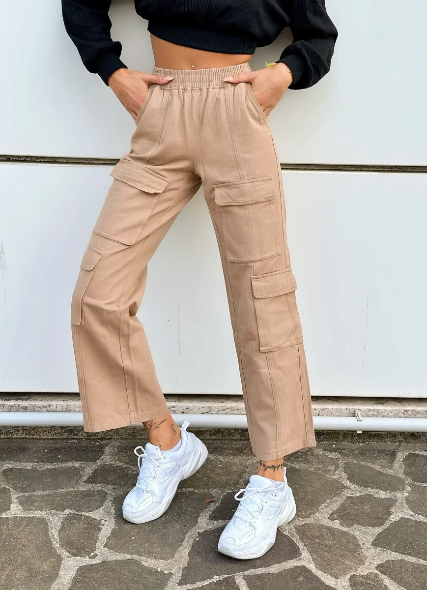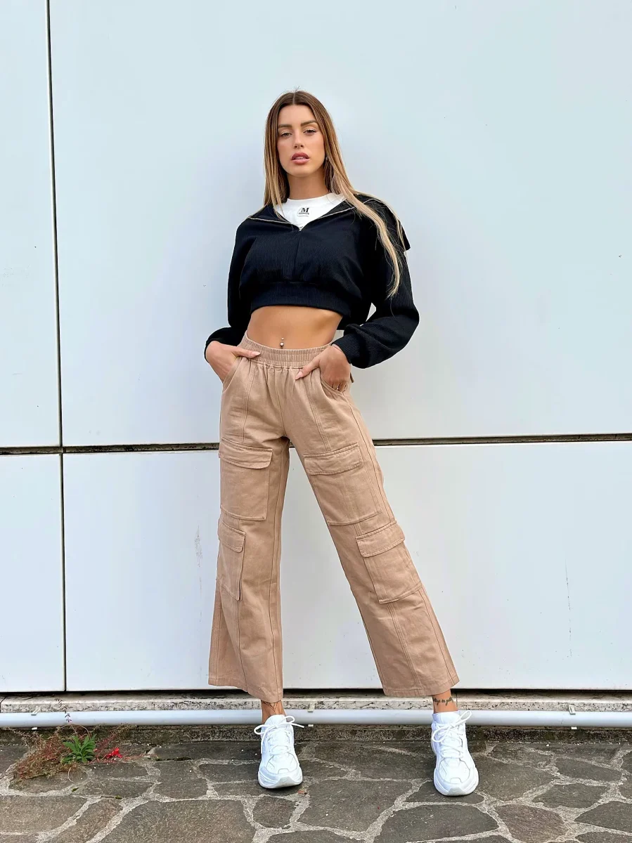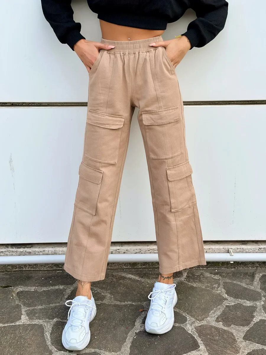 Jeans cargo con elastico in vita e maxi tasche, trend della winter Collection. Modello comodo e gamba ampia