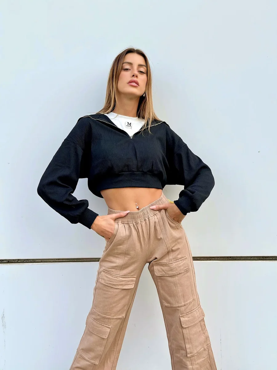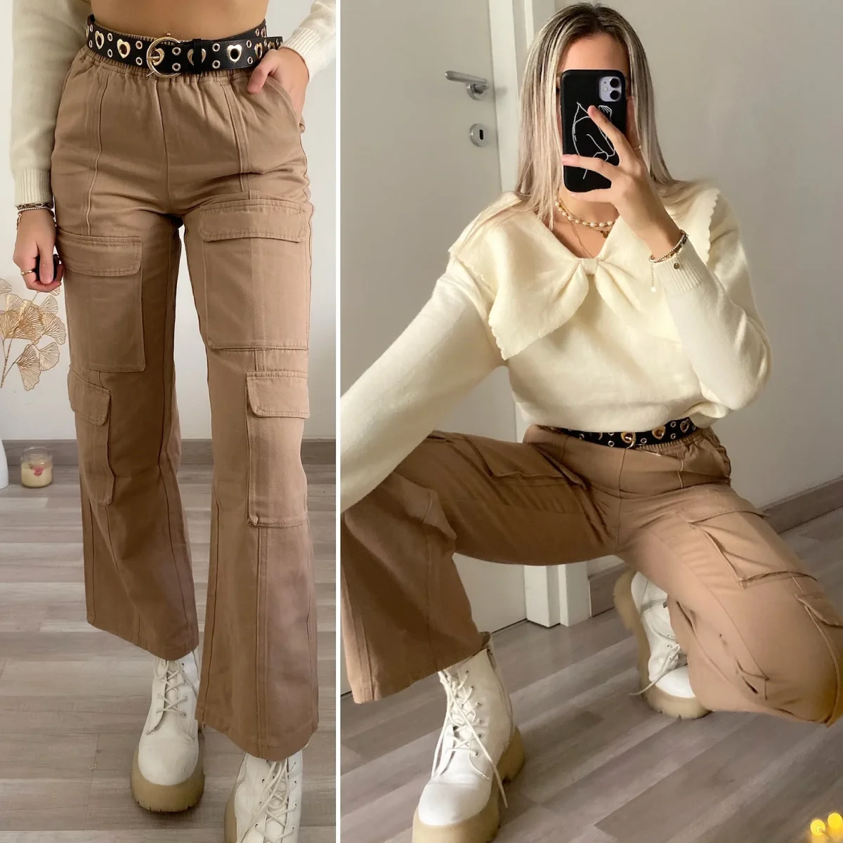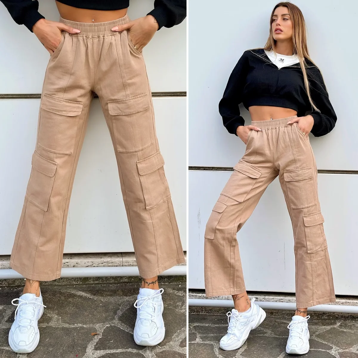 Jeans cargo con elastico in vita e maxi tasche, trend della winter Collection. Modello comodo e gamba ampia
