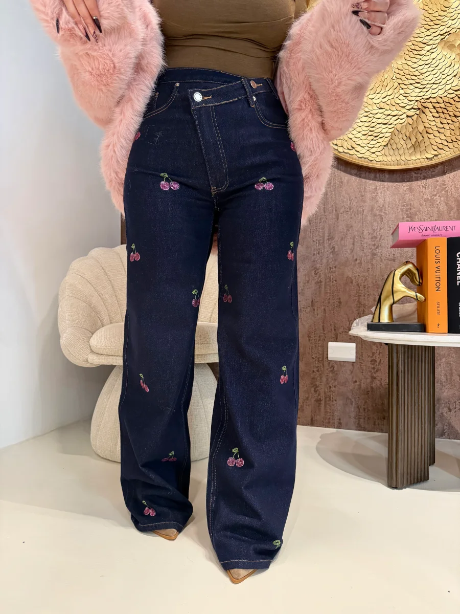 Dai un tocco fresco e giocoso al tuo look con questo jeans blu a gamba larga, decorato da ricami colorati di ciliegie distribuiti su tutta la lunghezza. Realizzato in denim resistente, unisce stile e comfort con la sua vestibilità relaxed. Perfetto per creare outfit originali e di tendenza, da abbinare con top semplici o camicie per far risaltare i dettagli fruttati.