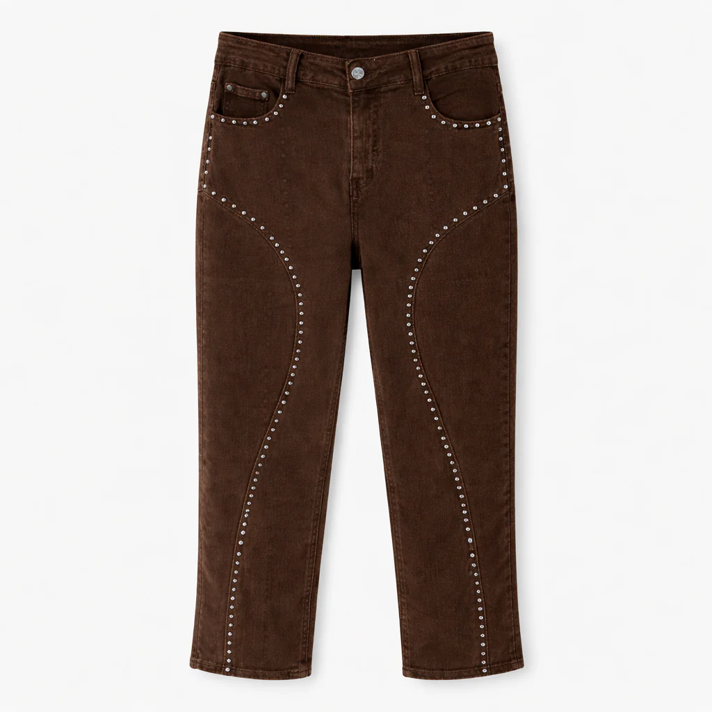 Jeans da donna dal taglio slim, realizzato in denim elasticizzato color marrone con applicazioni di borchiette gioiello lungo le linee frontali.