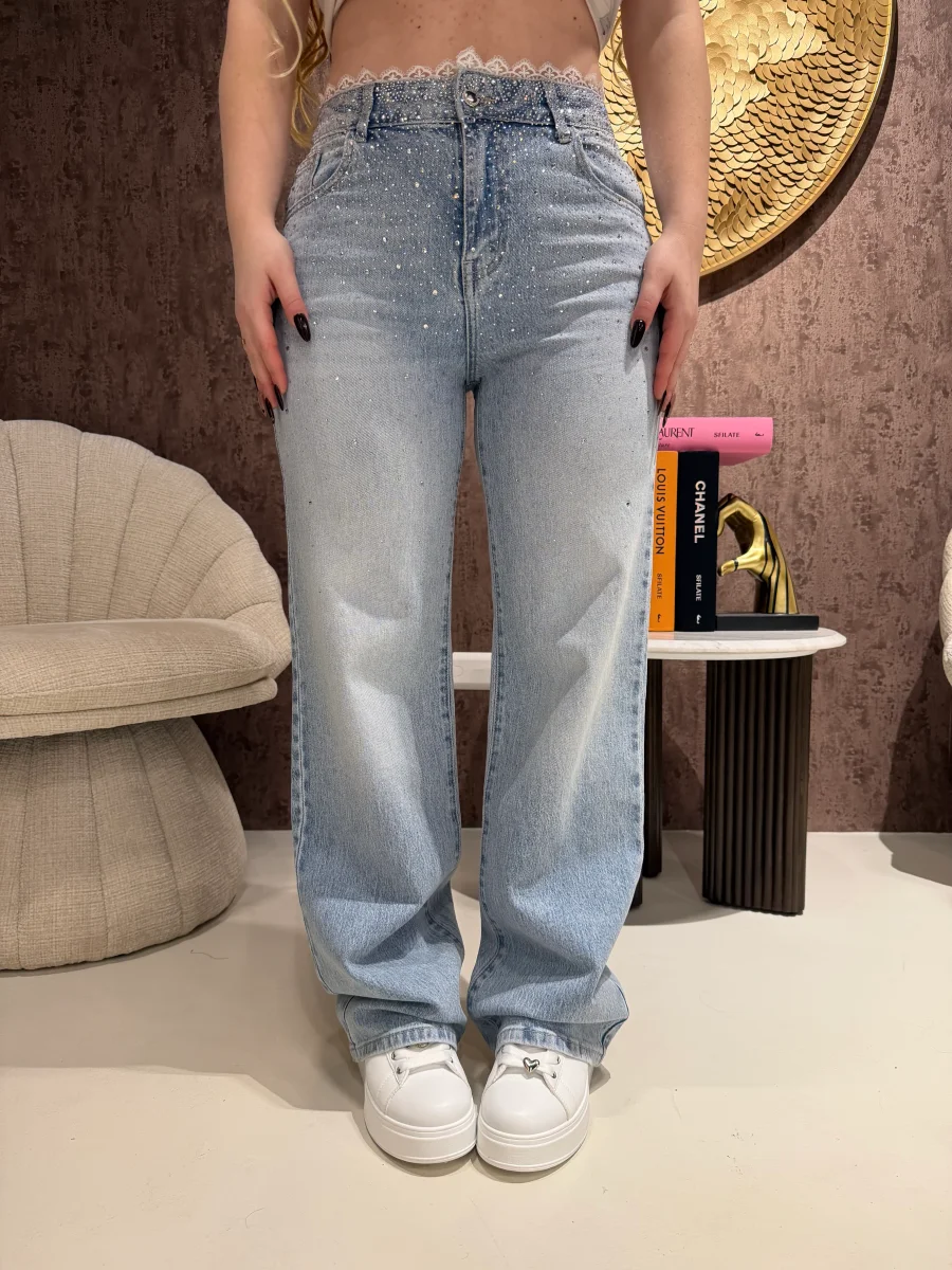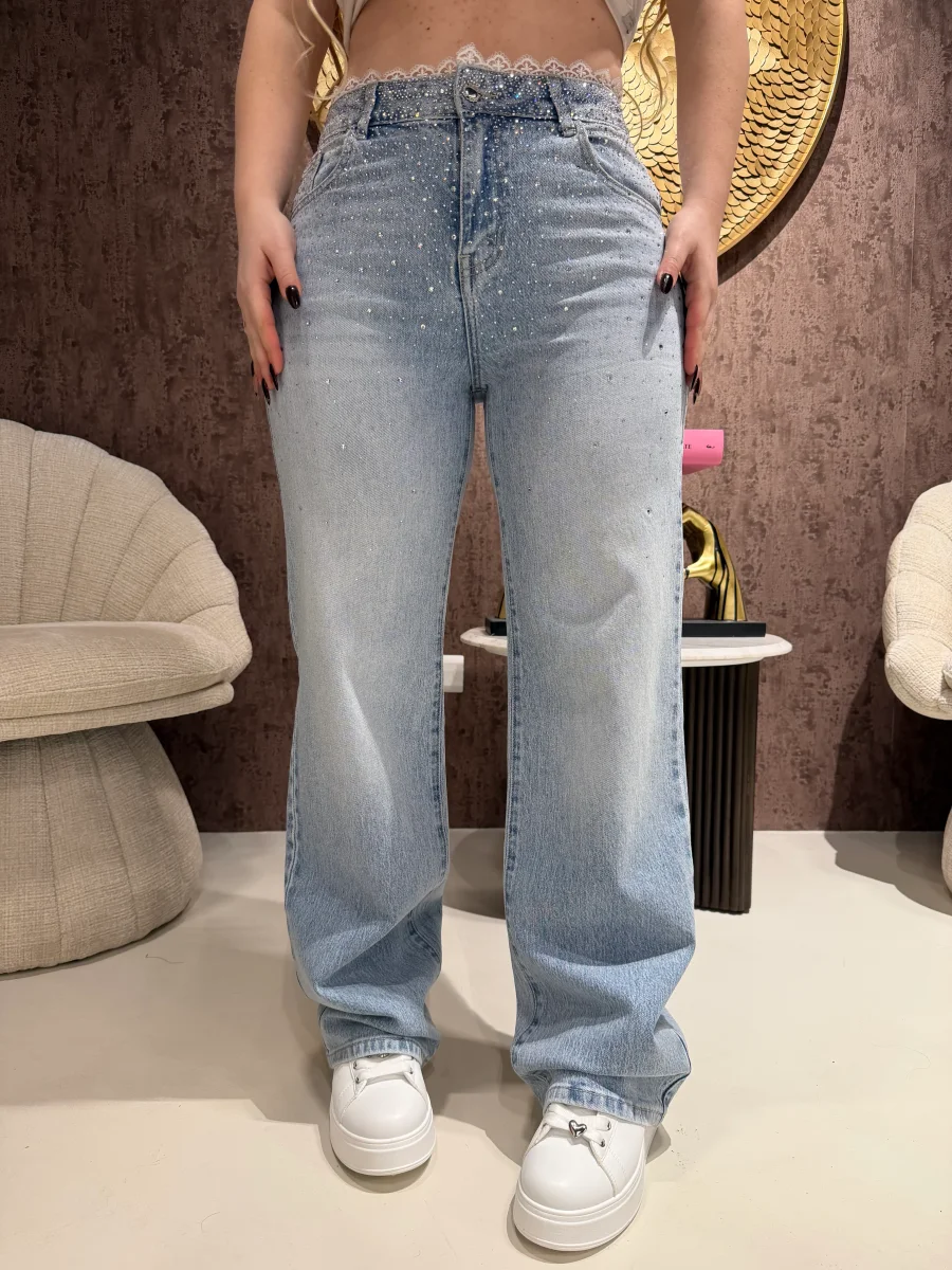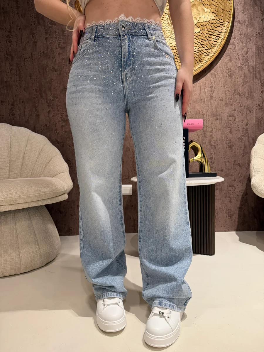 Questi jeans presentano un design distintivo con brillantini e dettagli in pizzo, offrendo una combinazione di stile e eleganza. I brillantini aggiungono un tocco di luminosità, mentre il pizzo conferisce una texture raffinata, ideale per occasioni in cui è richiesta una presentazione curata.