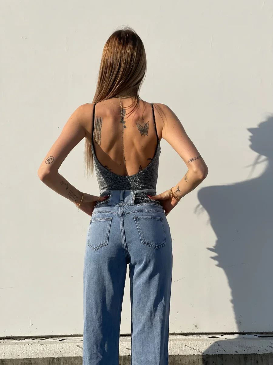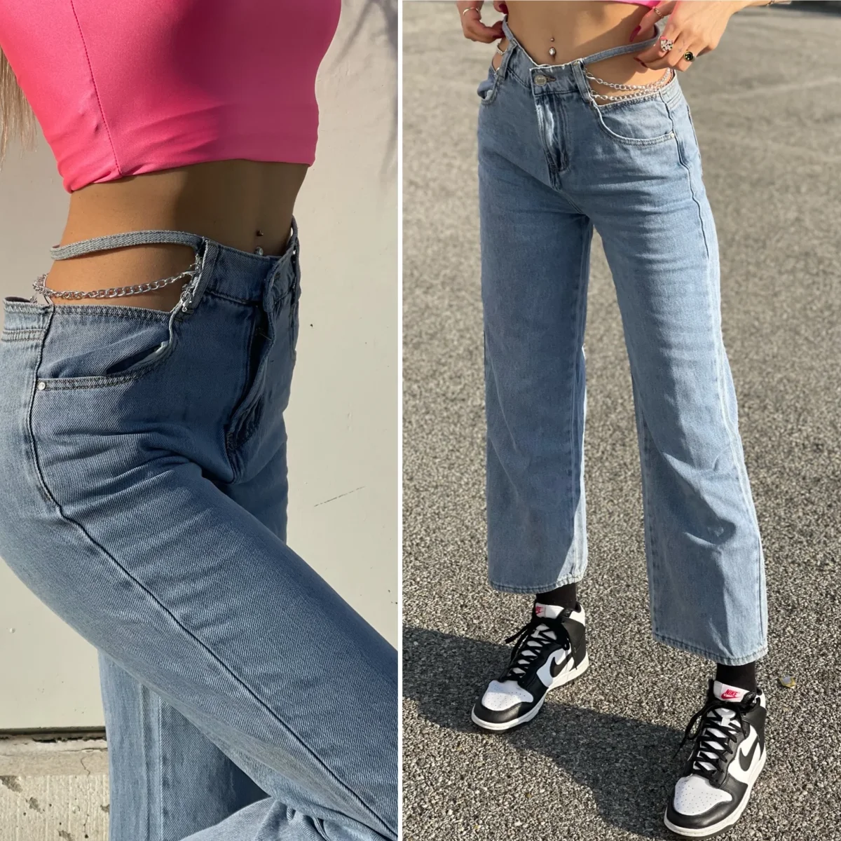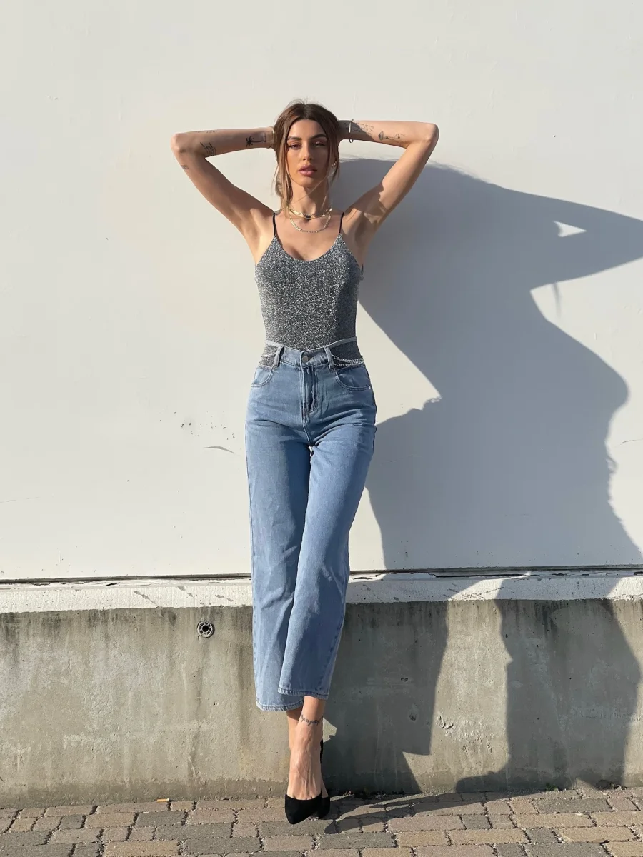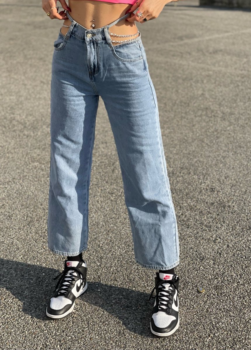 Jeans wide leg a vita alta con catene sottili argento.