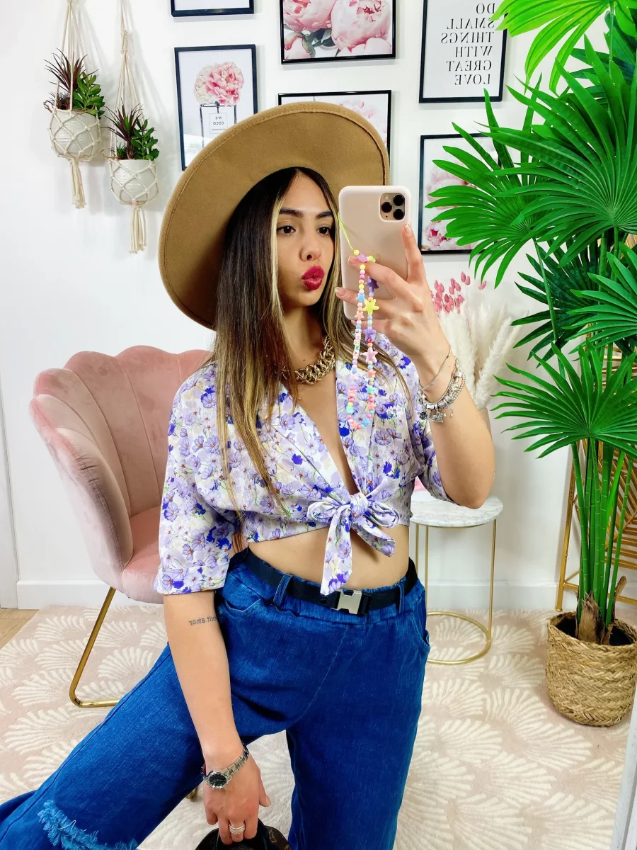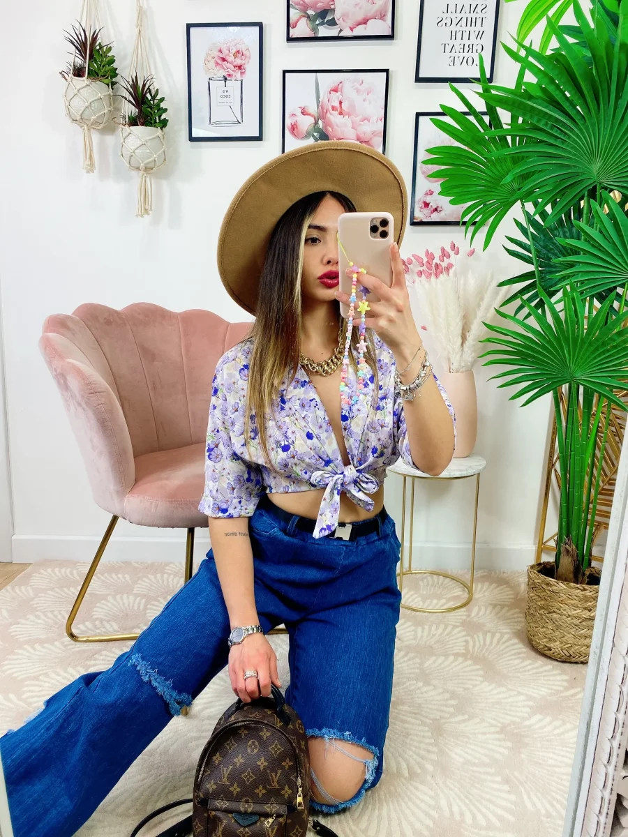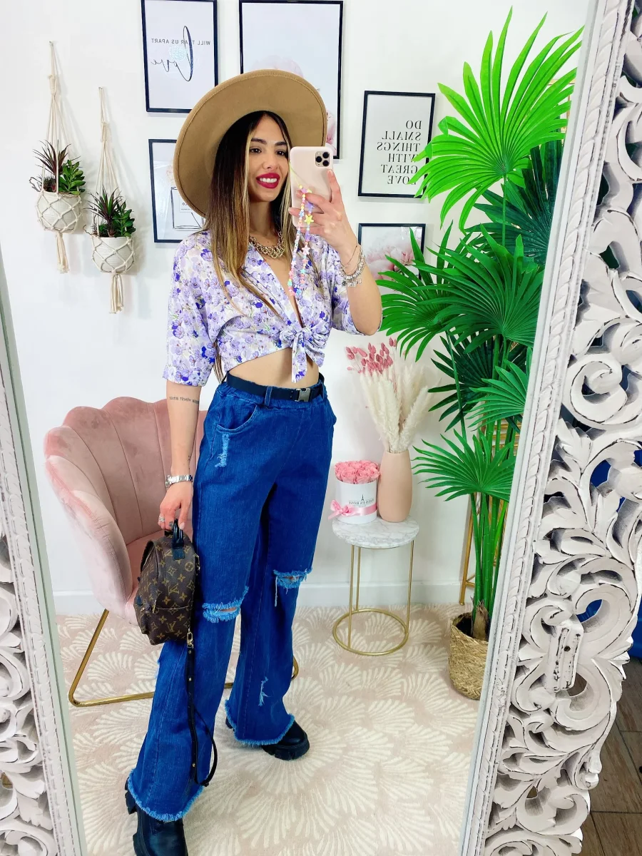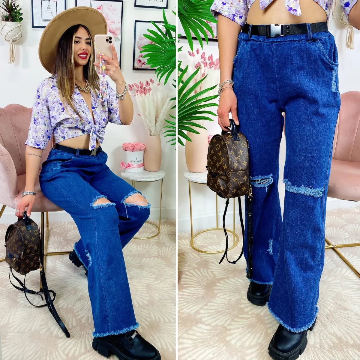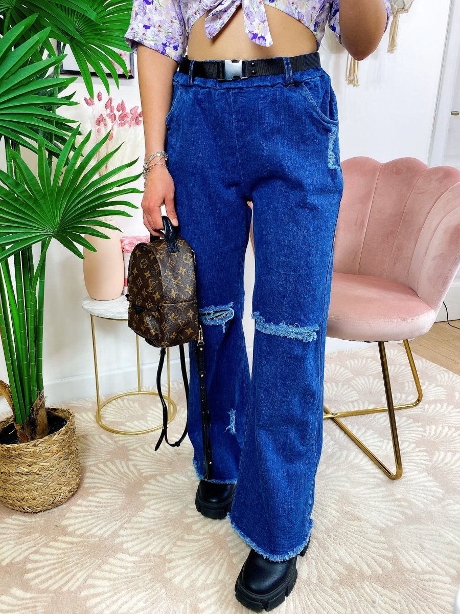 Jeans con cintura e strappi bagno medio scuro zampa larga, Leggermente sfrangiato sotto.