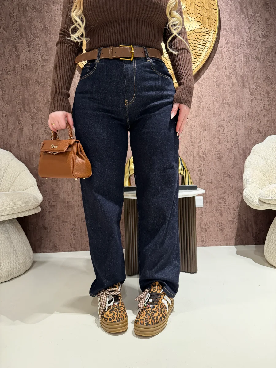 Jeans in denim scuro dal design pulito e intramontabile, caratterizzati da gamba dritta e cintura coordinata che valorizza il punto vita con un tocco elegante.