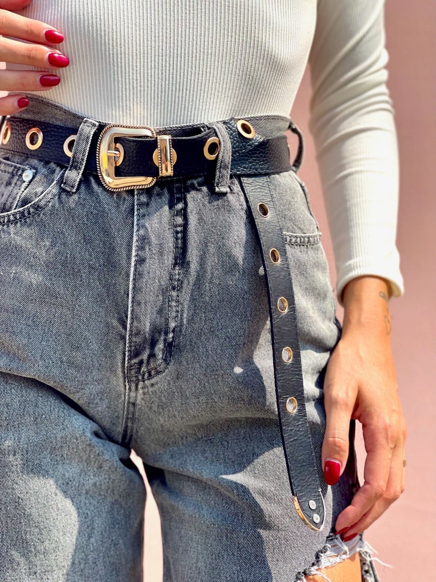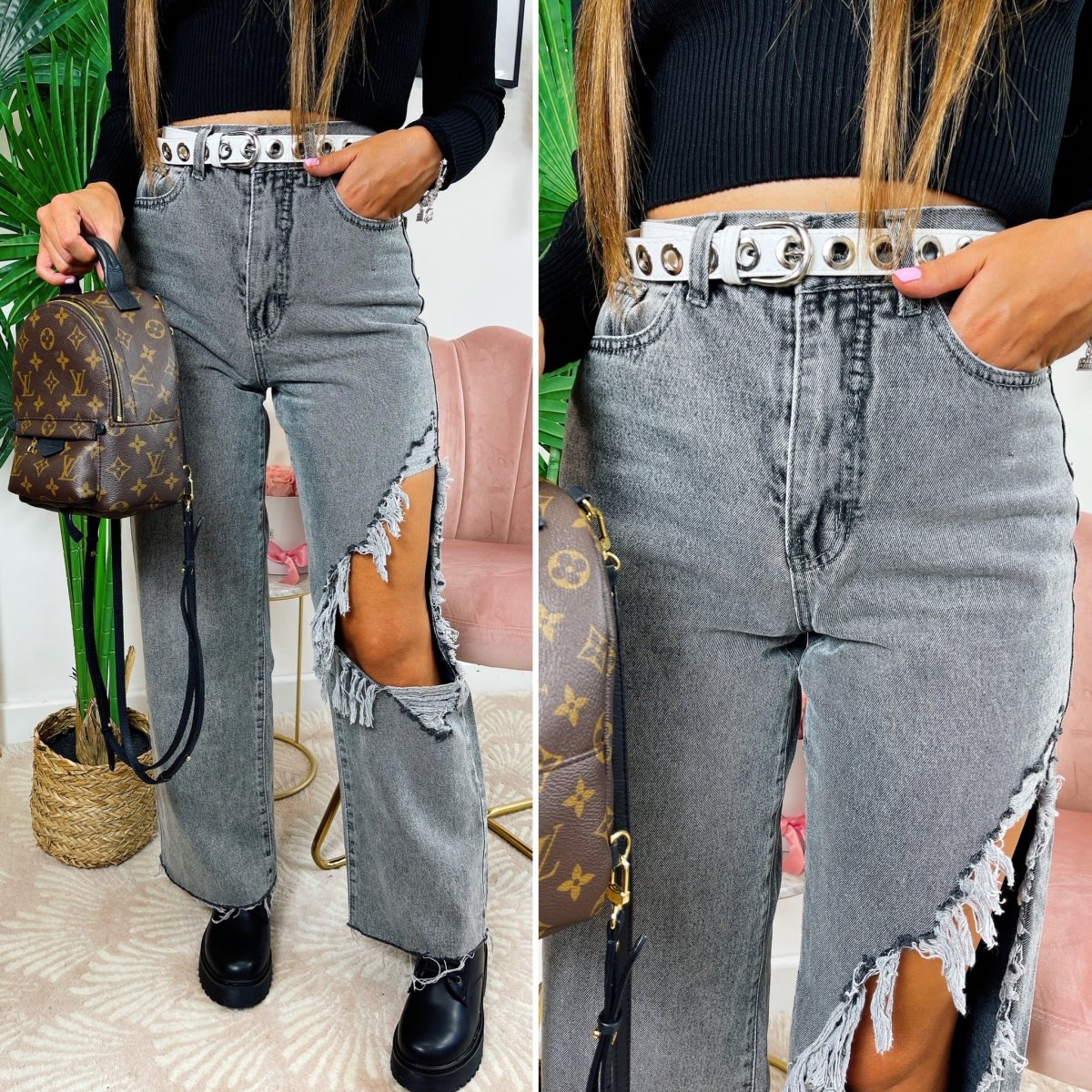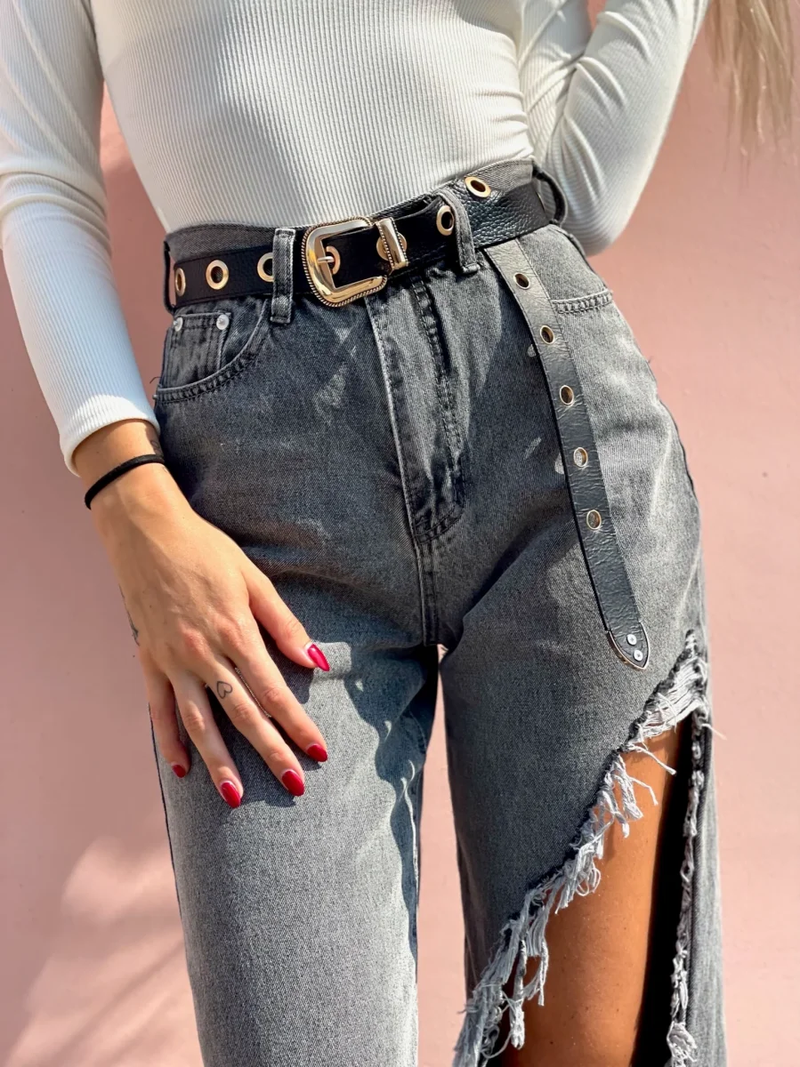 Jeans dalla vestibilità regolare, gamba larga e morbida con maxi spacco. Sfrangiato nel sotto.
