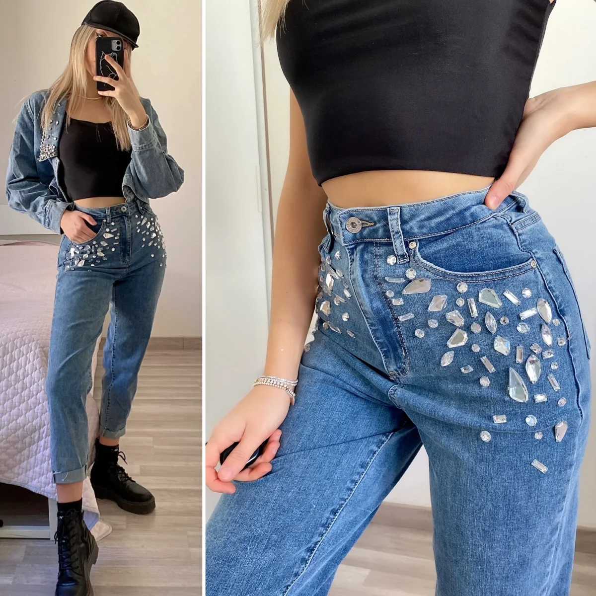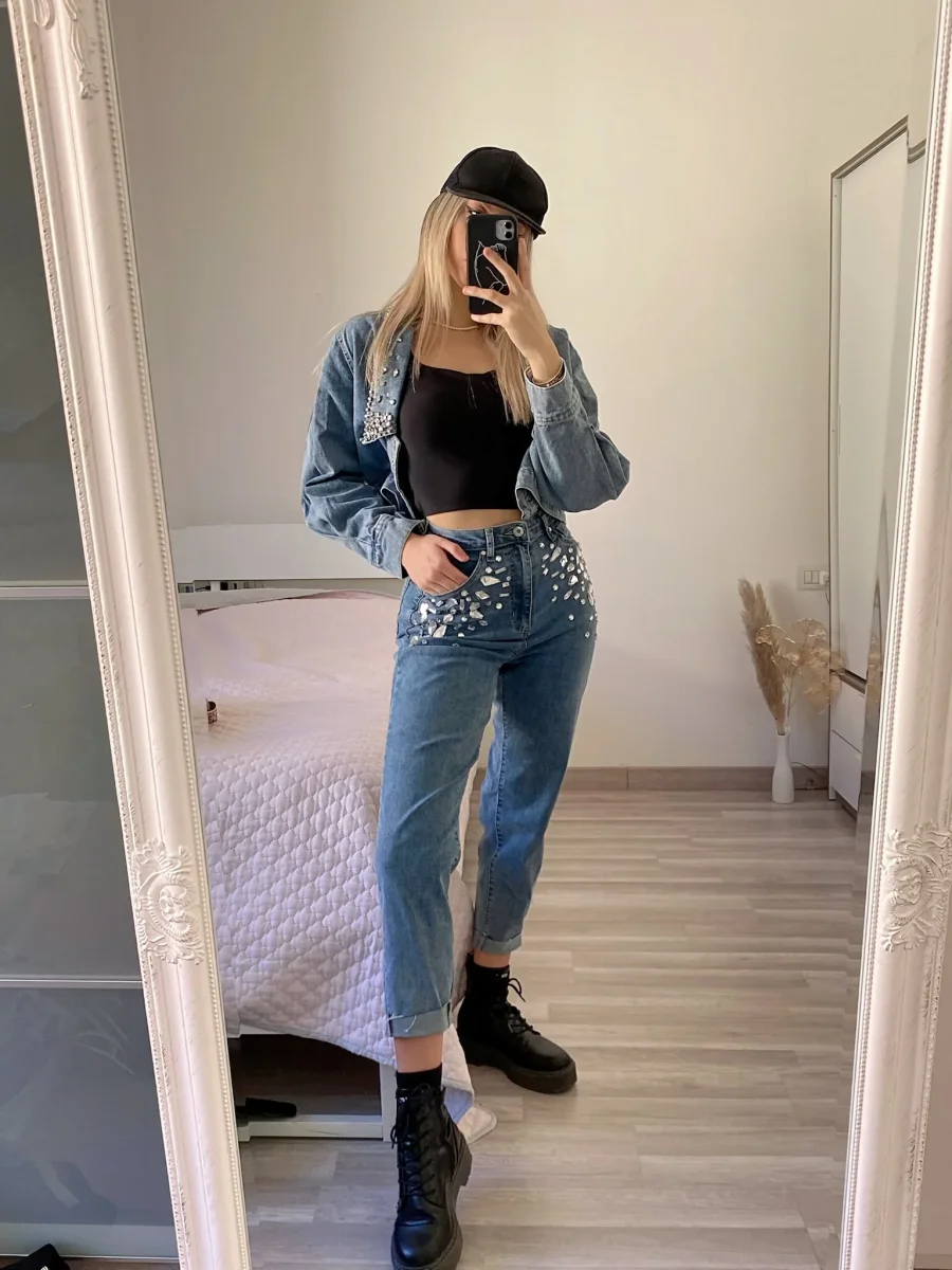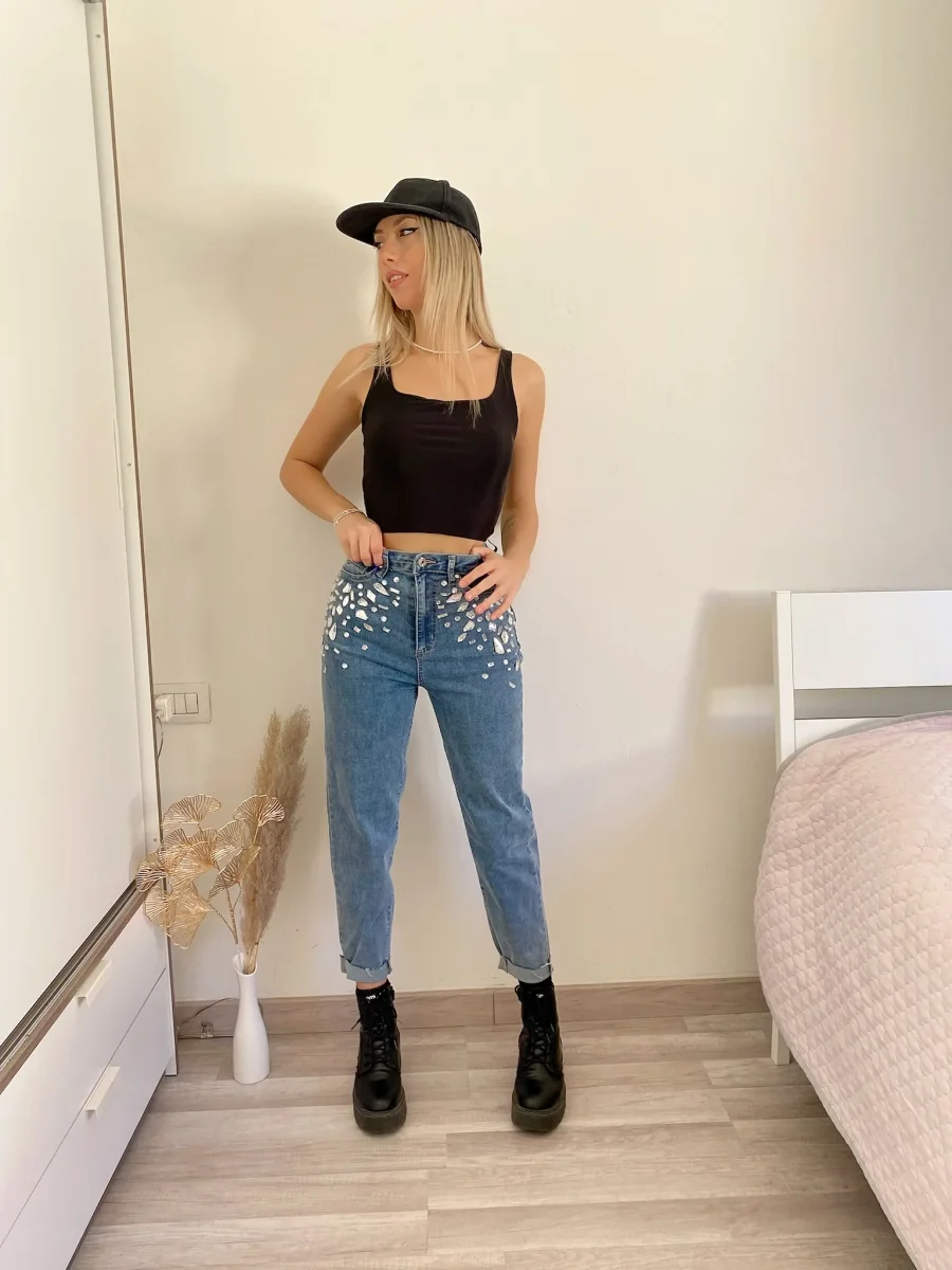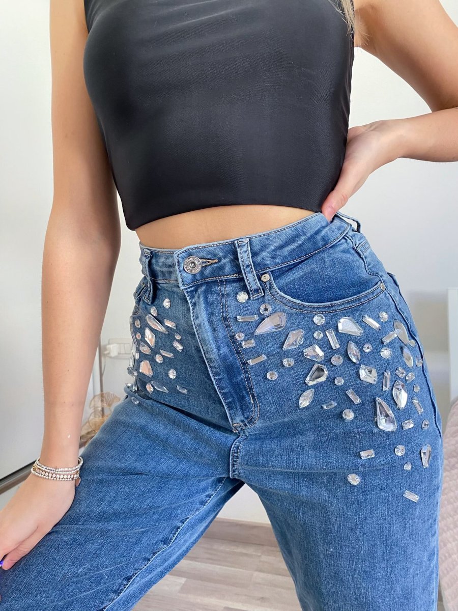 Jeans elasticizzato con gamba aderente, pietre cucite sul davanti