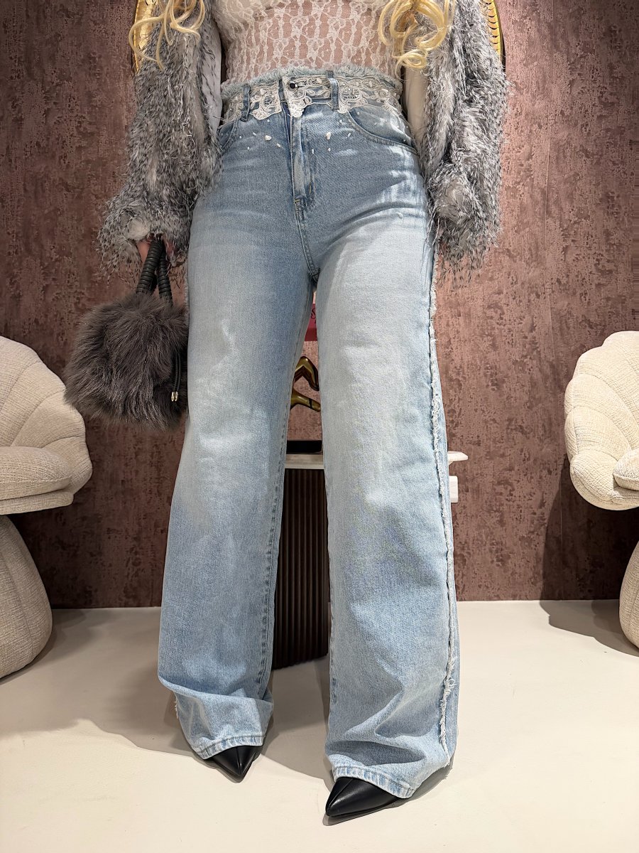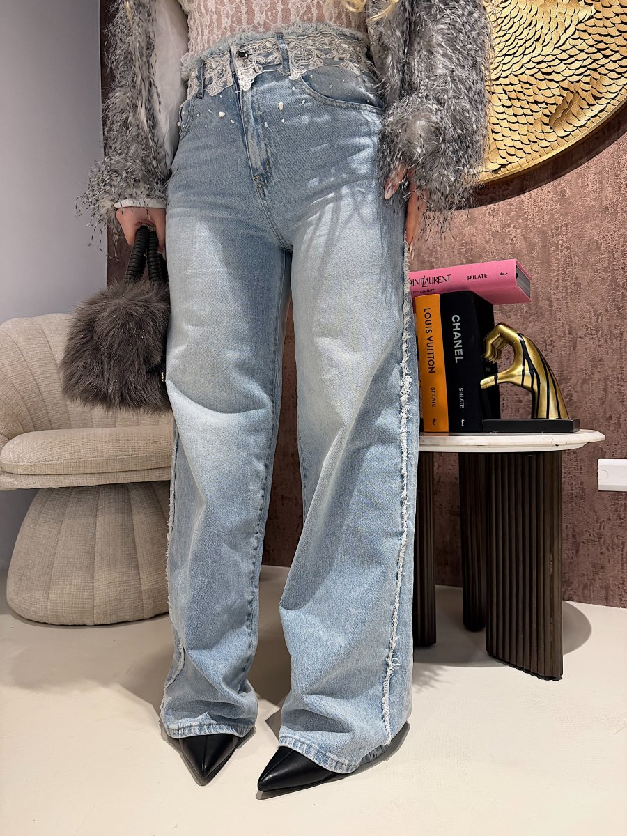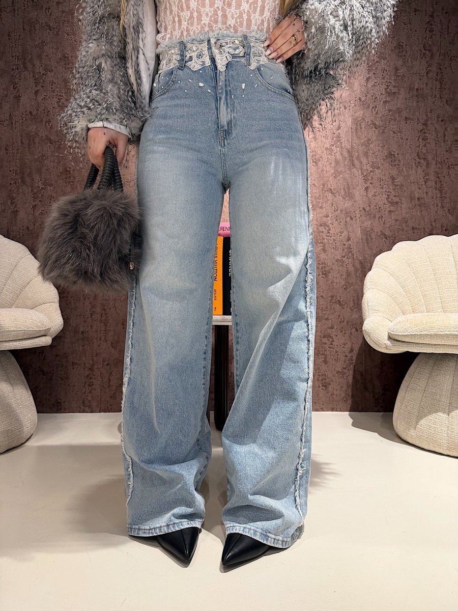 Il Jeans Lace Waist Blue Denim è impreziosito da dettagli in pizzo bianco sul punto vita e piccoli elementi decorativi effetto gioiello. Il lavaggio chiaro dona luminosità, mentre il taglio valorizza la silhouette in modo naturale.