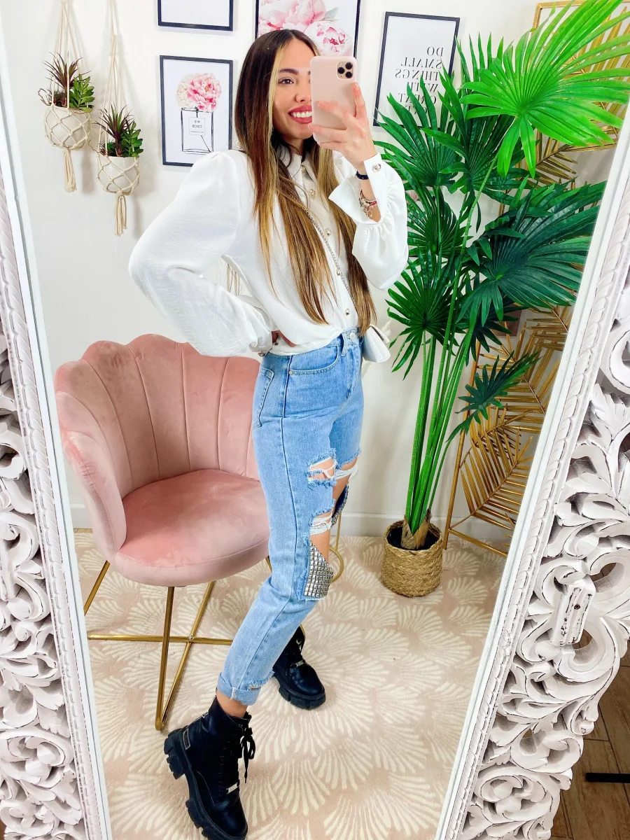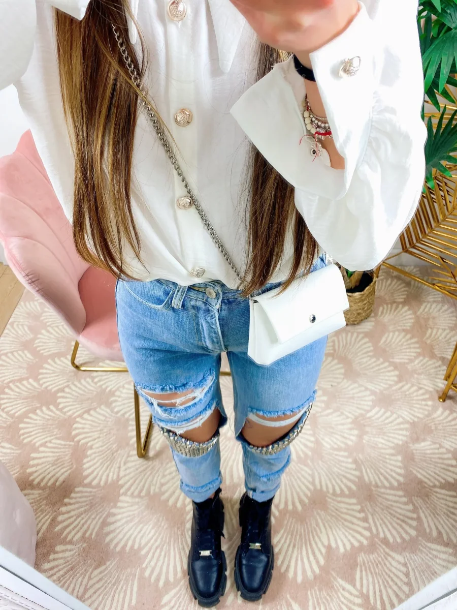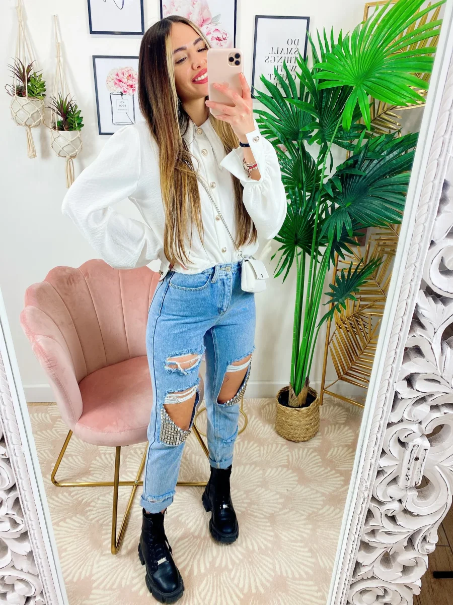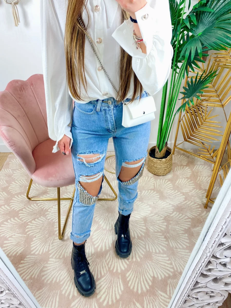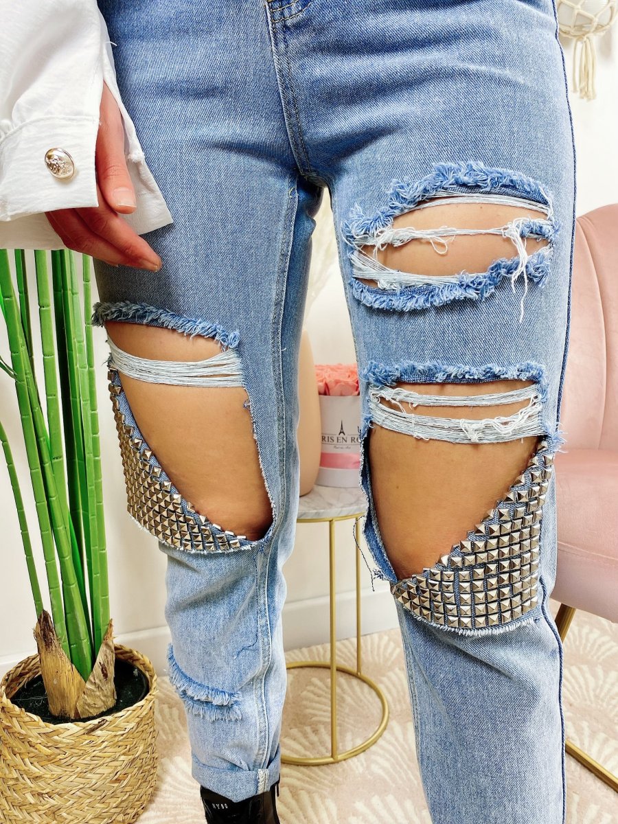 Jeans con strappi e borchie argento dal bagno chiaro calzata regolare.
