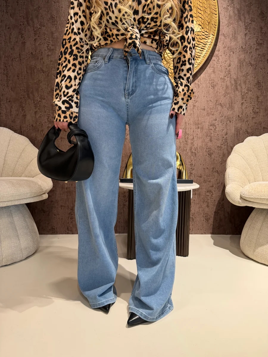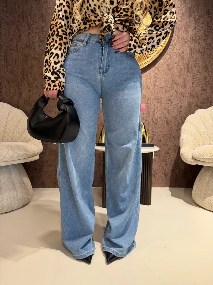 I Jeans Crystal Pocket sono realizzati in lavaggio azzurro chiaro e valorizzati da tasche posteriori interamente ricoperte di strass effetto animalier, che illuminano il look ad ogni movimento.