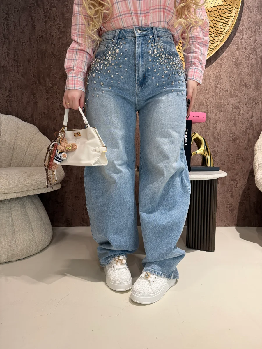 jeans perfetto per brillare ogni giorno ✨ Il Crystal Glow Wide Leg è un modello a gamba ampia super trendy, con applicazioni di strass e perline frontali che donano un effetto luminoso e glamour. La vita alta valorizza la silhouette e slancia la figura, mentre il fit morbido garantisce comfort e stile in ogni occasione.