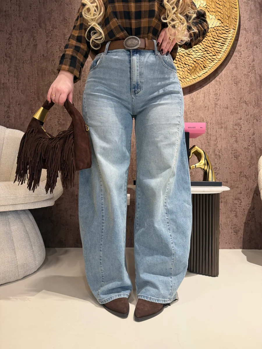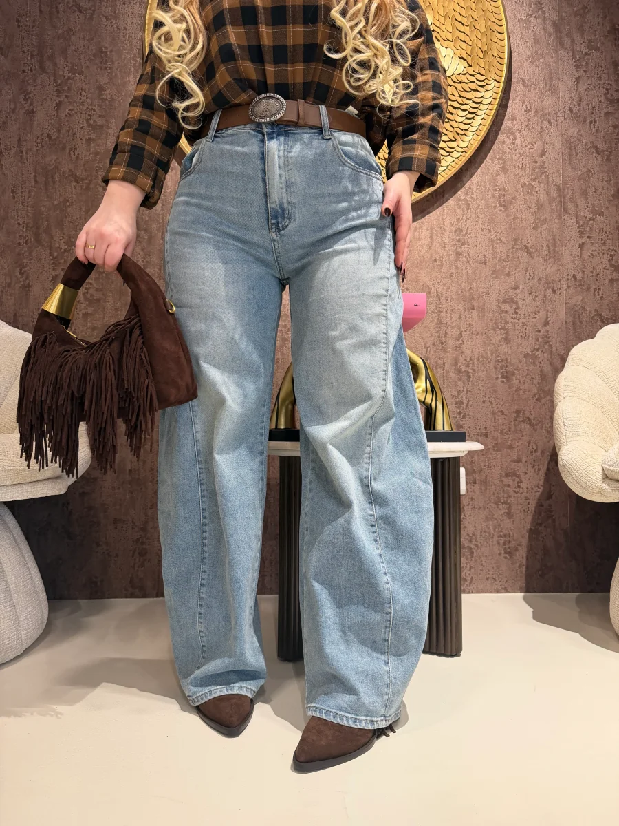 Jeans in denim lavaggio medio dal look vintage, caratterizzato da linea dritta e vestibilità regolare che valorizza la silhouette senza costringere. Modello a vita media con classiche cinque tasche e chiusura con zip e bottone. Completo di cintura marrone con fibbia decorativa inclusa, perfetta per dare un tocco western-chic al look. Un jeans versatile e intramontabile, ideale per outfit casual quotidiani o abbinamenti più ricercati.