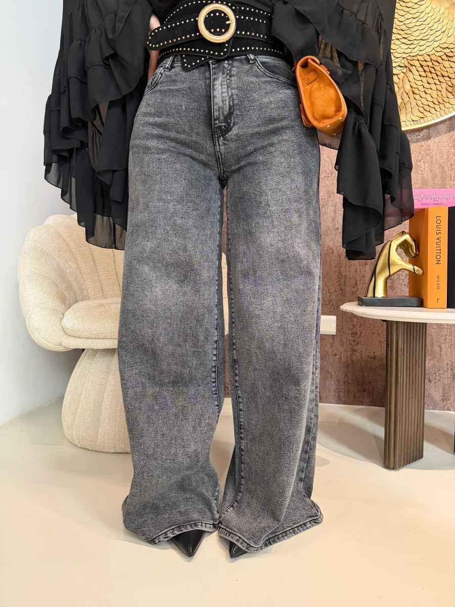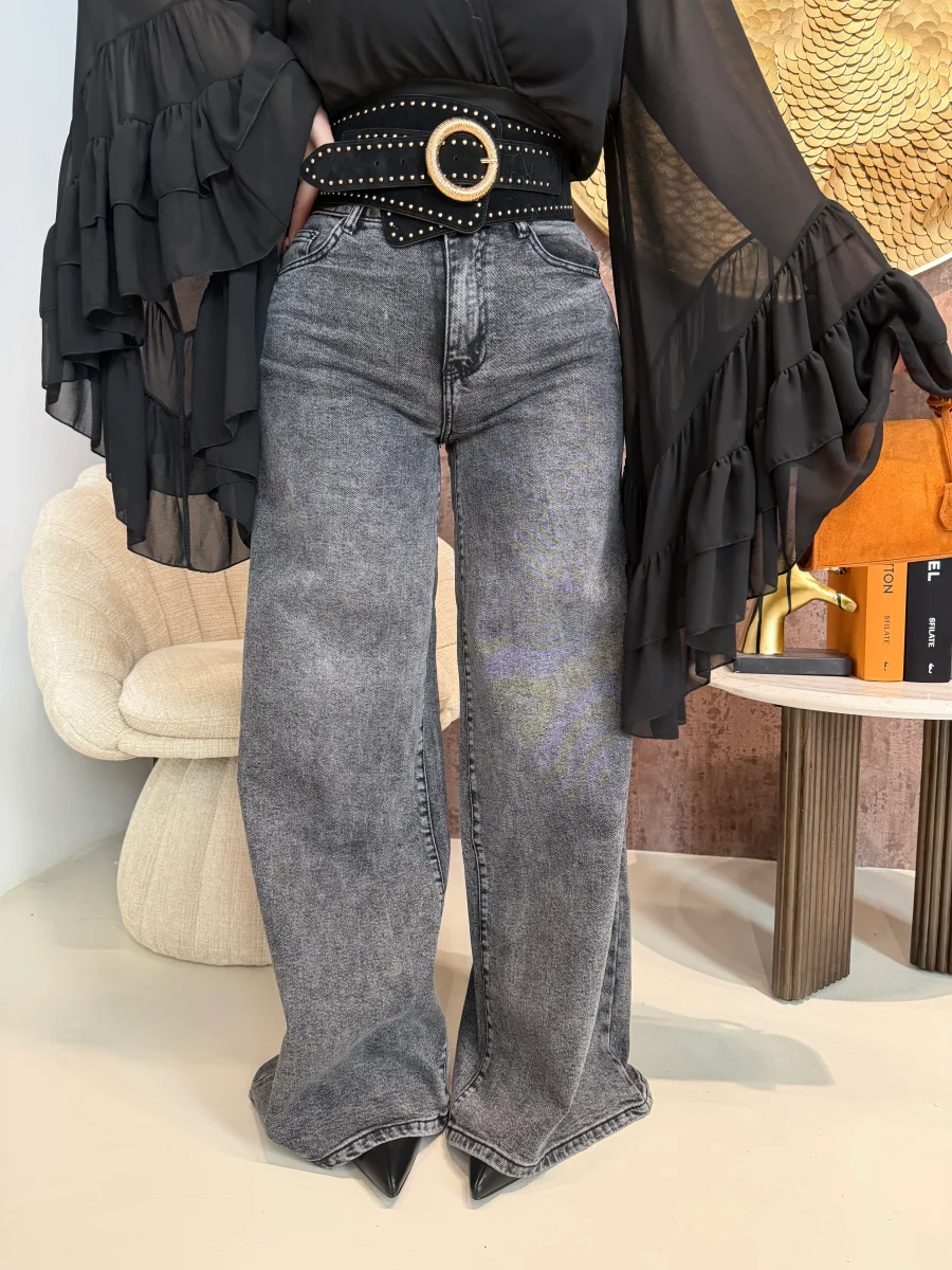 Jeans a vita alta realizzato in denim grigio effetto vintage, dal taglio a zampa larghissima che dona slancio e un tocco sofisticato a ogni look.
