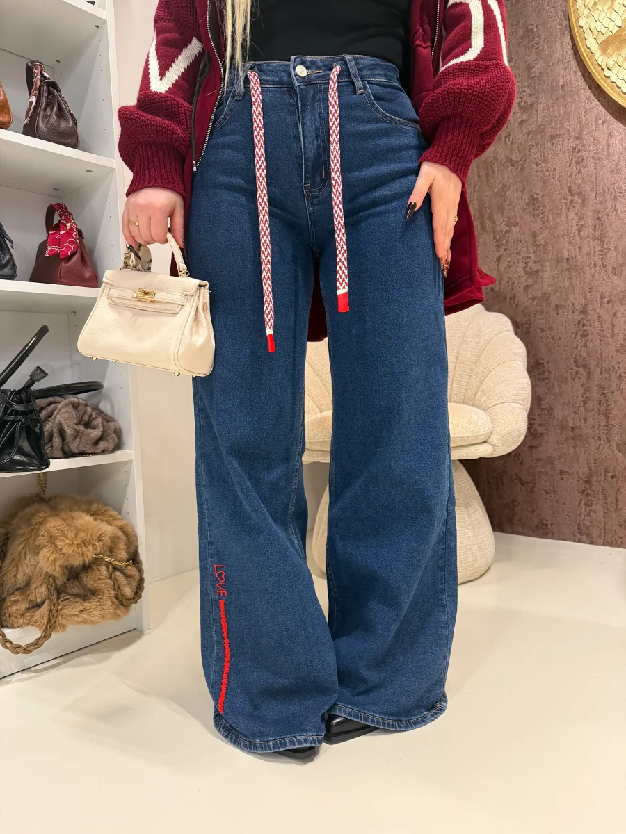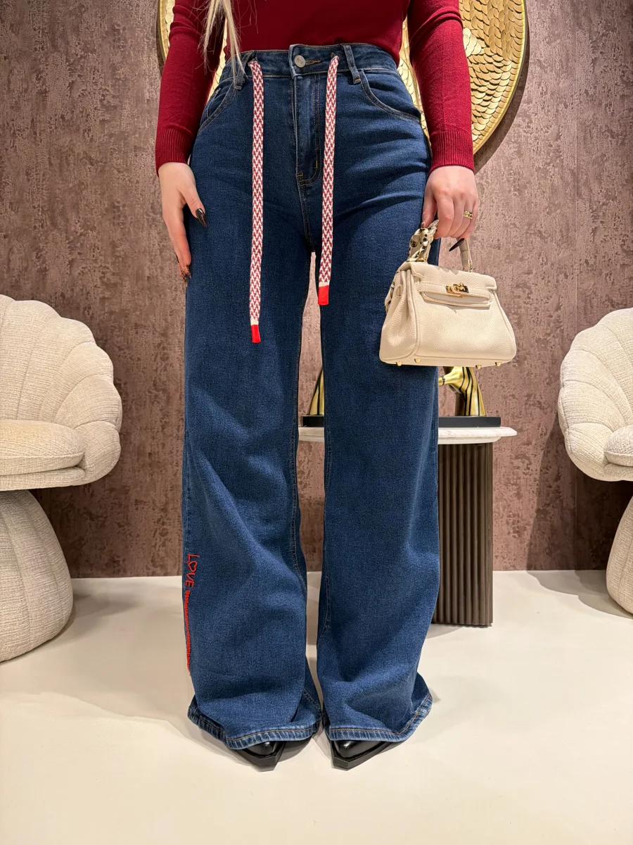 Con i nostri Jeans love con ricami, puoi esprimere il tuo amore per la moda e al tempo stesso godere di una vestibilità comoda e alla moda! I ricami rossi e la scritta sulla gamba a gamba larga conferiranno un tocco trendy e unico al tuo look. Non rinunciare al comfort senza compromettere il tuo stile.