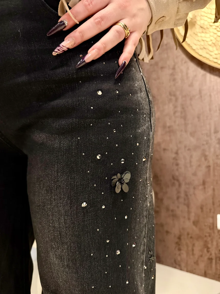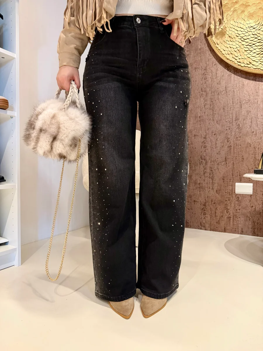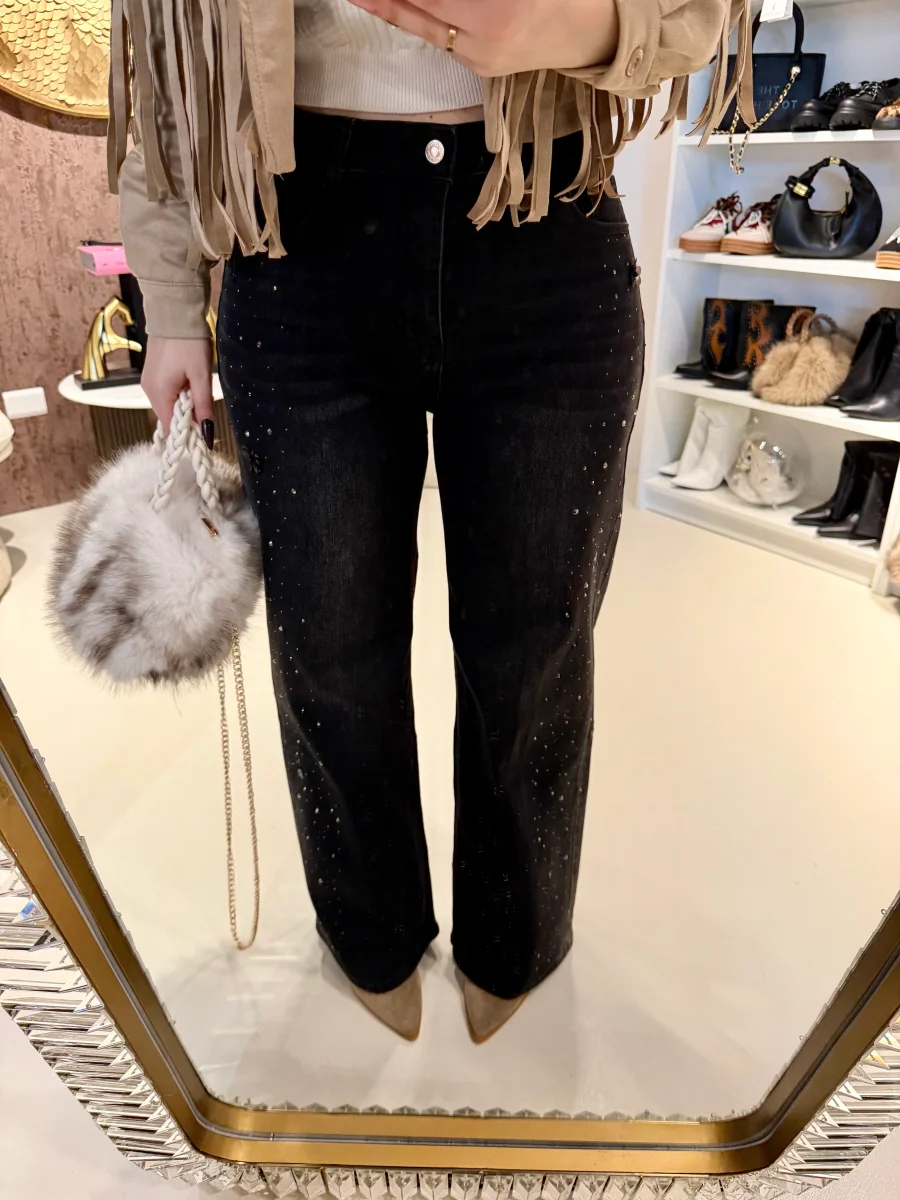 Rinnova il tuo guardaroba con questo jeans nero a gamba larga, caratterizzato da un design moderno e dettagli luminosi. Realizzato in denim morbido e resistente, presenta applicazioni di micro strass che creano un effetto scintillante ed elegante. La vestibilità relaxed e il taglio cropped lo rendono perfetto per look casual chic sia di giorno che di sera. Da abbinare a sneakers per un outfit urban o a tacchi per un tocco glam.