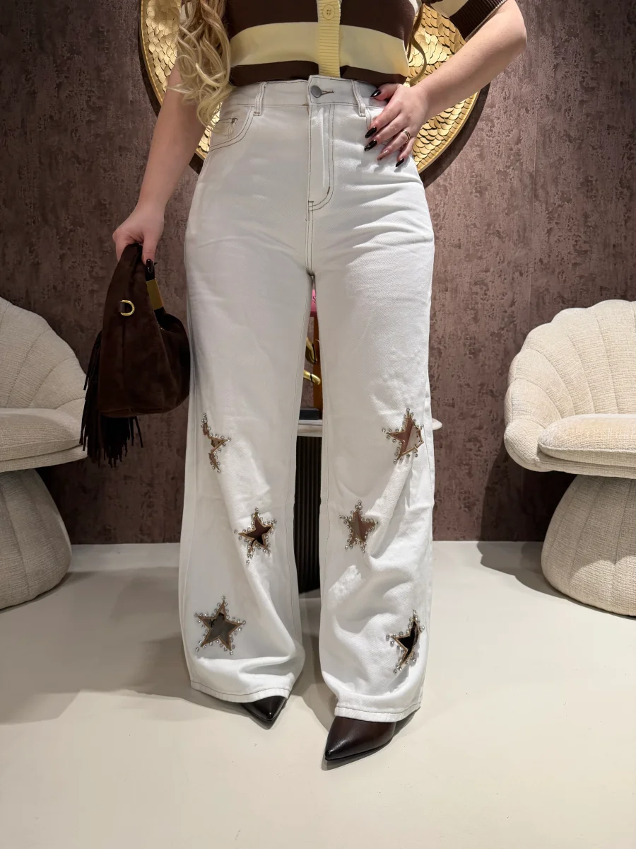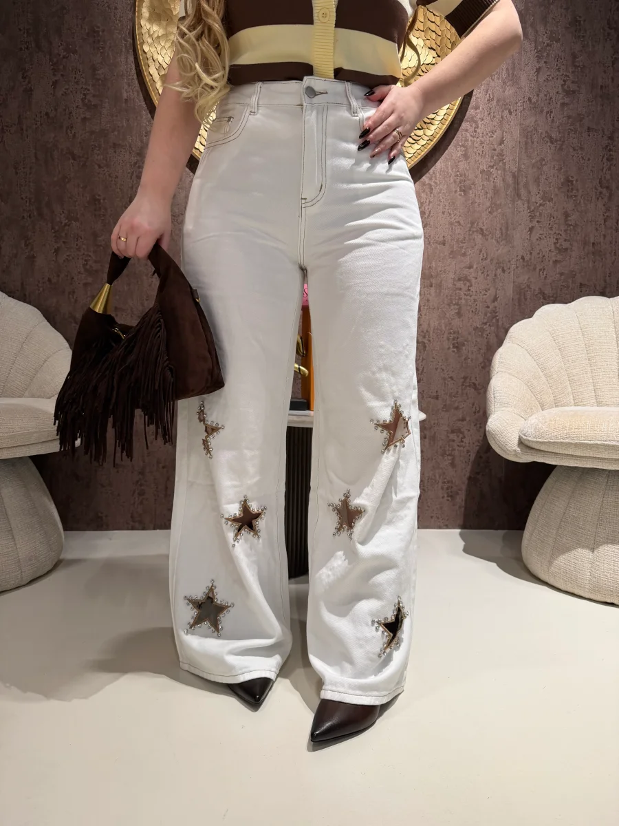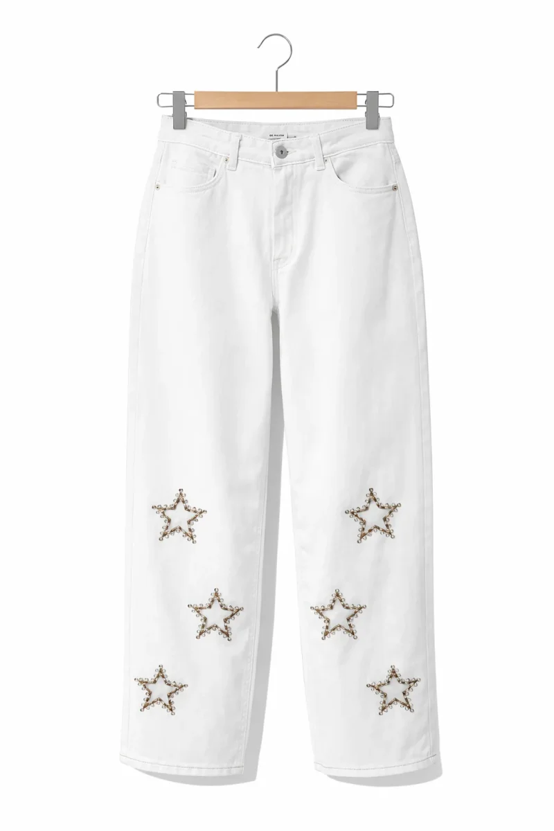 Il Shining Stars White Jeans è il capo perfetto per illuminare ogni look. Realizzato in denim bianco luminoso, è impreziosito da applicazioni a stella con strass che donano un tocco glamour e super chic.