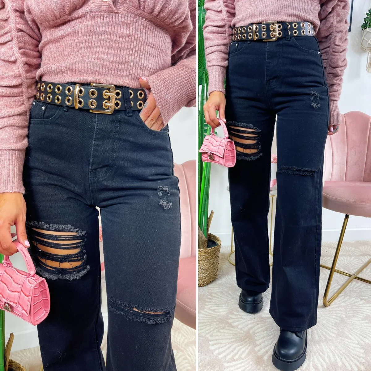 Jeans a zampa con due spacchi, uno nella gamba sinistra più ampio, veste perfettamente in taglia e regolare.