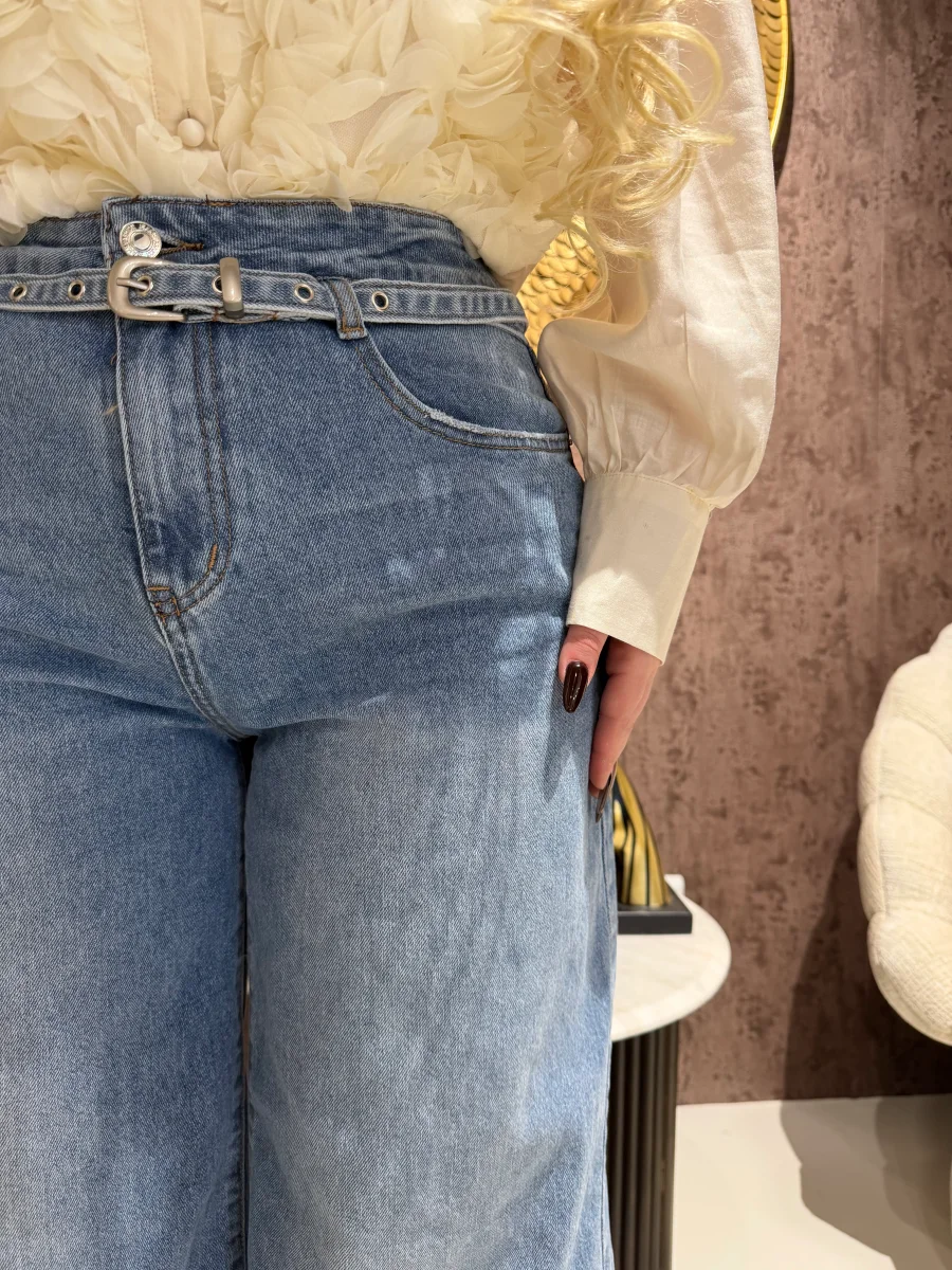 Jeans a vita alta in denim blu con gamba ampia e linea fluida, pensati per valorizzare la silhouette con un fit moderno e di tendenza. Il dettaglio della cintura integrata con fibbia aggiunge carattere al capo e permette di regolare la vestibilità in vita, rendendolo pratico e super stiloso. Il lavaggio blu medio li rende versatili e facili da abbinare in ogni stagione.