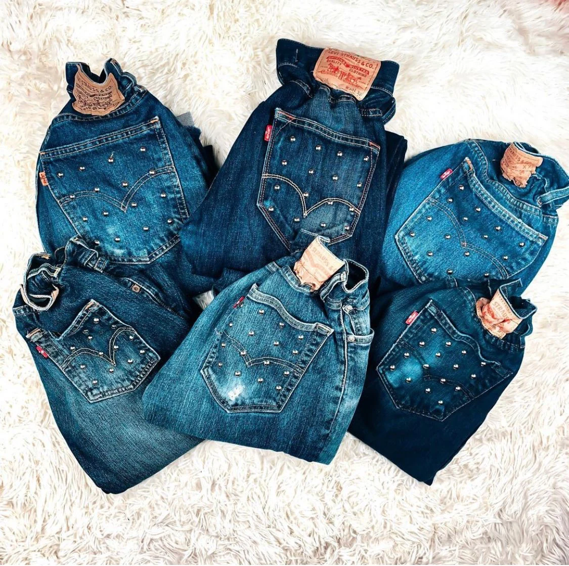 Jeans vintage con borchie sulla tasca lavorati a mano. Considerarsi pezzi unici poichè interamente Personalizzati. Lievi differenze rispetto alla foto ne denotano l’unicità e la sua completa lavorazione handmade!