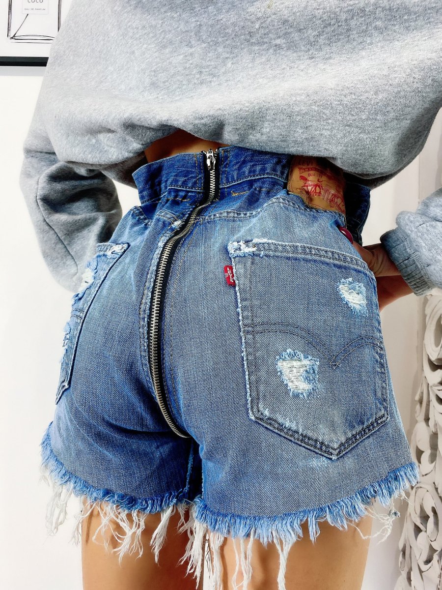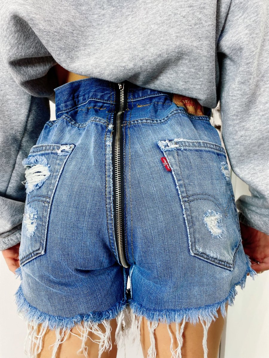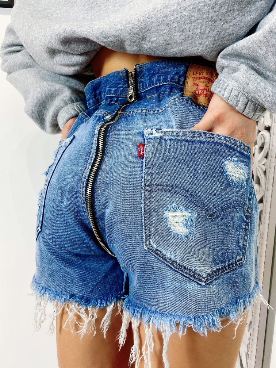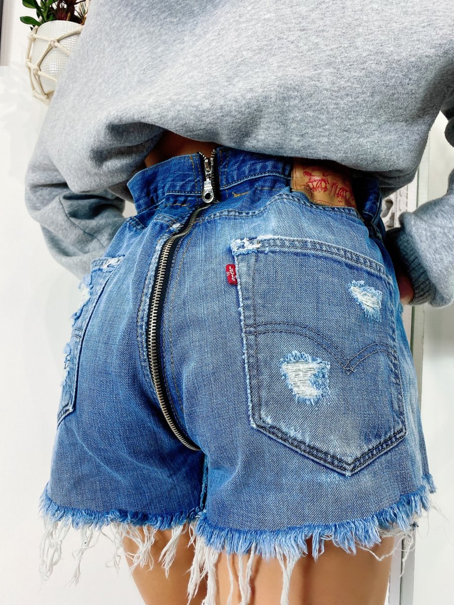 Short Vintage Levi’s alta qualità con strappi. Jeans vintage lavorati a mano Considerati pezzi unici poichè interamente Personalizzati. Lievi differenze rispetto alla foto ne denotano l’unicità e la sua completa lavorazione handmade.