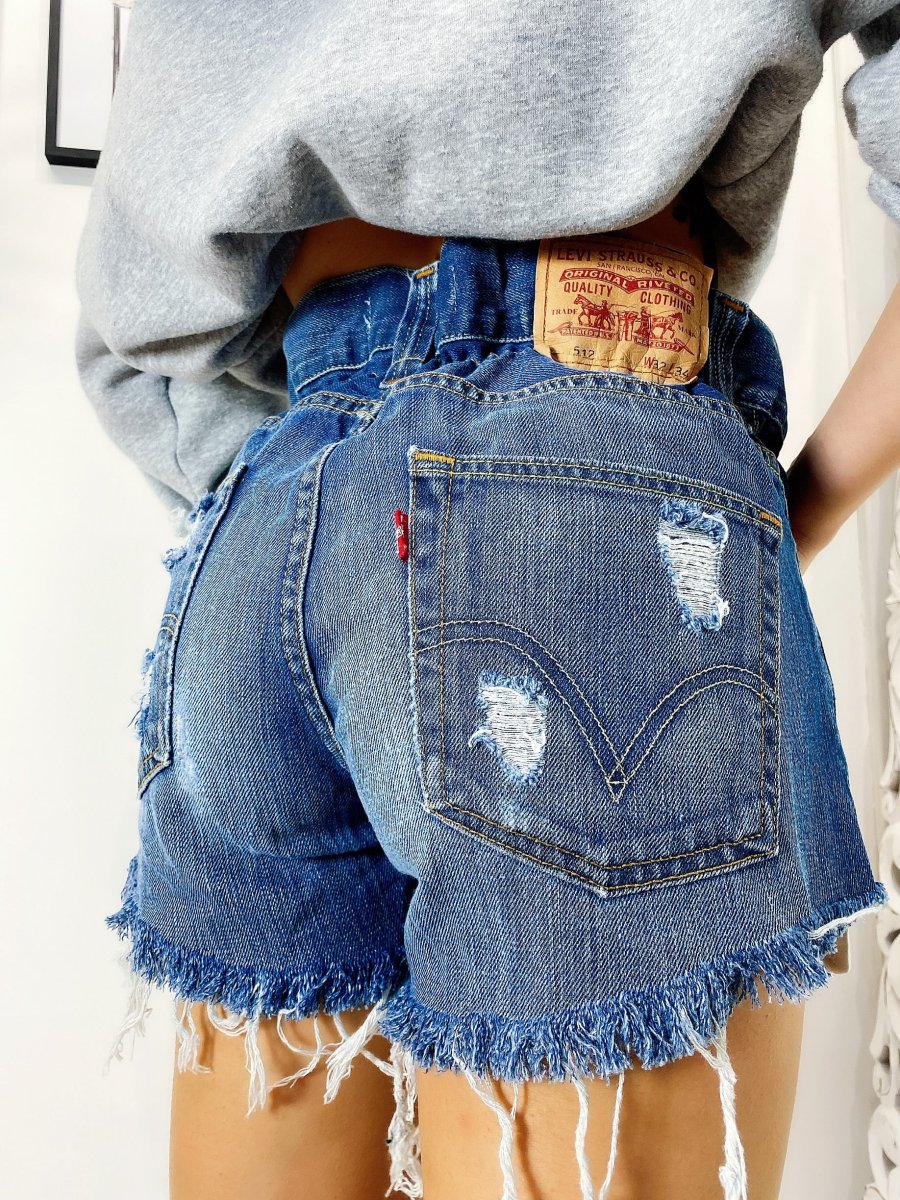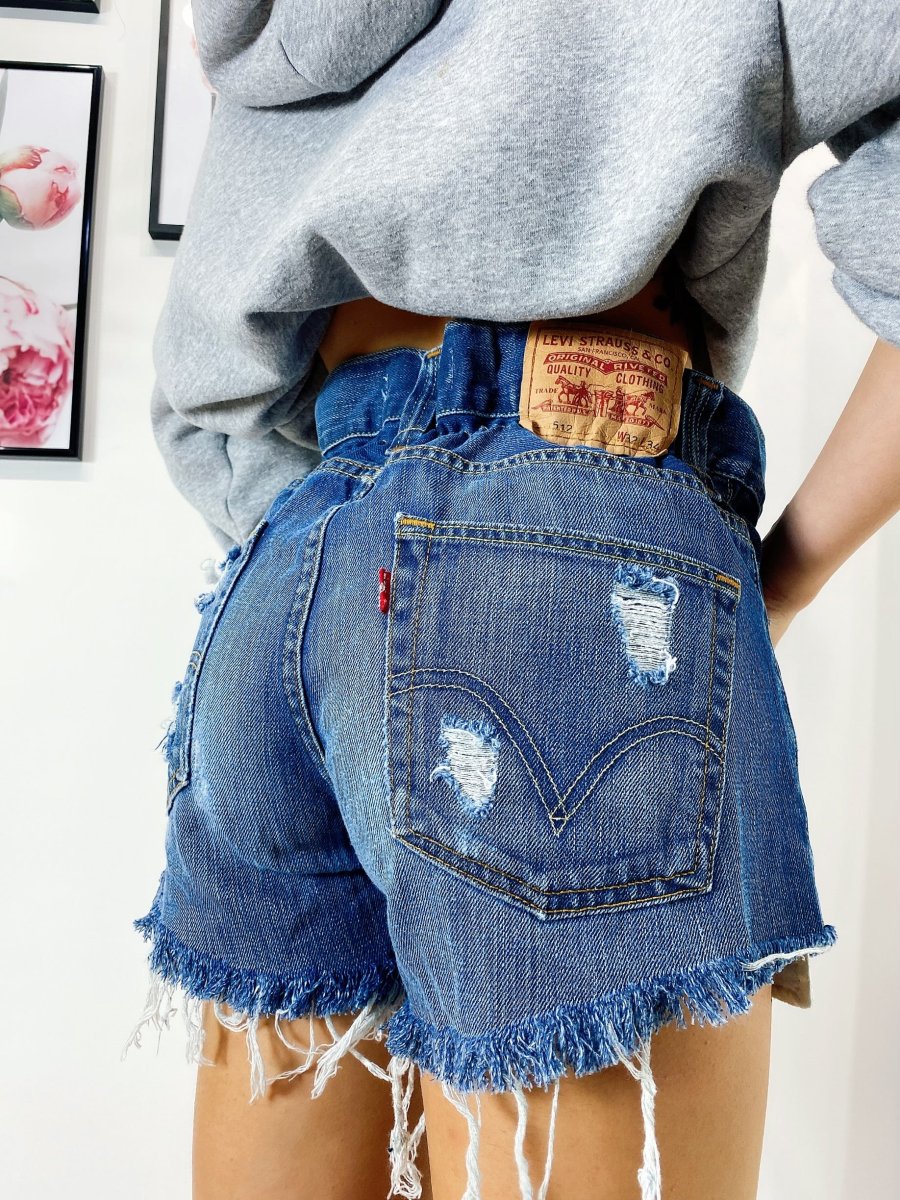 Short Vintage Levi’s alta qualità con strappi. Jeans vintage lavorati a mano Considerati pezzi unici poichè interamente Personalizzati. Lievi differenze rispetto alla foto ne denotano l’unicità e la sua completa lavorazione handmade.