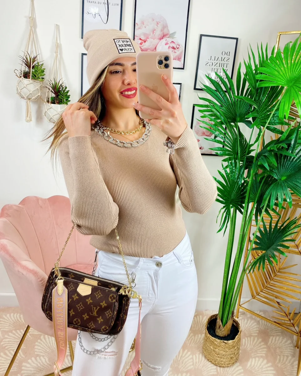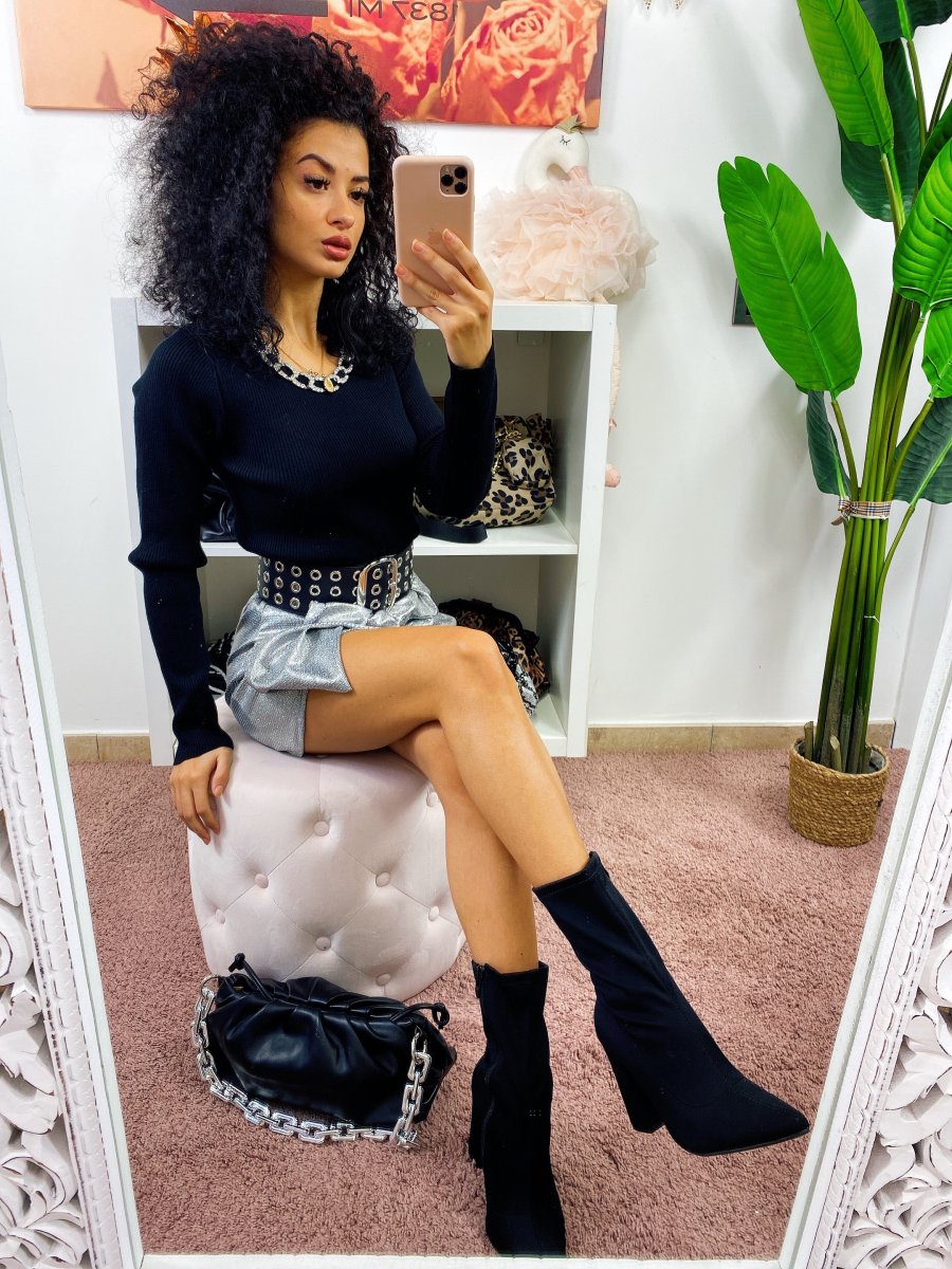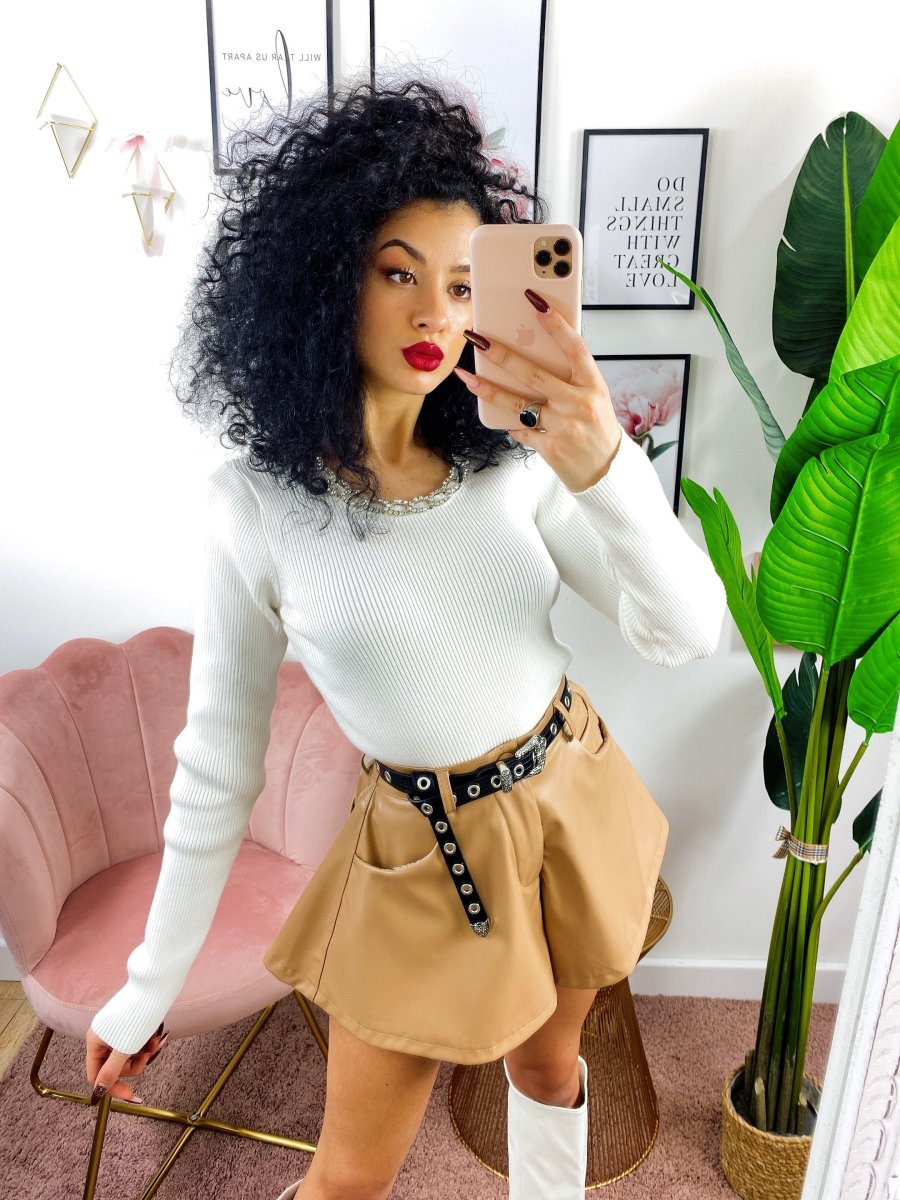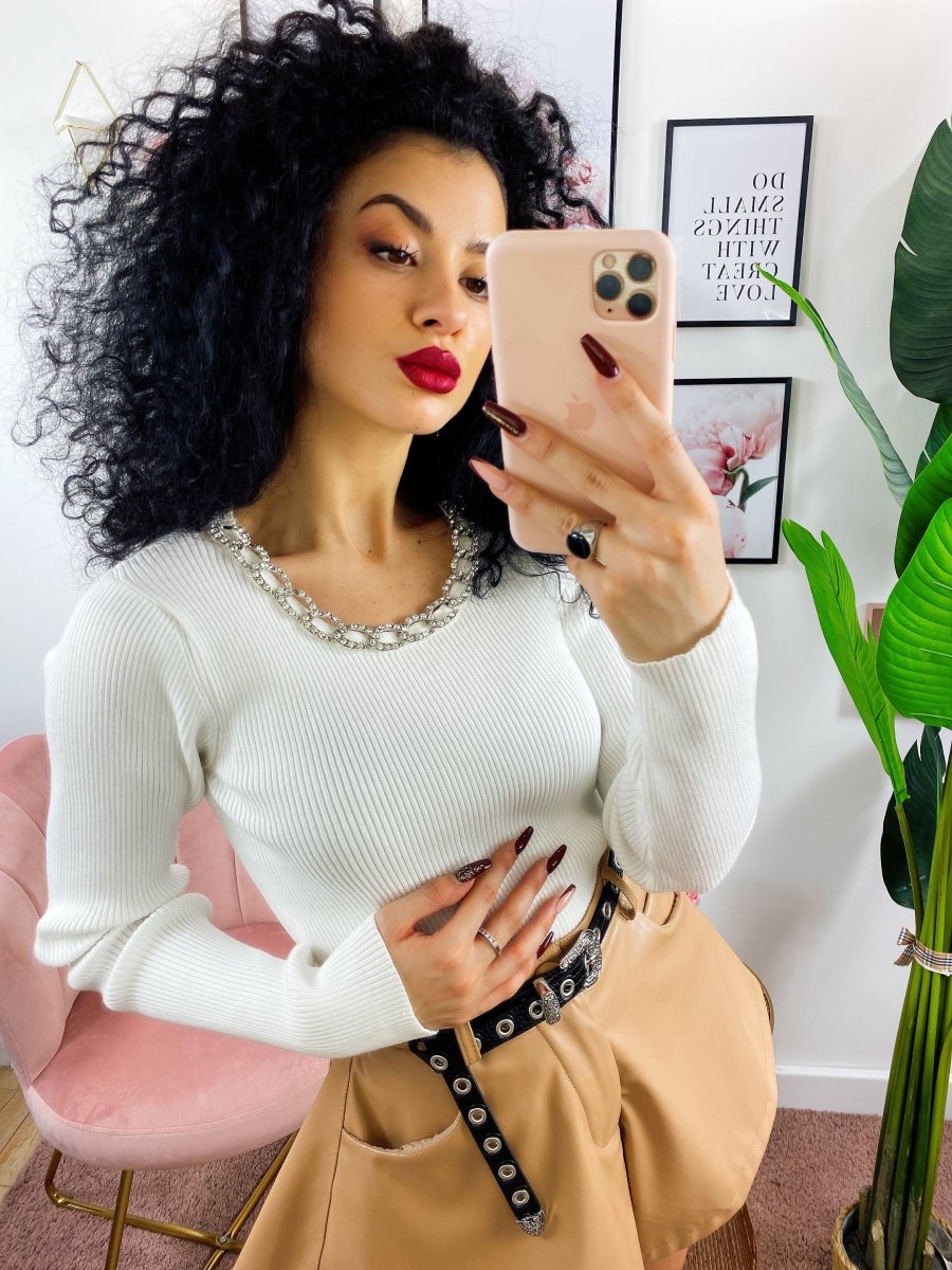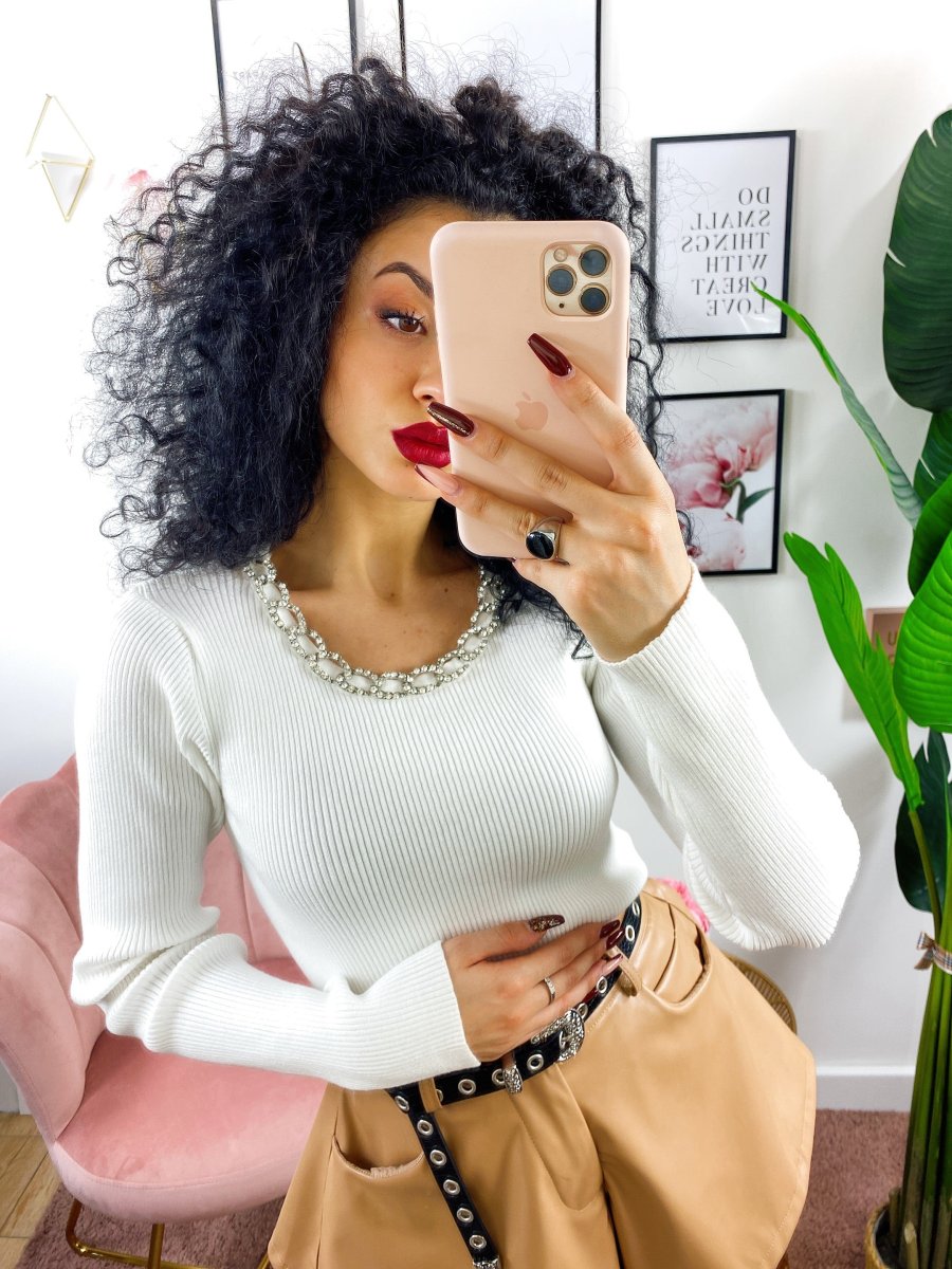 Maglioncino a girocollo e manica lunga. Taglio corto con incrocio elastico. Manichina aderente.