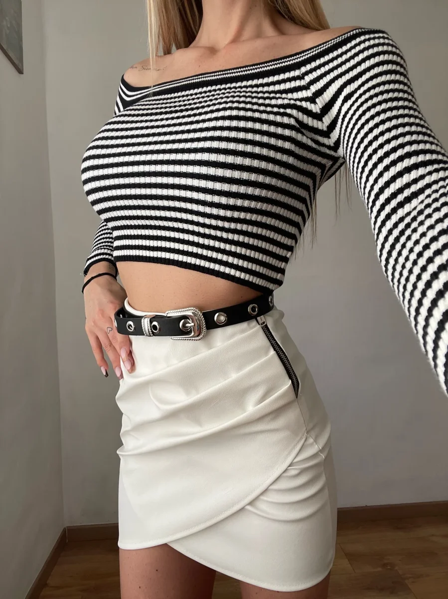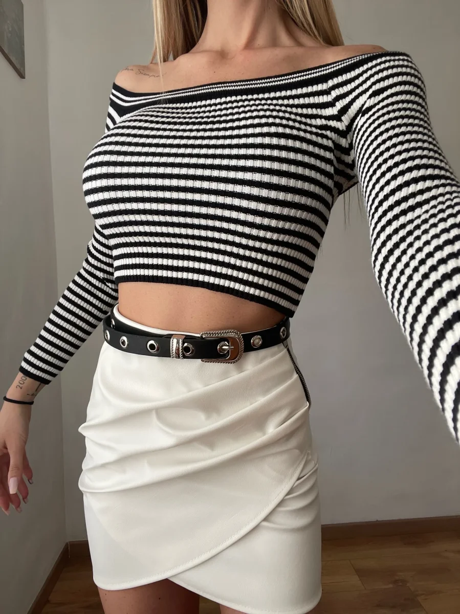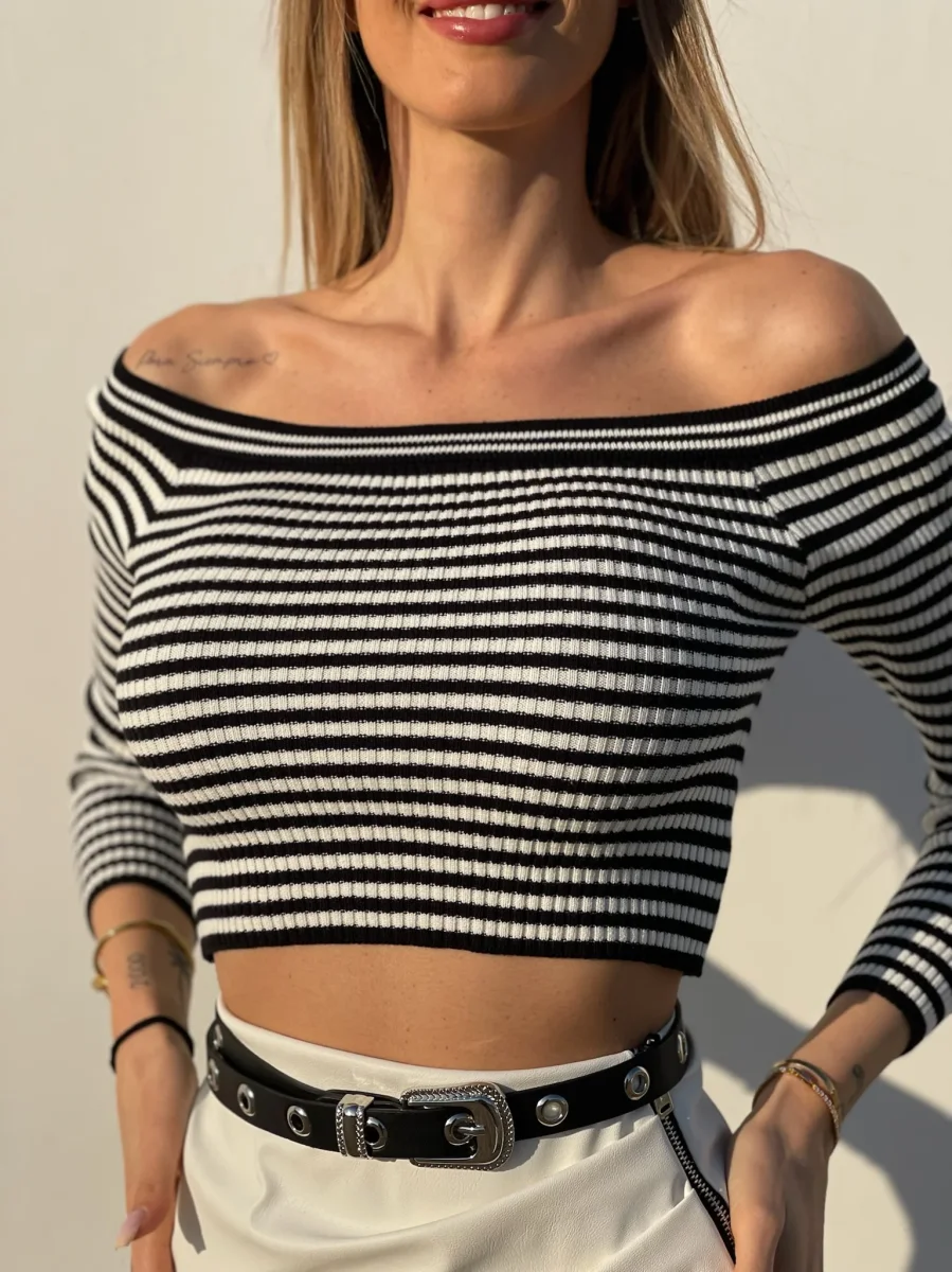 Maglioncino a righe bianco e nero con scollo a barchetto e maniche lunghe.