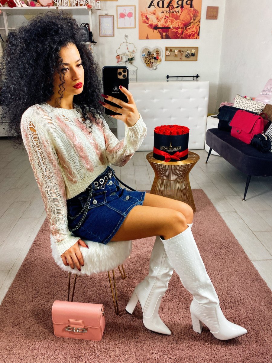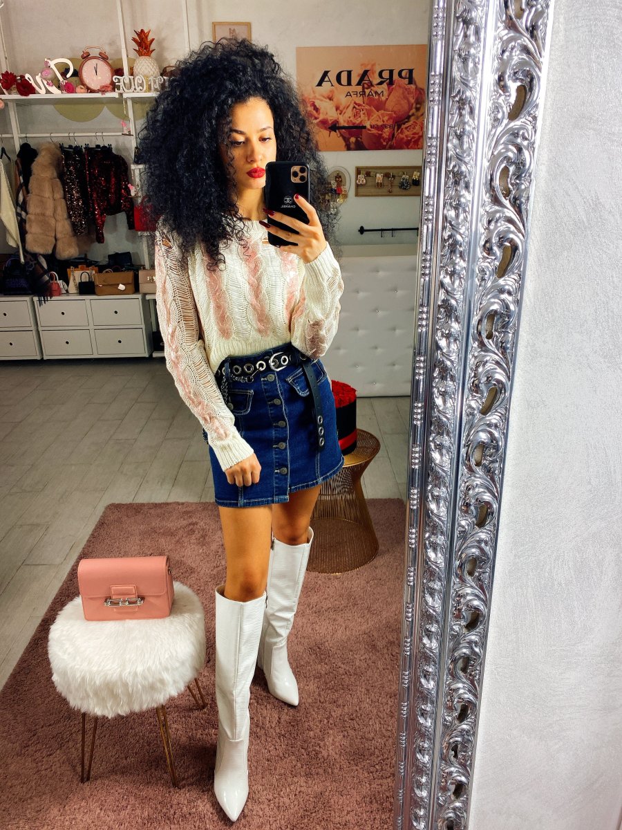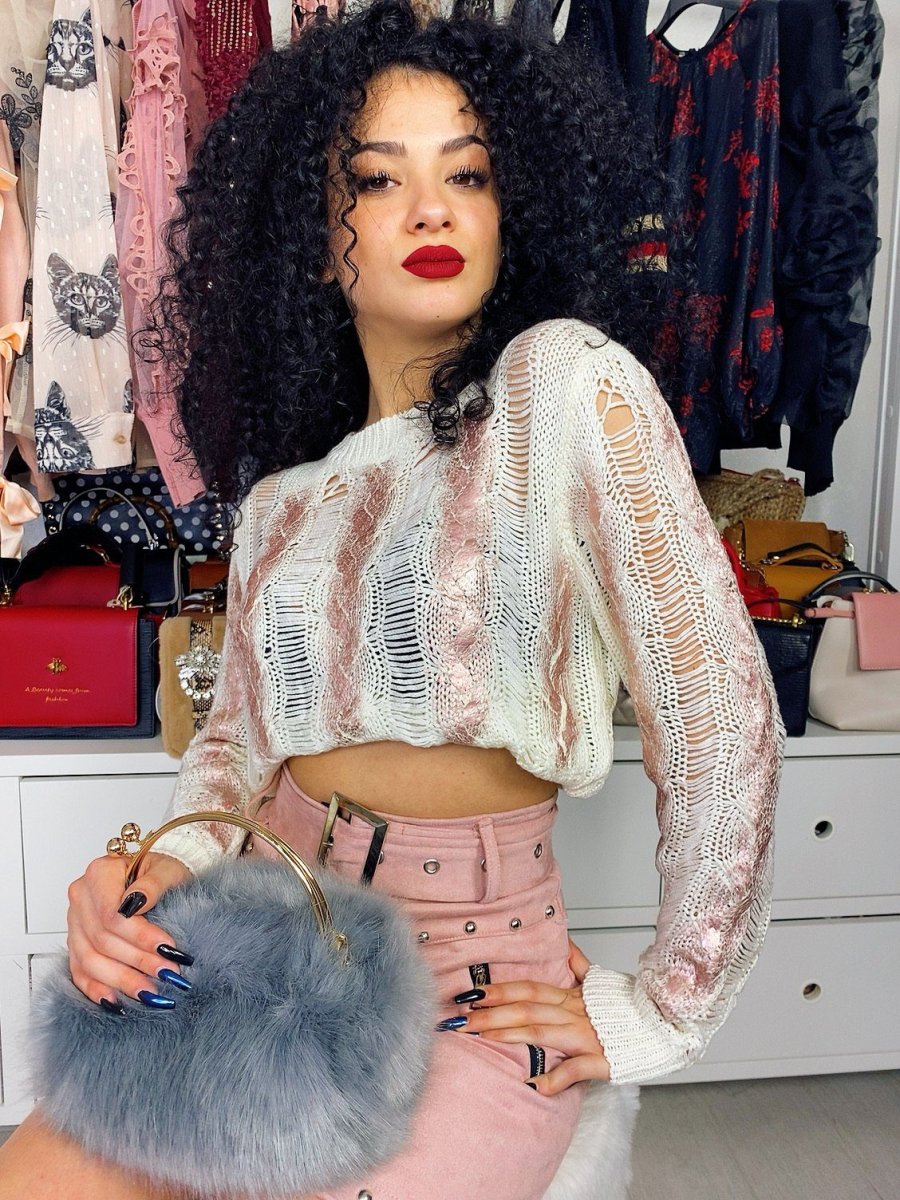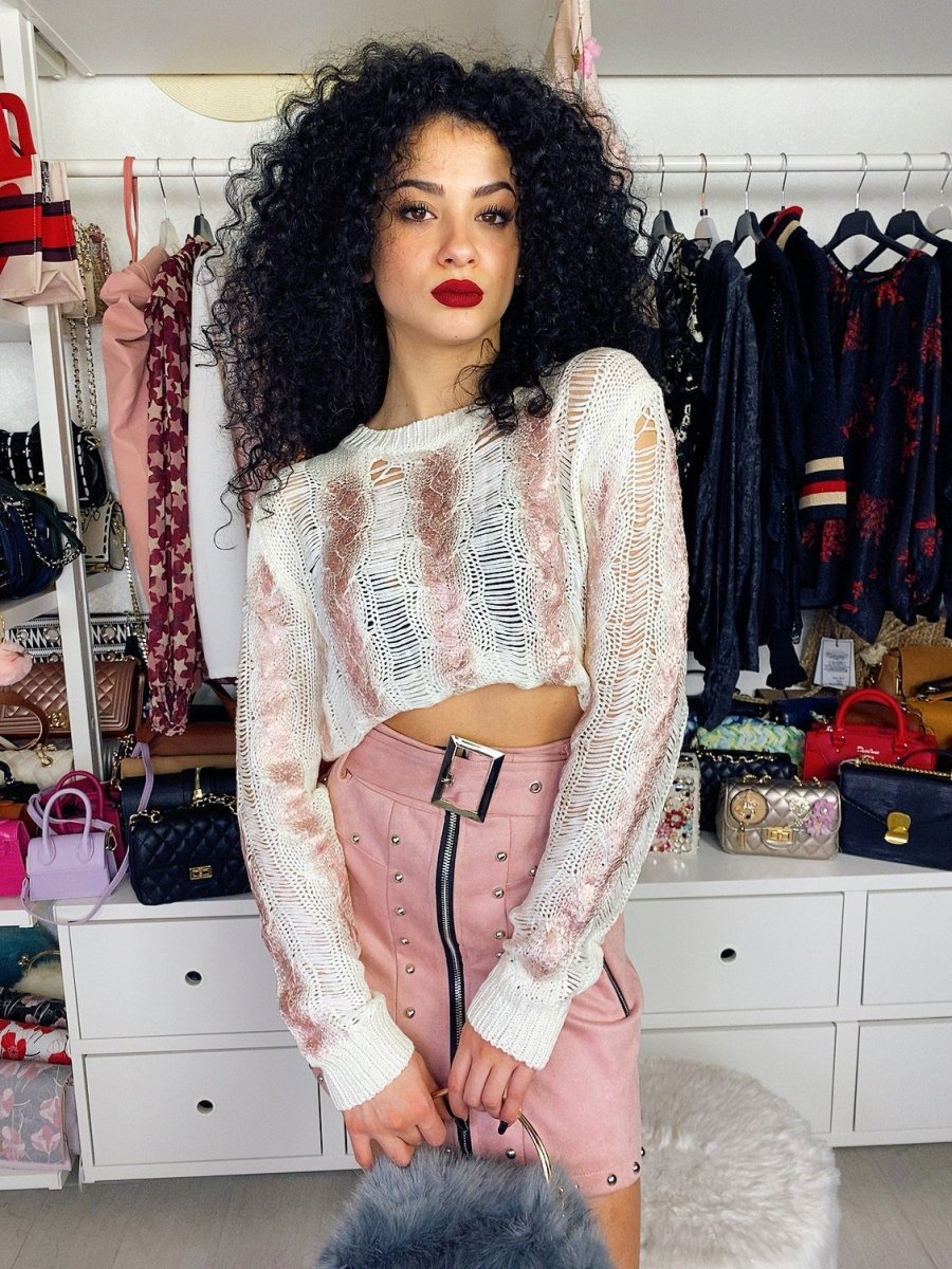 Maglioncino bucherellato con dettagli rosa. In lana elasticizzata