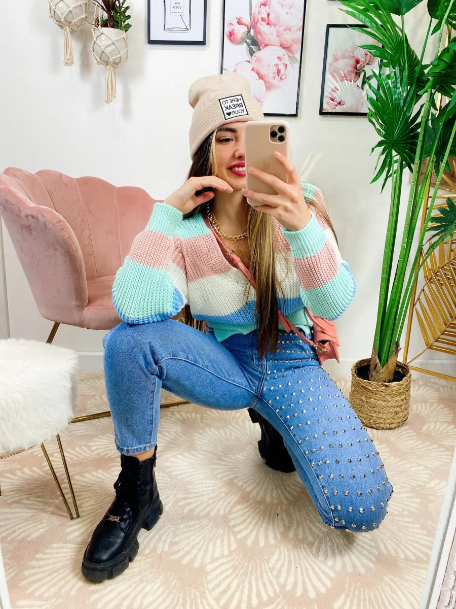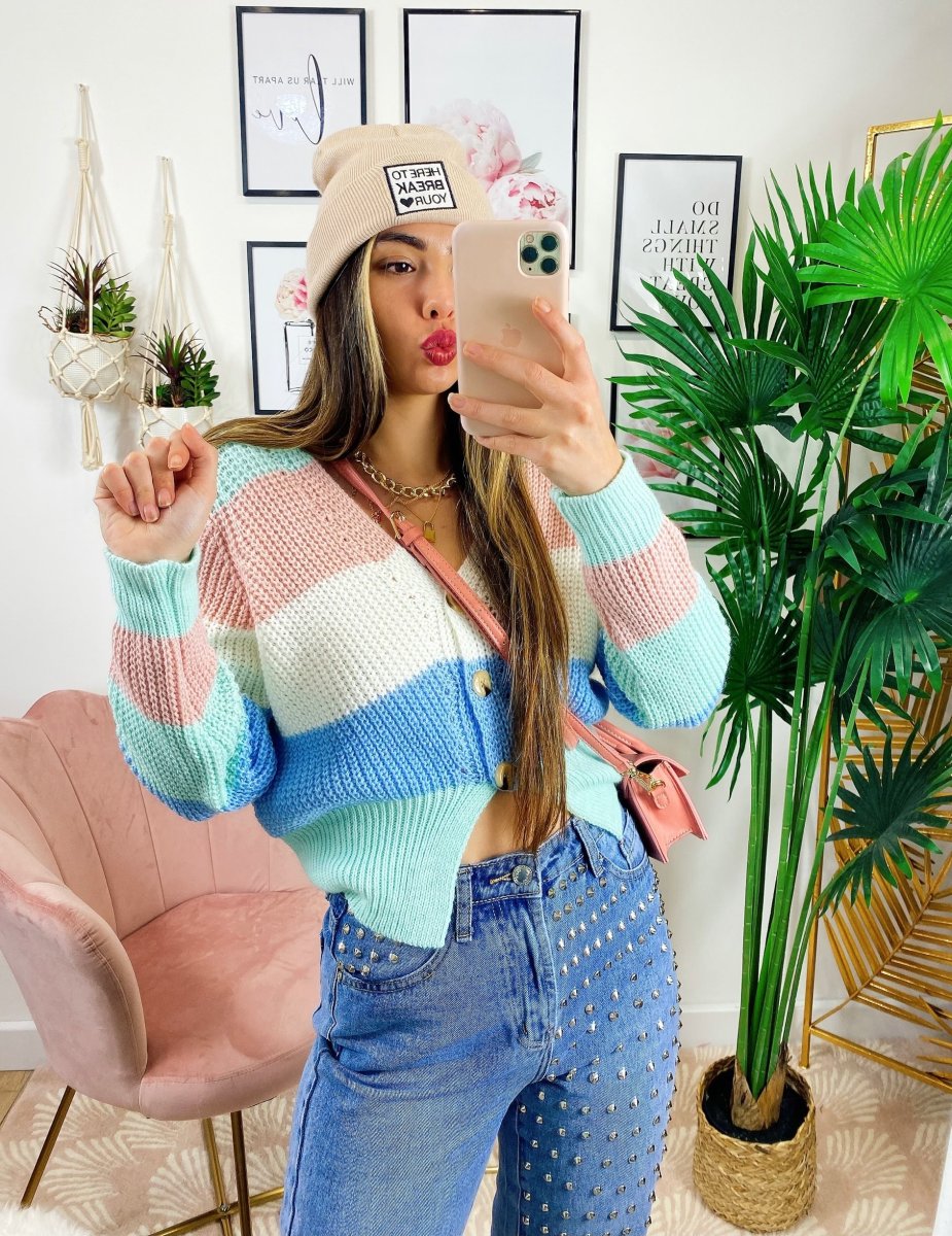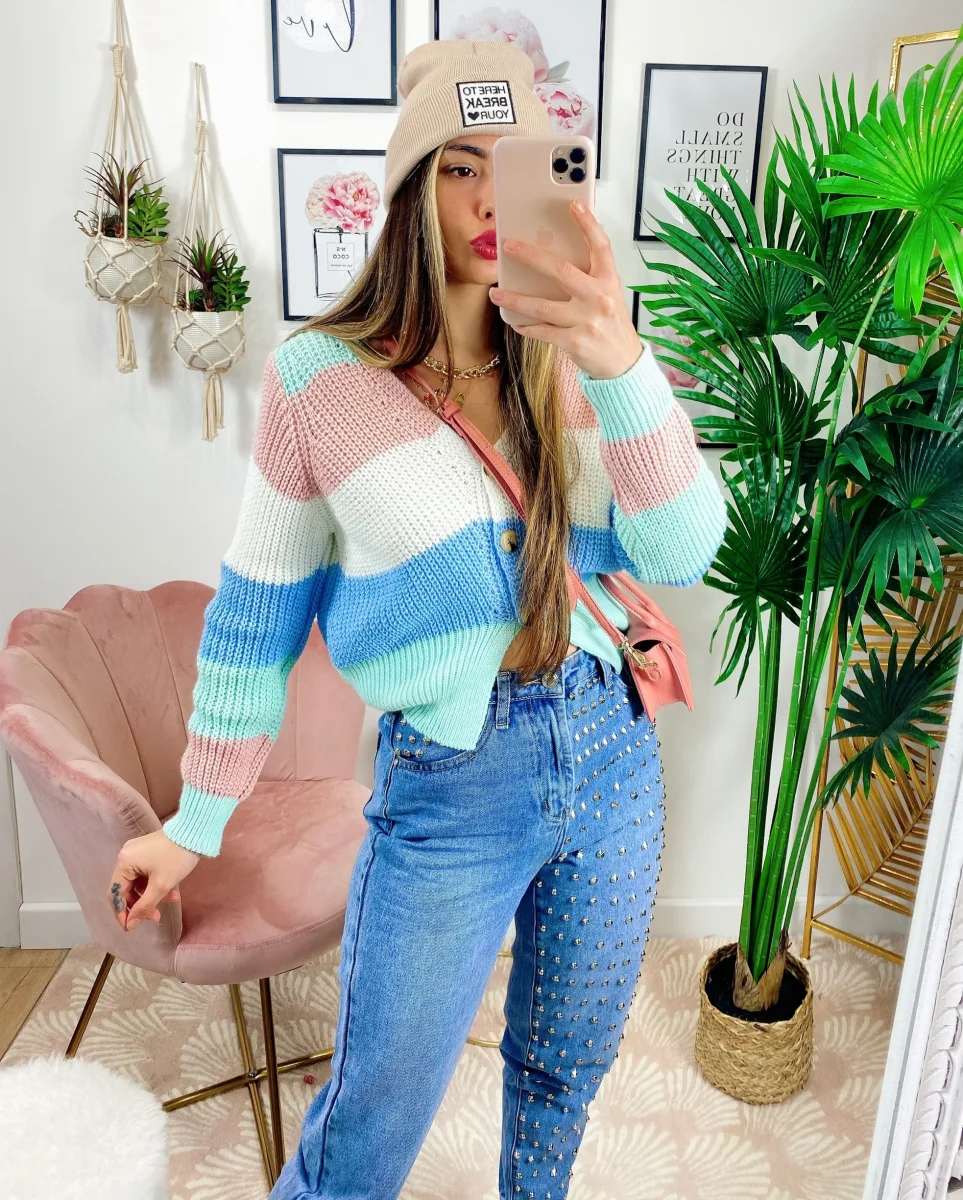 Maglioncino primaverile tricolore celeste rosa verdeacqua.