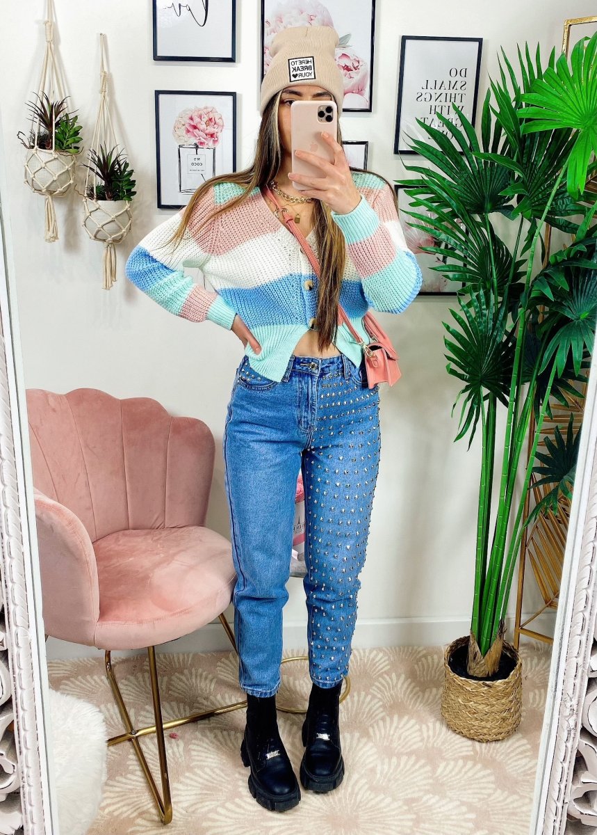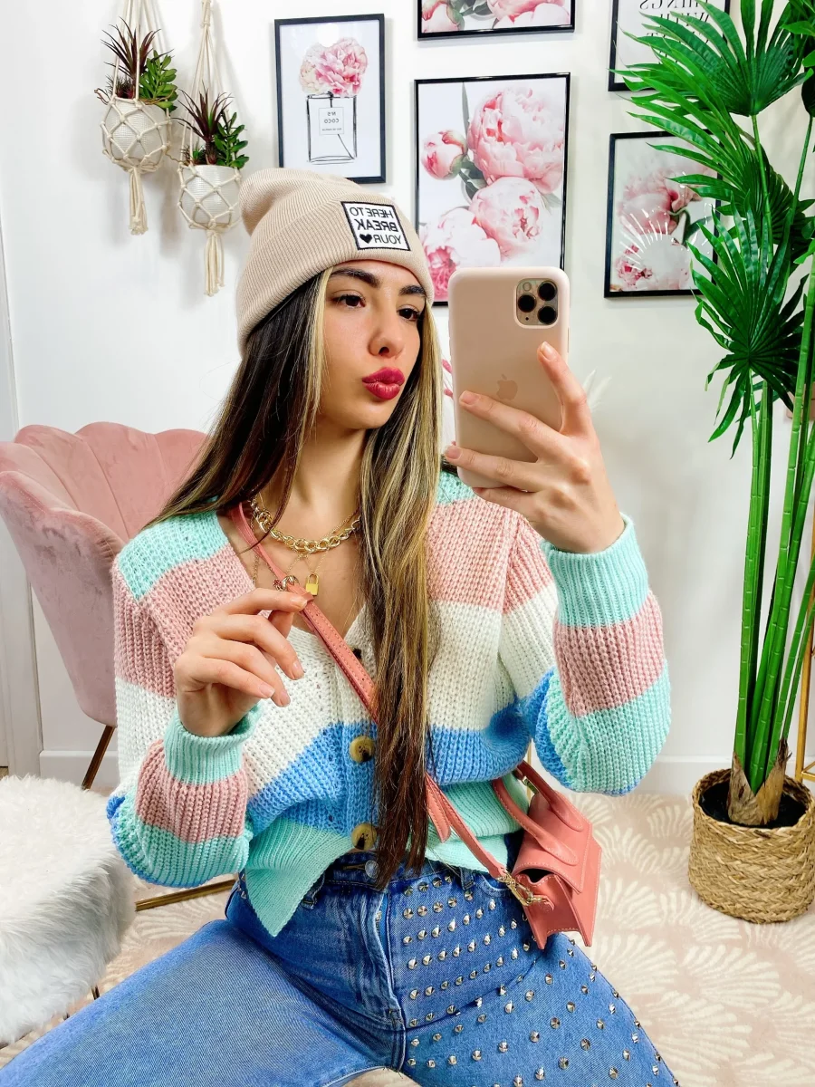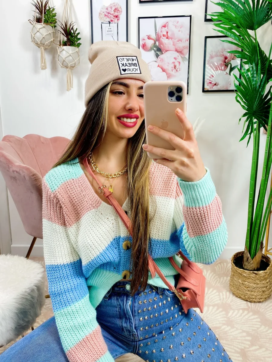 Maglioncino primaverile tricolore celeste rosa verdeacqua.