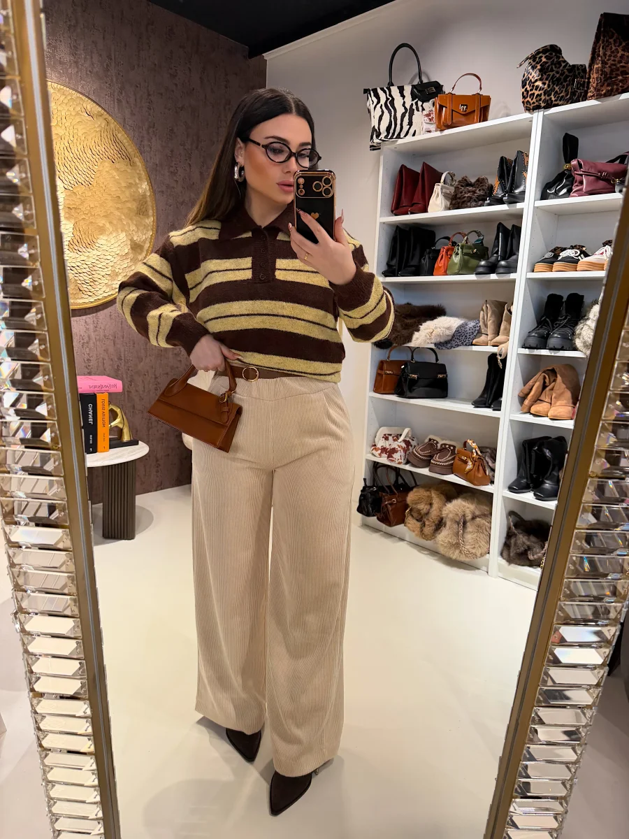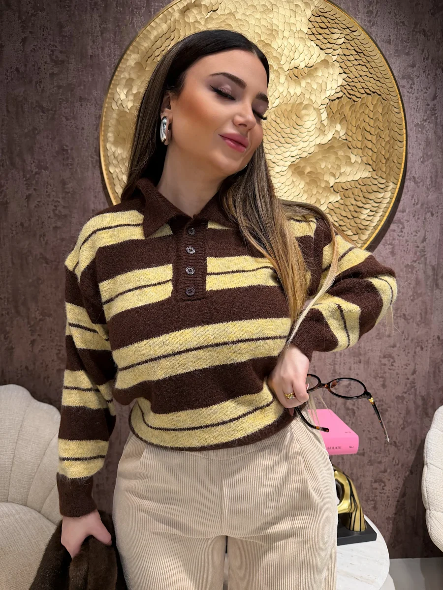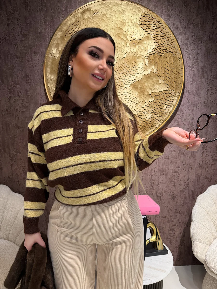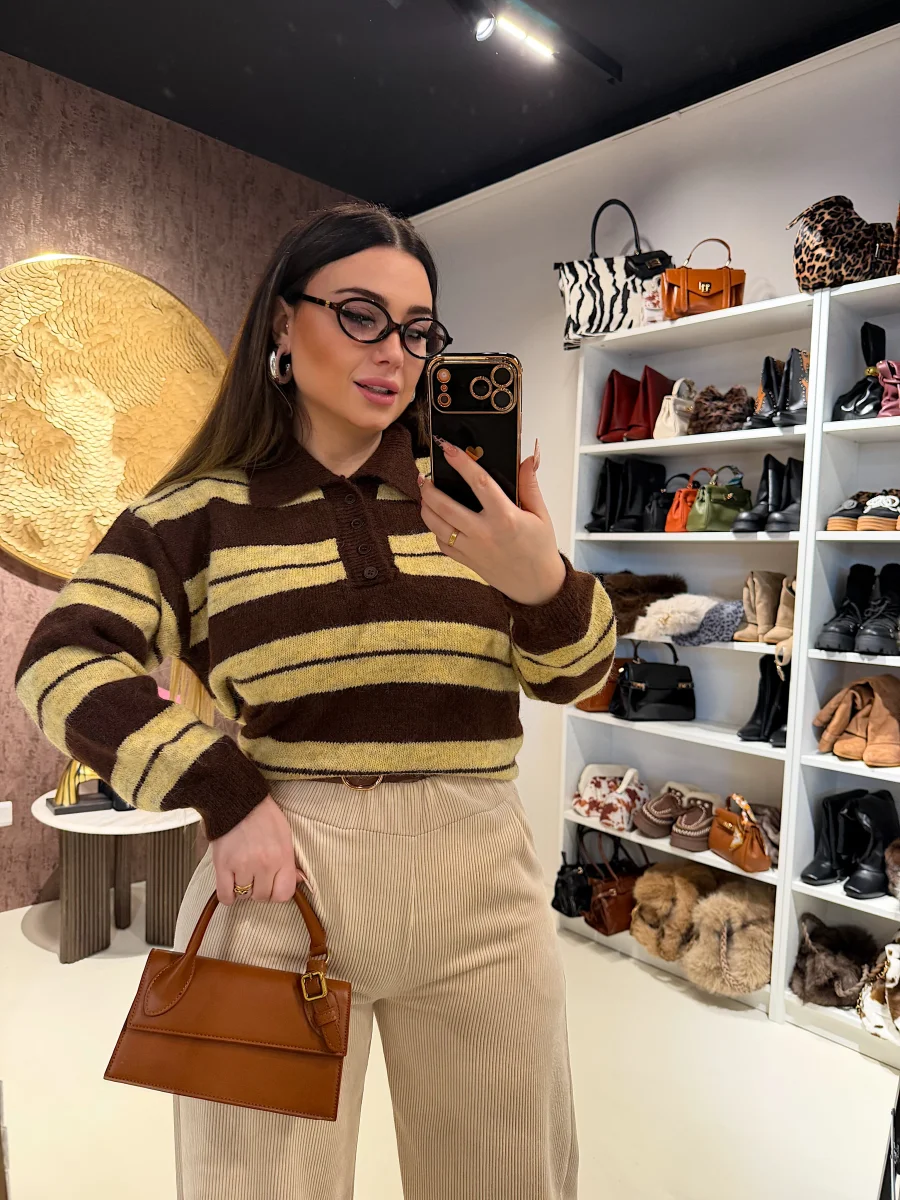 Maglione a righe larghe nei toni caldi del marrone e del beige, realizzato in filato morbido e avvolgente. Il design con colletto e bottoncini frontali dona un tocco retrò e super cozy, perfetto per i look autunnali. Da abbinare a jeans o pantaloni in velluto per uno stile casual-chic firmato RA Boutique.