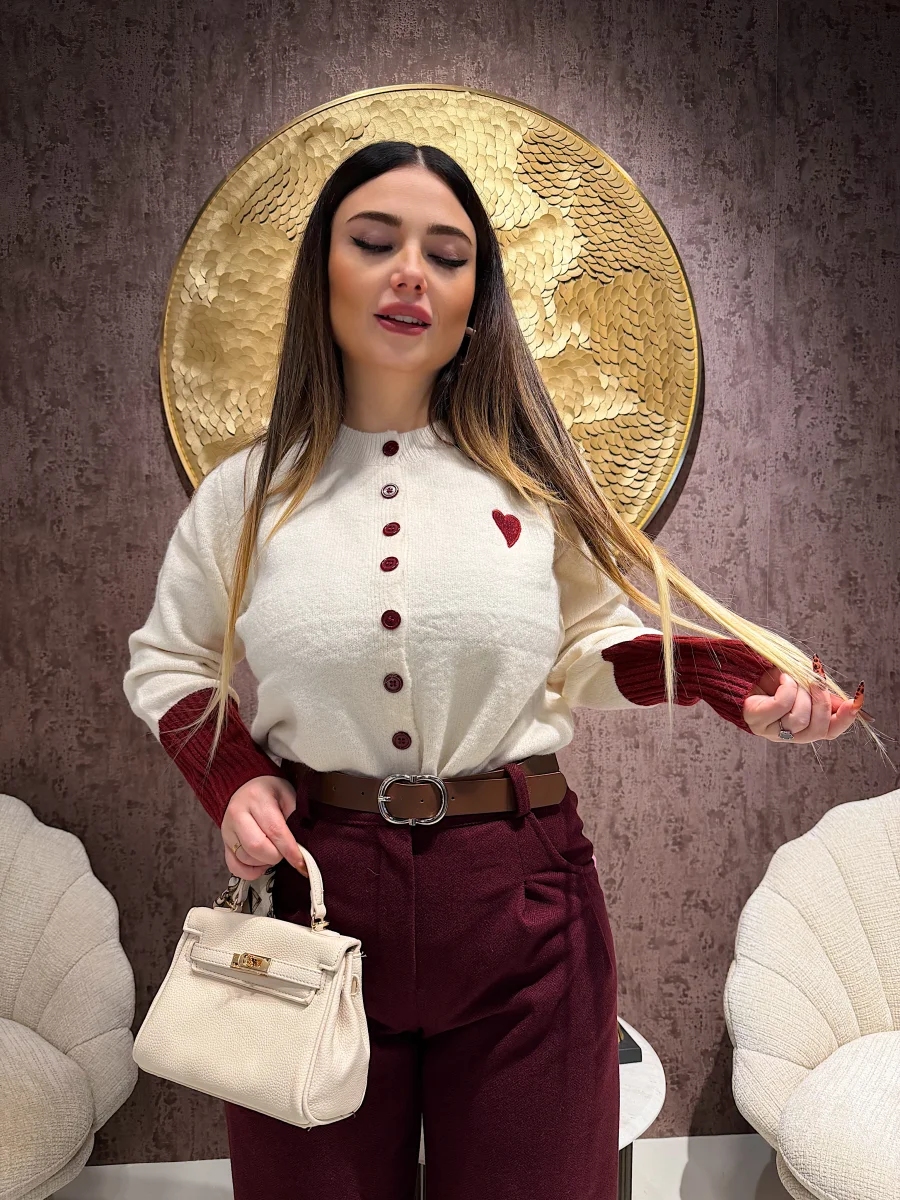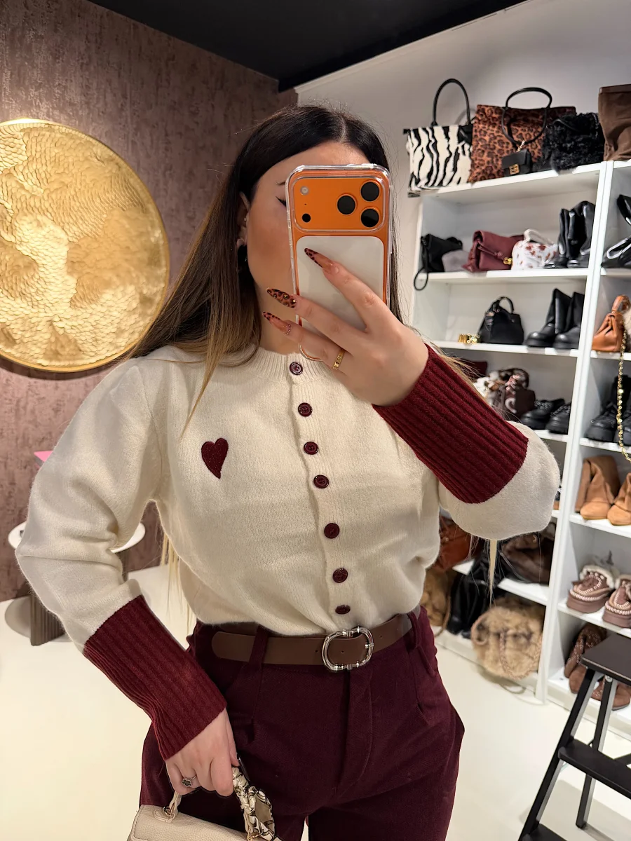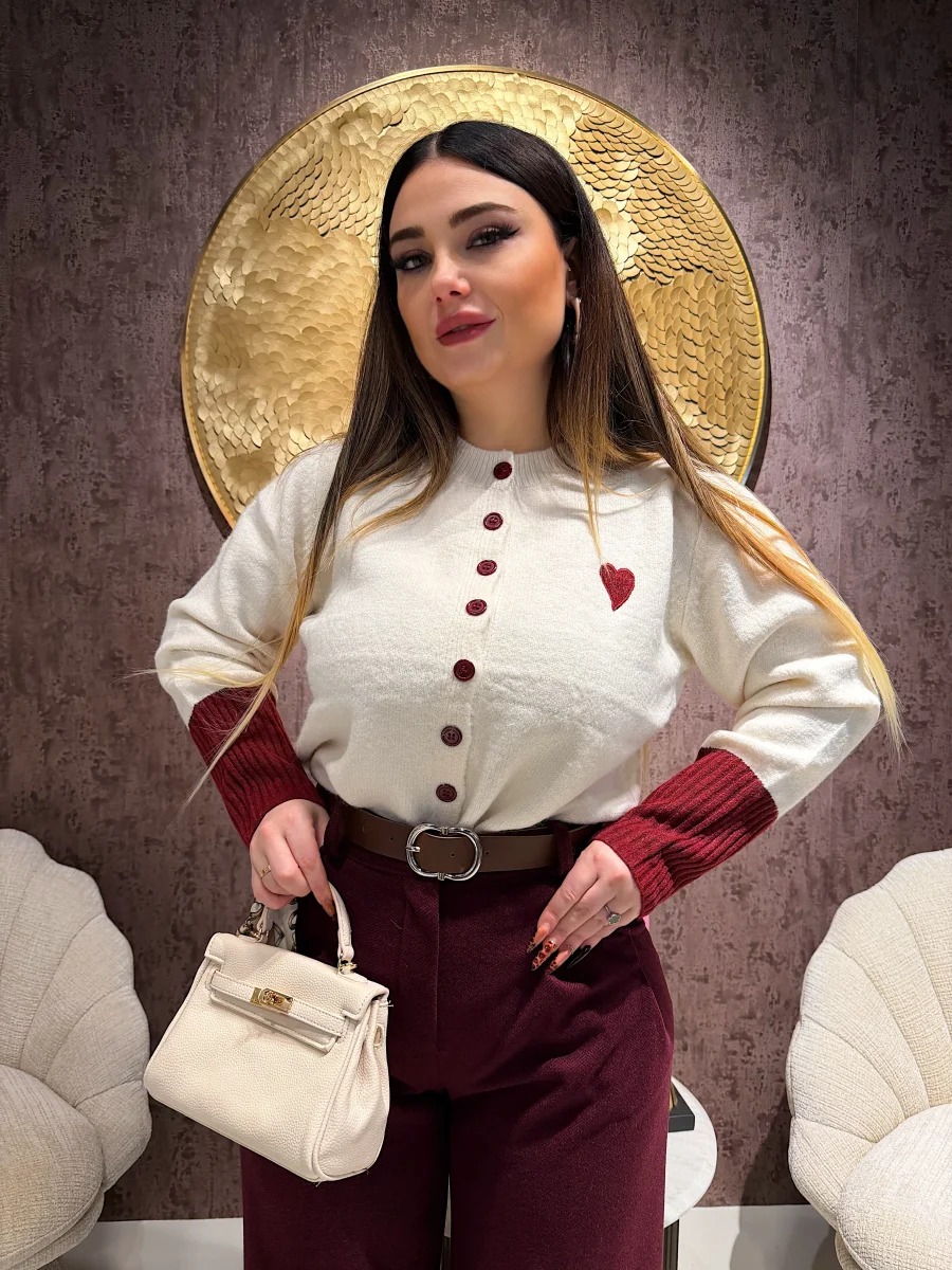 Maglioncino Cardigan in maglia soffice con bottoni frontali e maniche lunghe a contrasto color bordeaux. Impreziosito da un piccolo cuore ricamato sul petto, è il capo ideale per un look romantico e caldo. Morbido, femminile e versatile — perfetto da indossare con jeans o gonne per uno stile dolce ma curato.