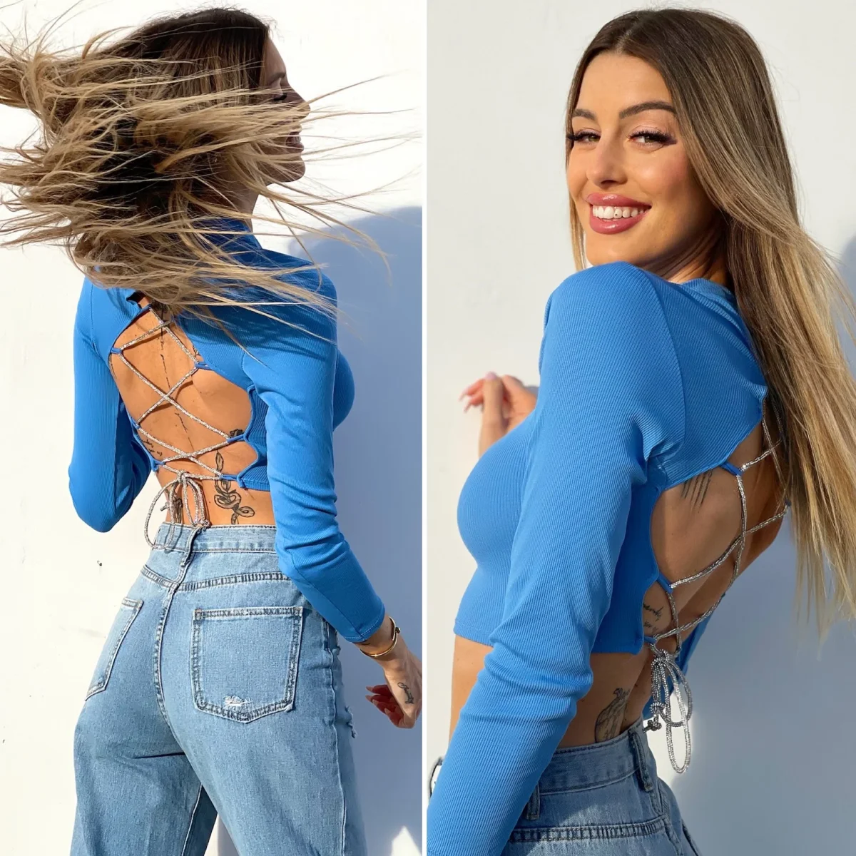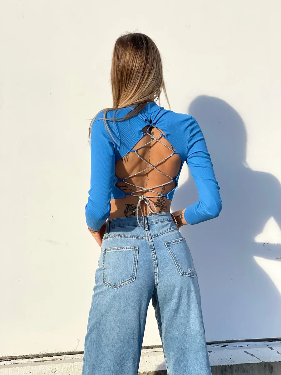 Maglioncino in tessuto a costine e manica lunga e lacci sulla schiena regolabili pieni di strass.