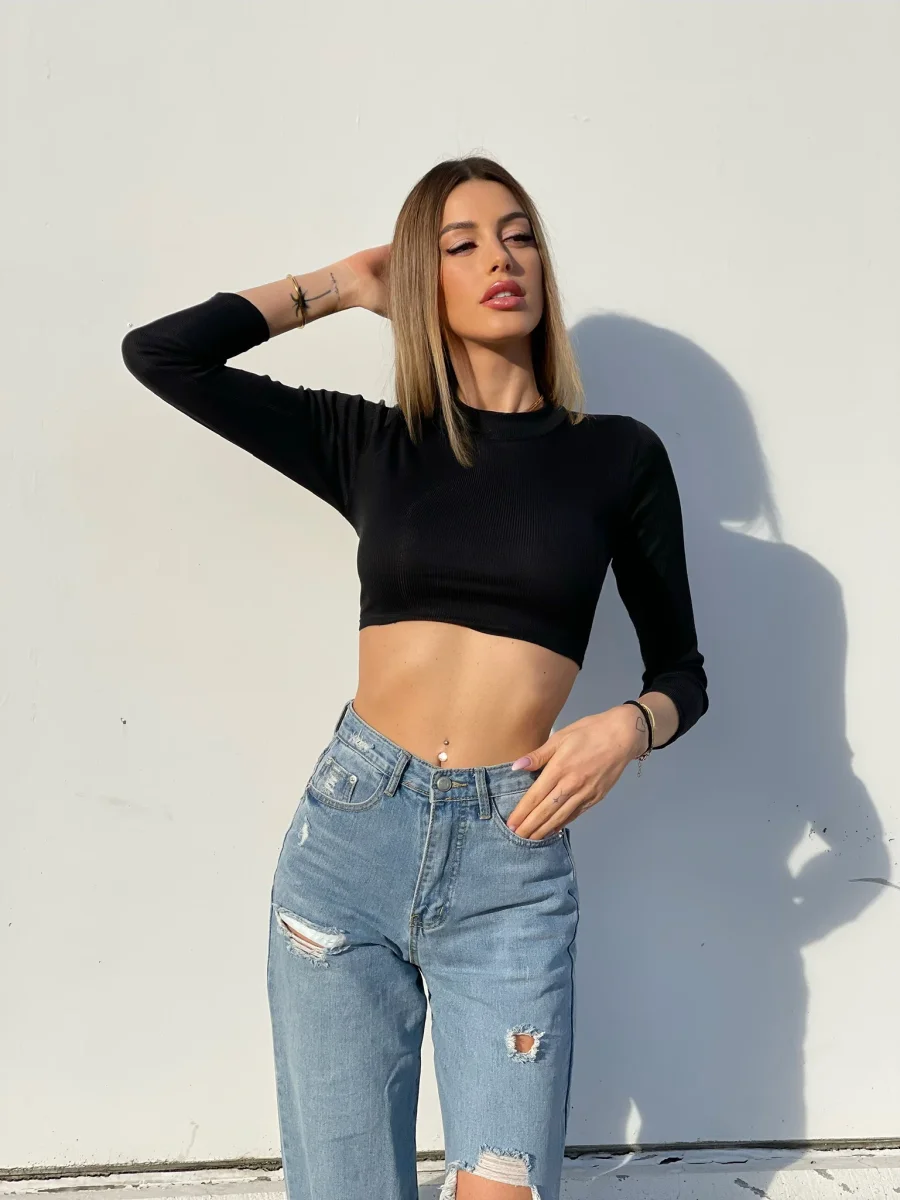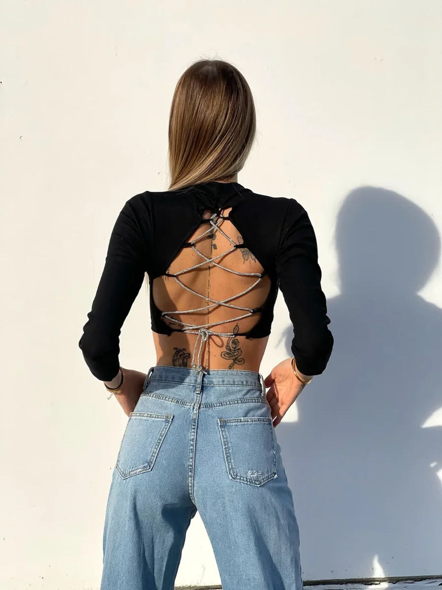 Maglioncino in tessuto a costine e manica lunga e lacci sulla schiena regolabili pieni di strass.
