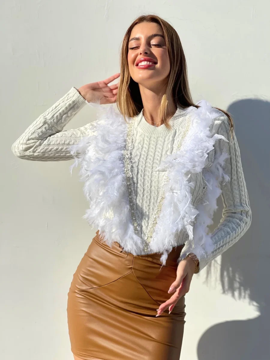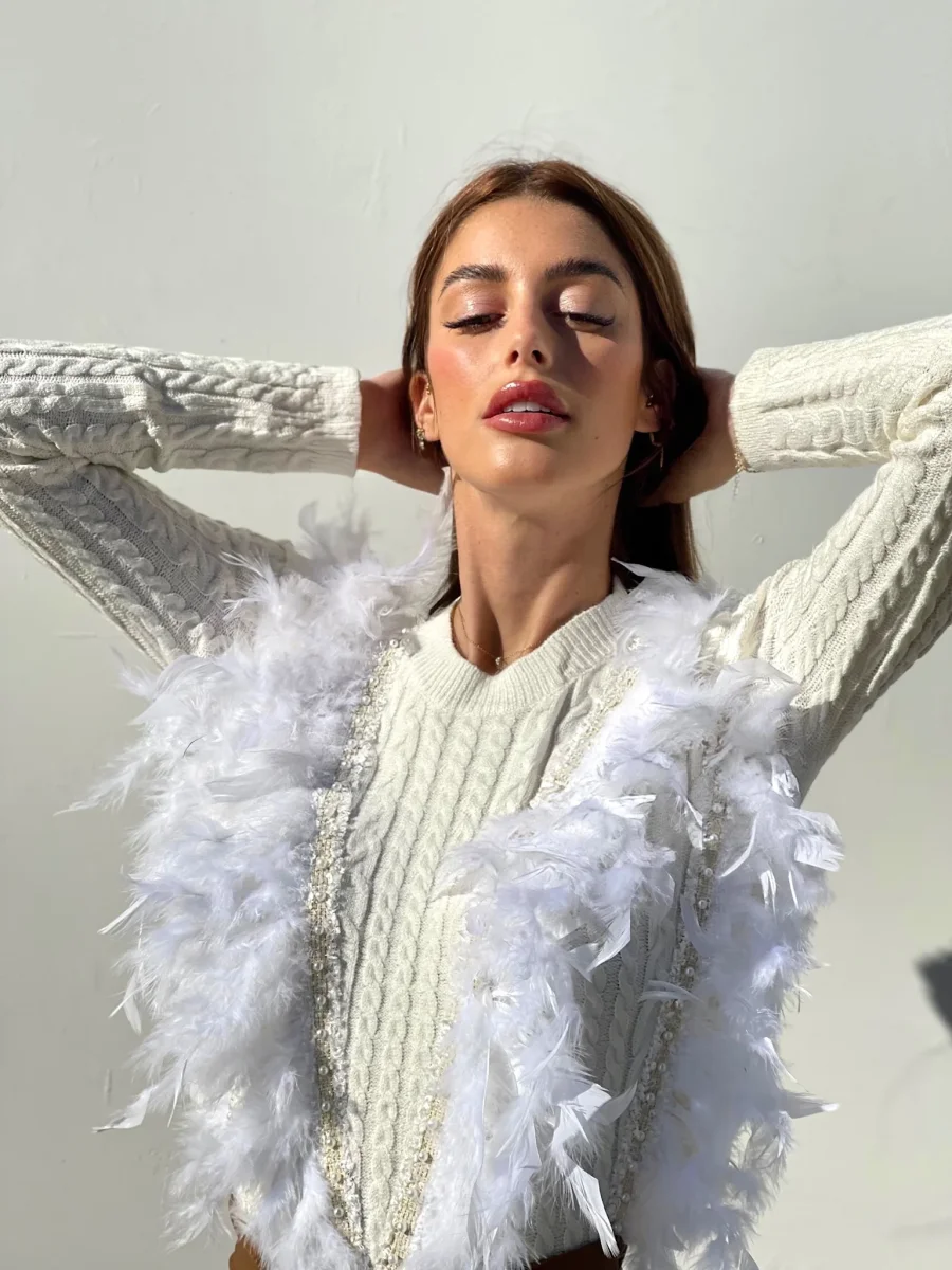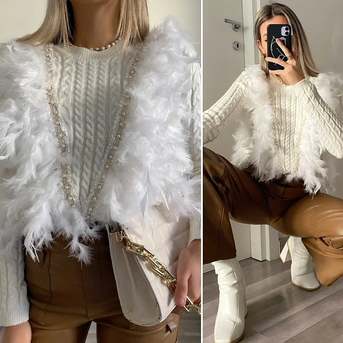 Maglioncino con piume e perle, veramente ottima qualità, morbidissimo.