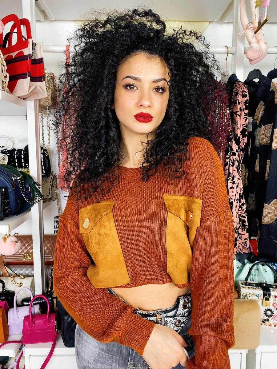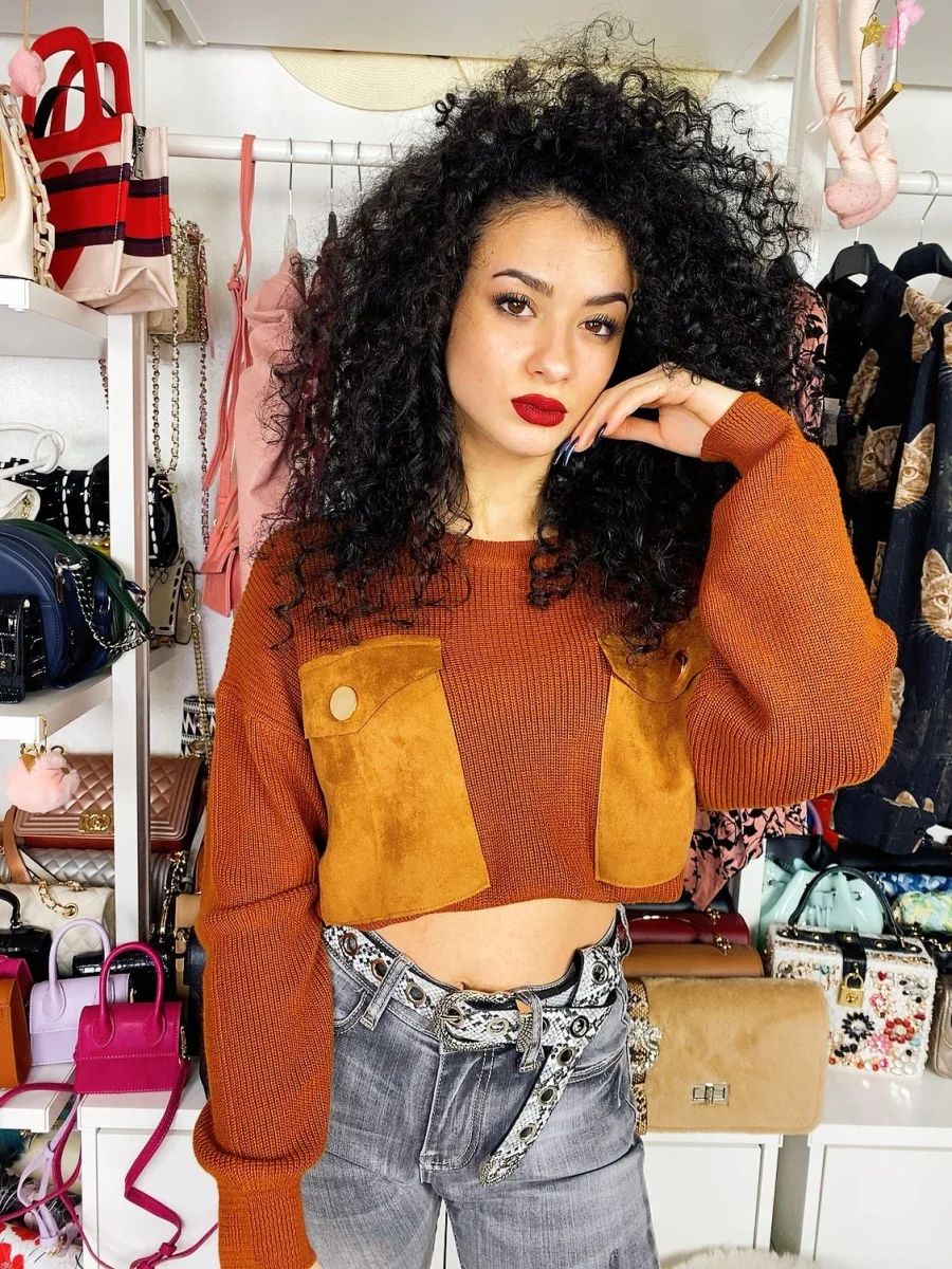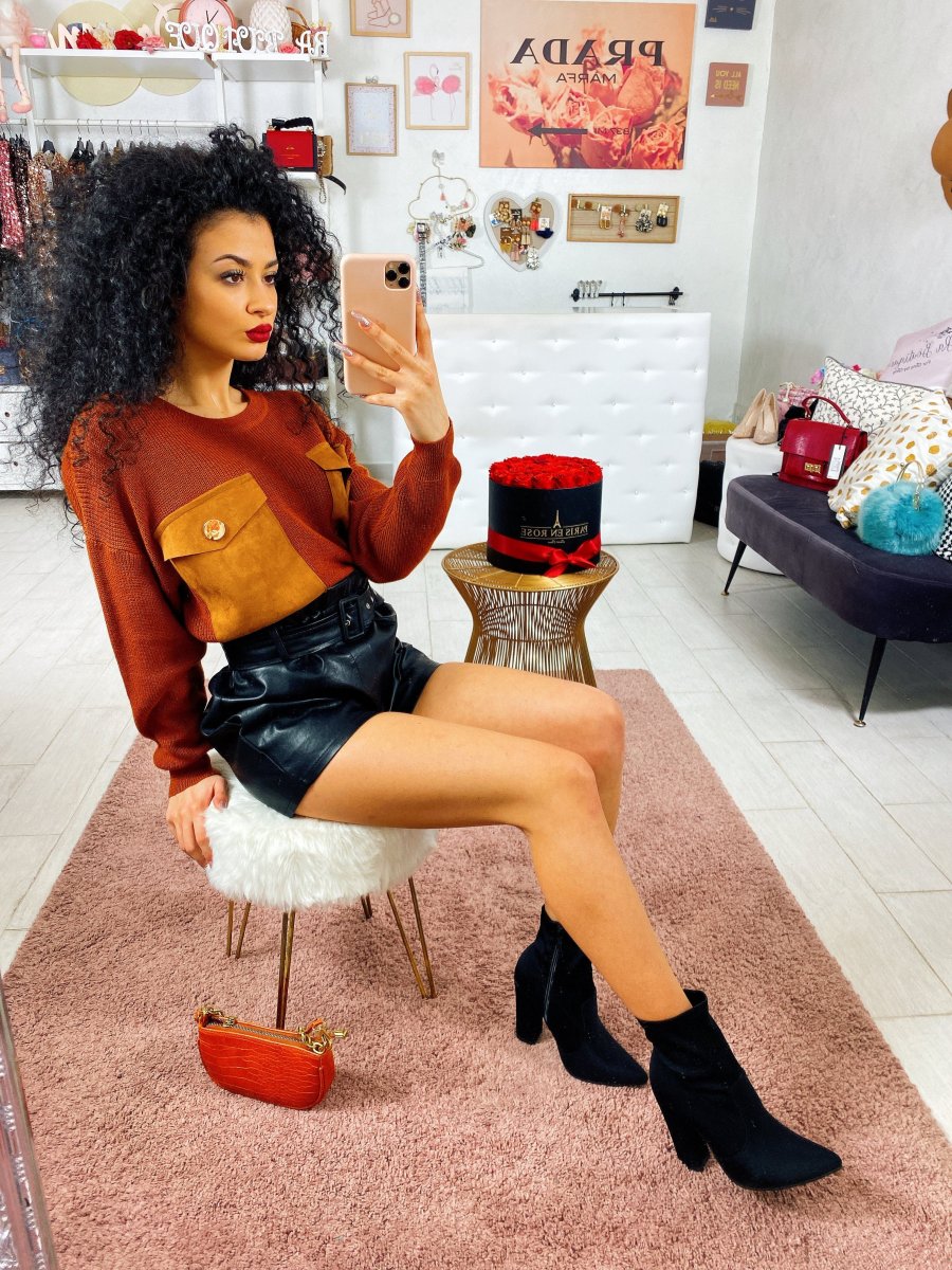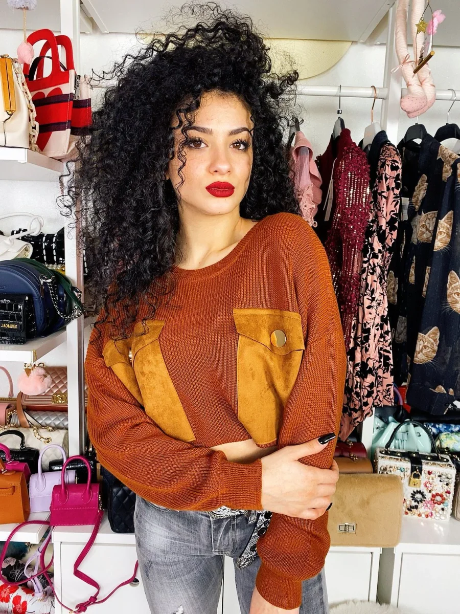 Maglione in lana morbida con tasche in nappa sul seno, in dettaglio bottoncino oro