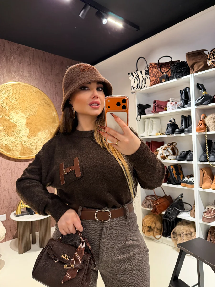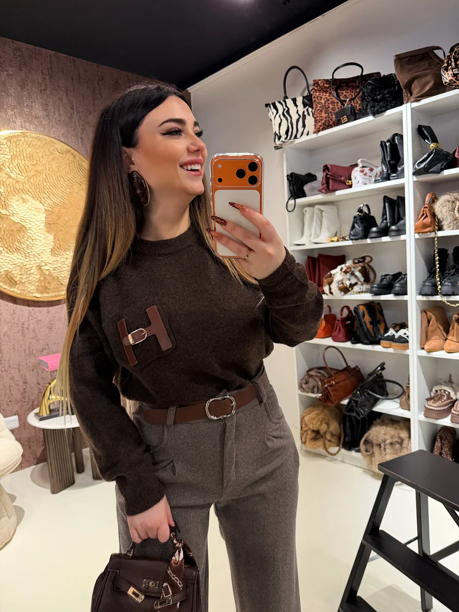 Maglioncino in morbido filato effetto mohair con taschino frontale impreziosito da applicazione con fibbia in ecopelle. Vestibilità comoda e taglio leggermente corto, ideale da abbinare a pantaloni o gonne a vita alta. Un capo caldo, elegante e versatile per la stagione autunnale.