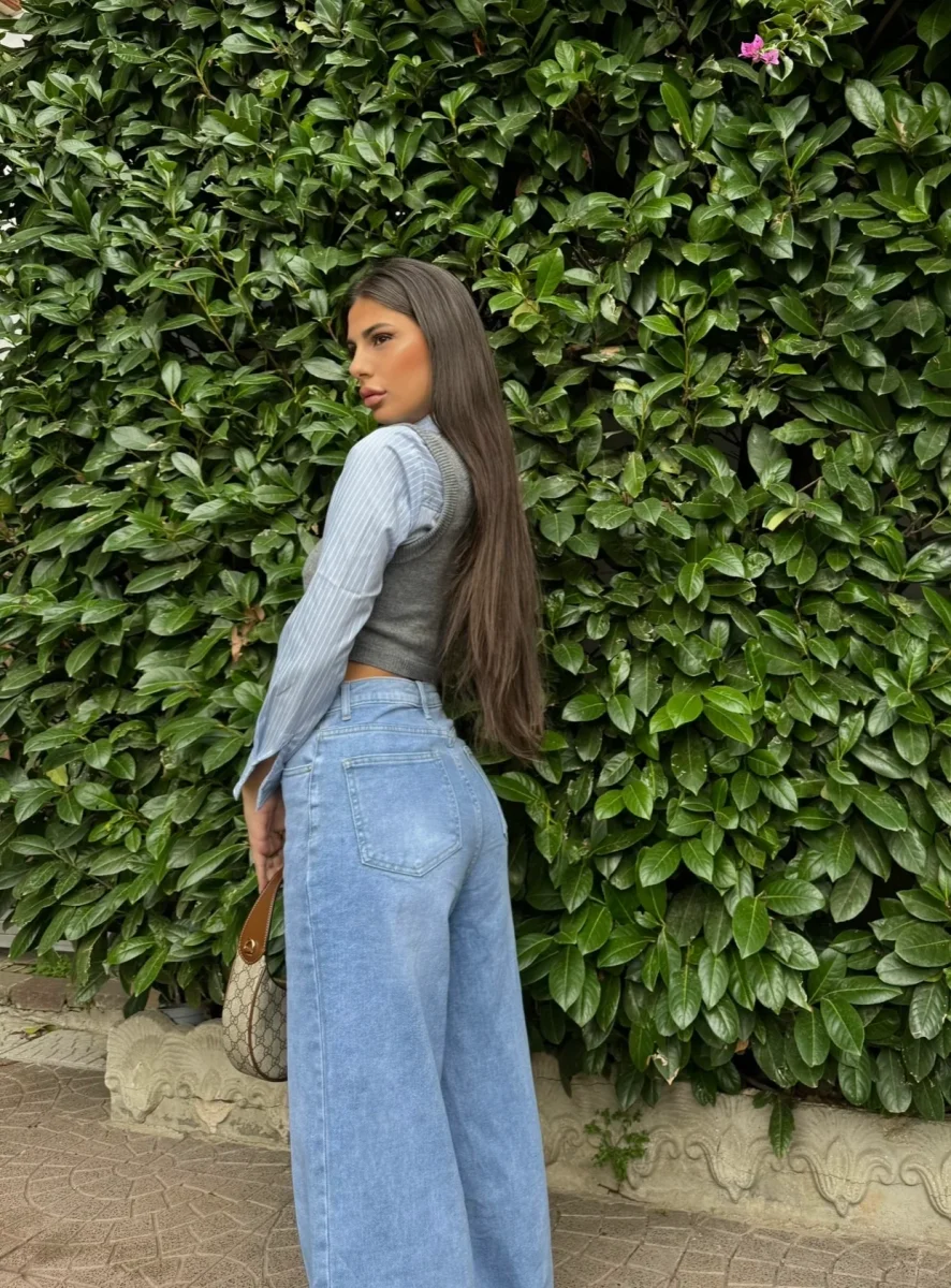 Set due pezzi composto da maglioncino crop grigio e camicia a righine celesti
