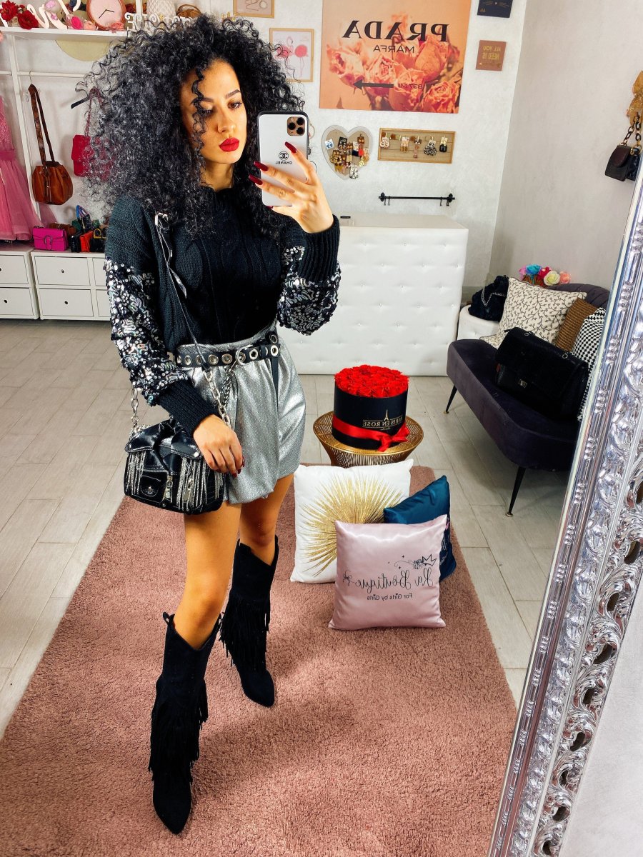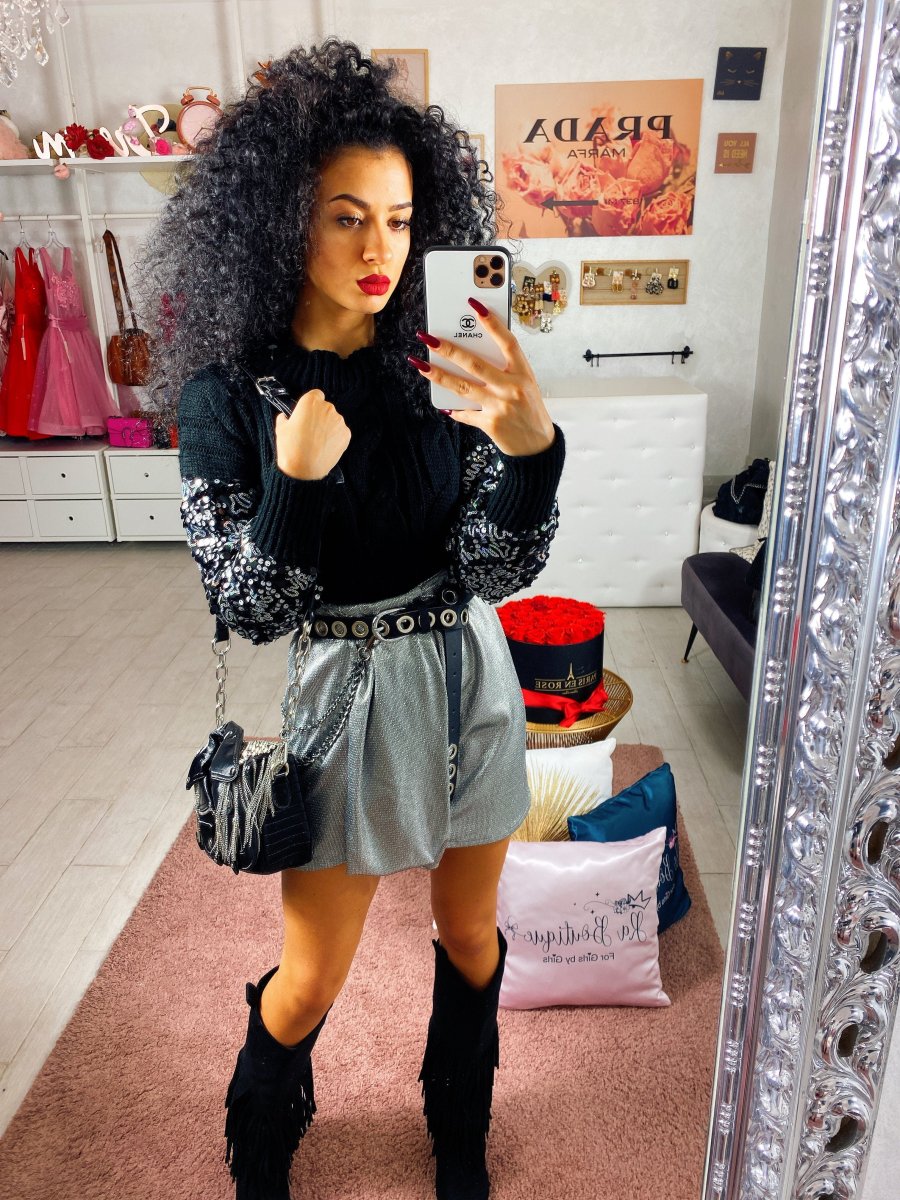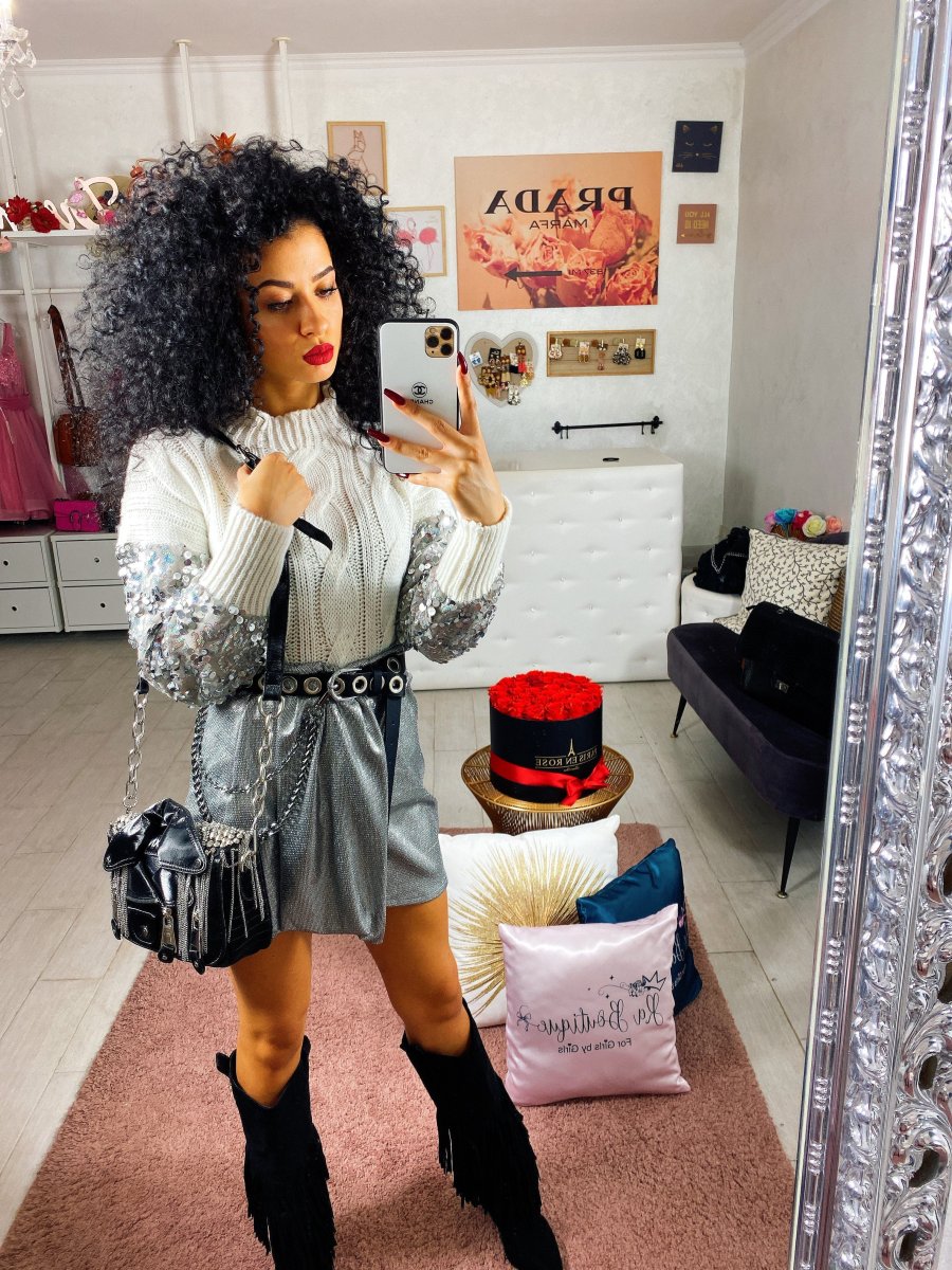 Maglione in lana con trama a trecce e manicotti in paillettes ricamato. Tessuto morbido