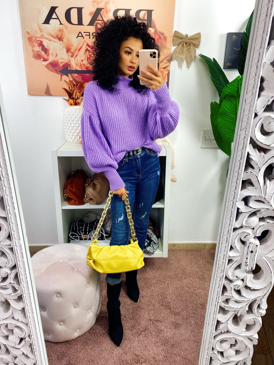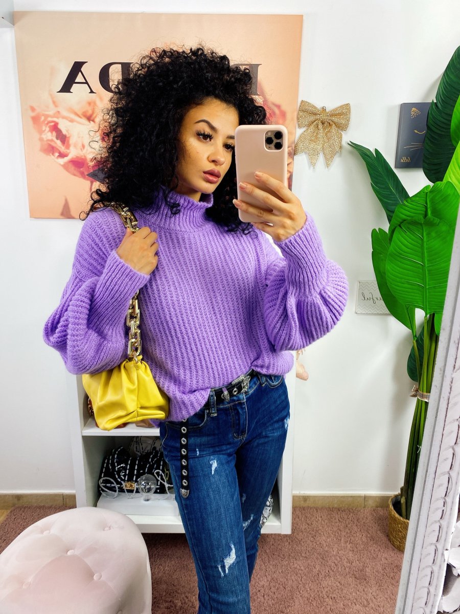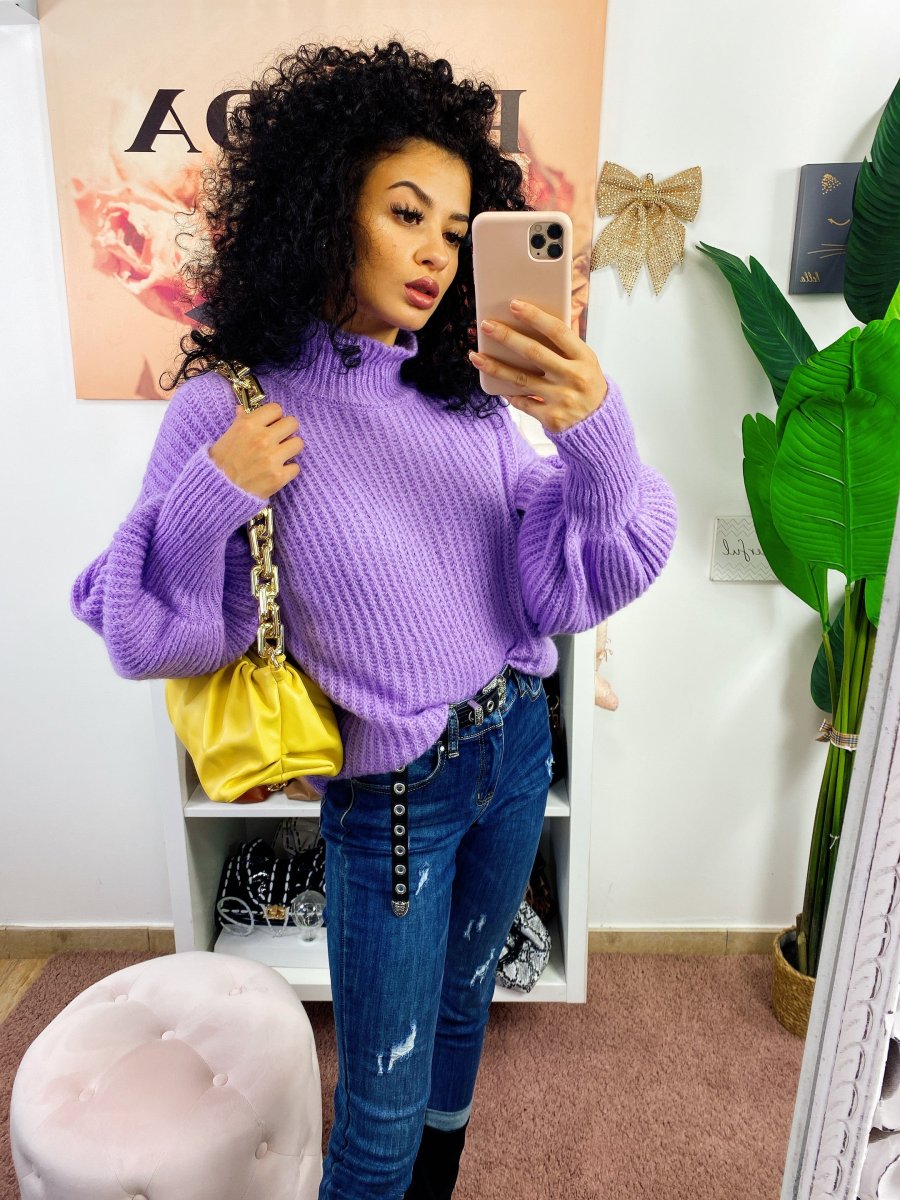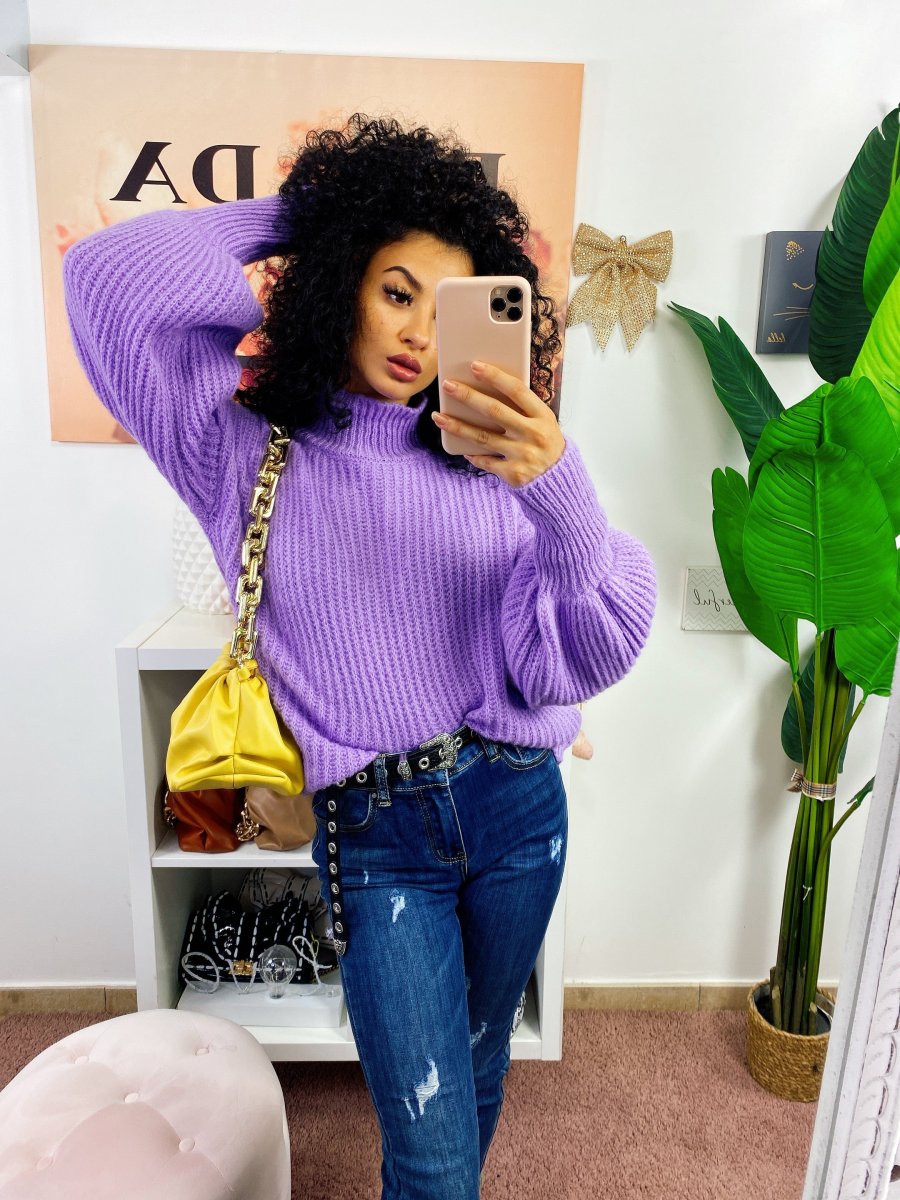 Maglione morbido a collo alto con manica ampia e polsino. Tessuto caldo e comodo.