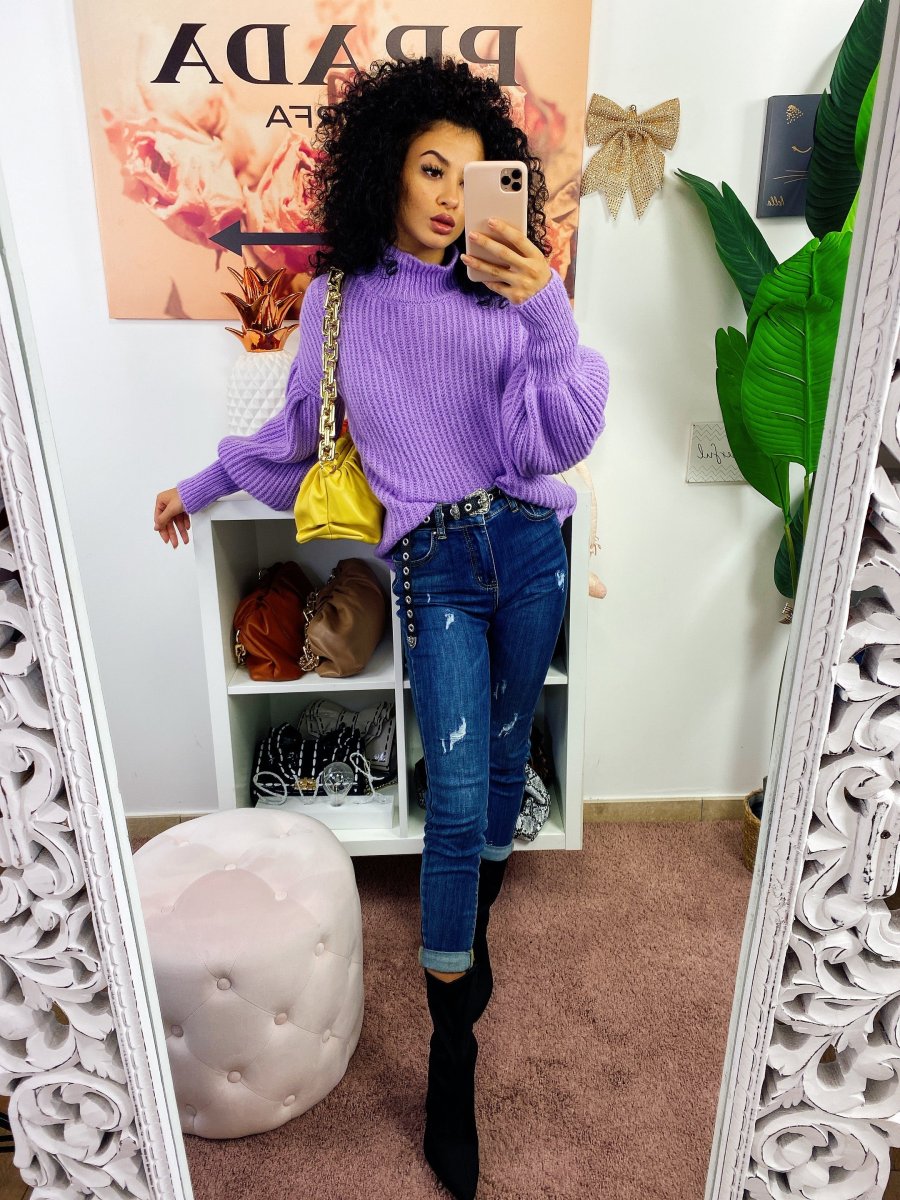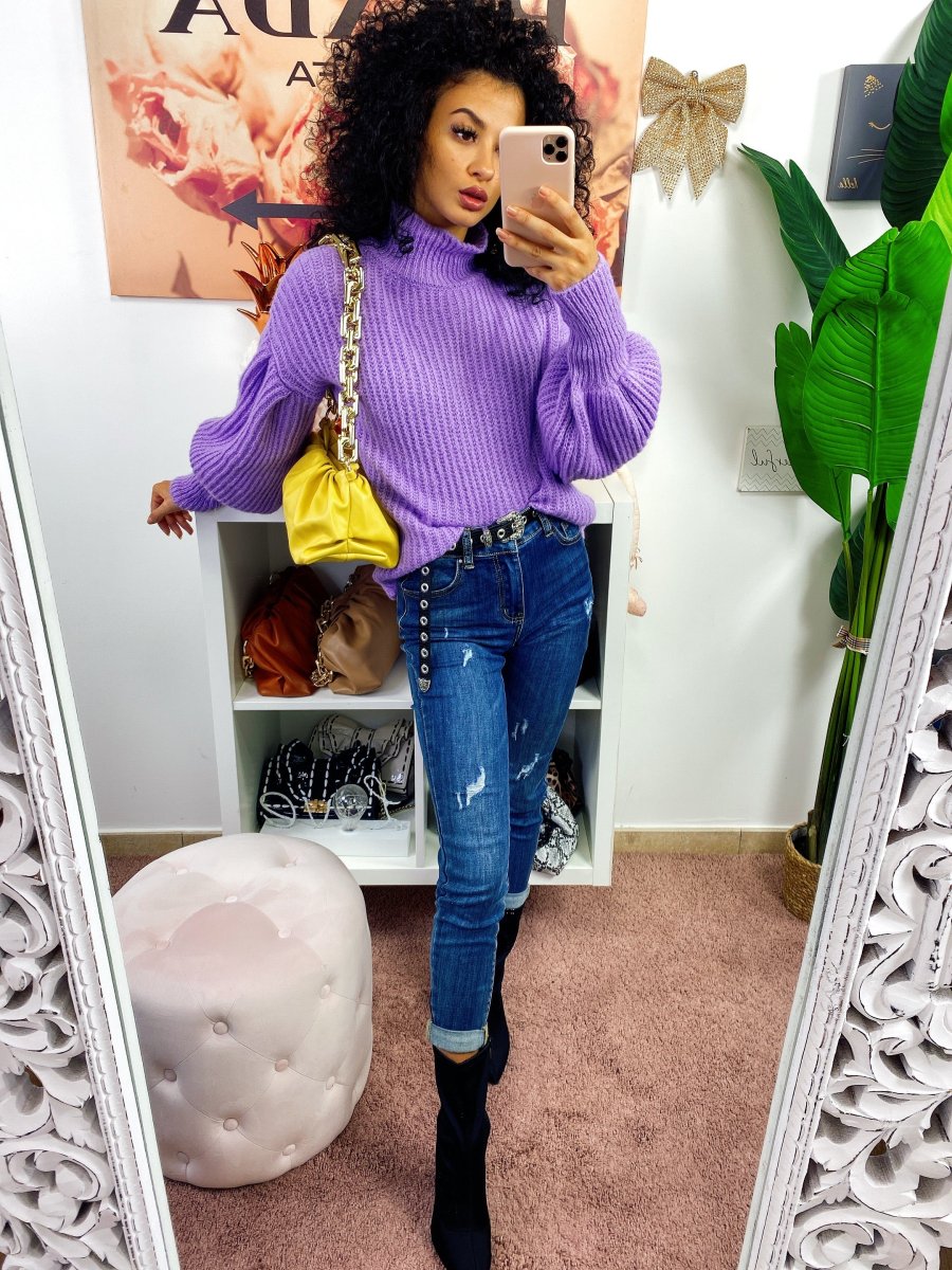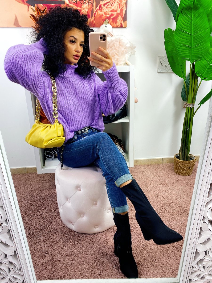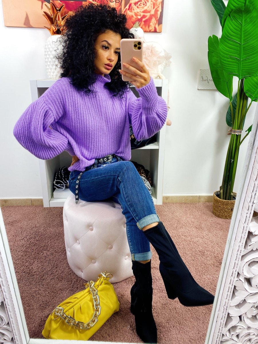 Maglione morbido a collo alto con manica ampia e polsino. Tessuto caldo e comodo.