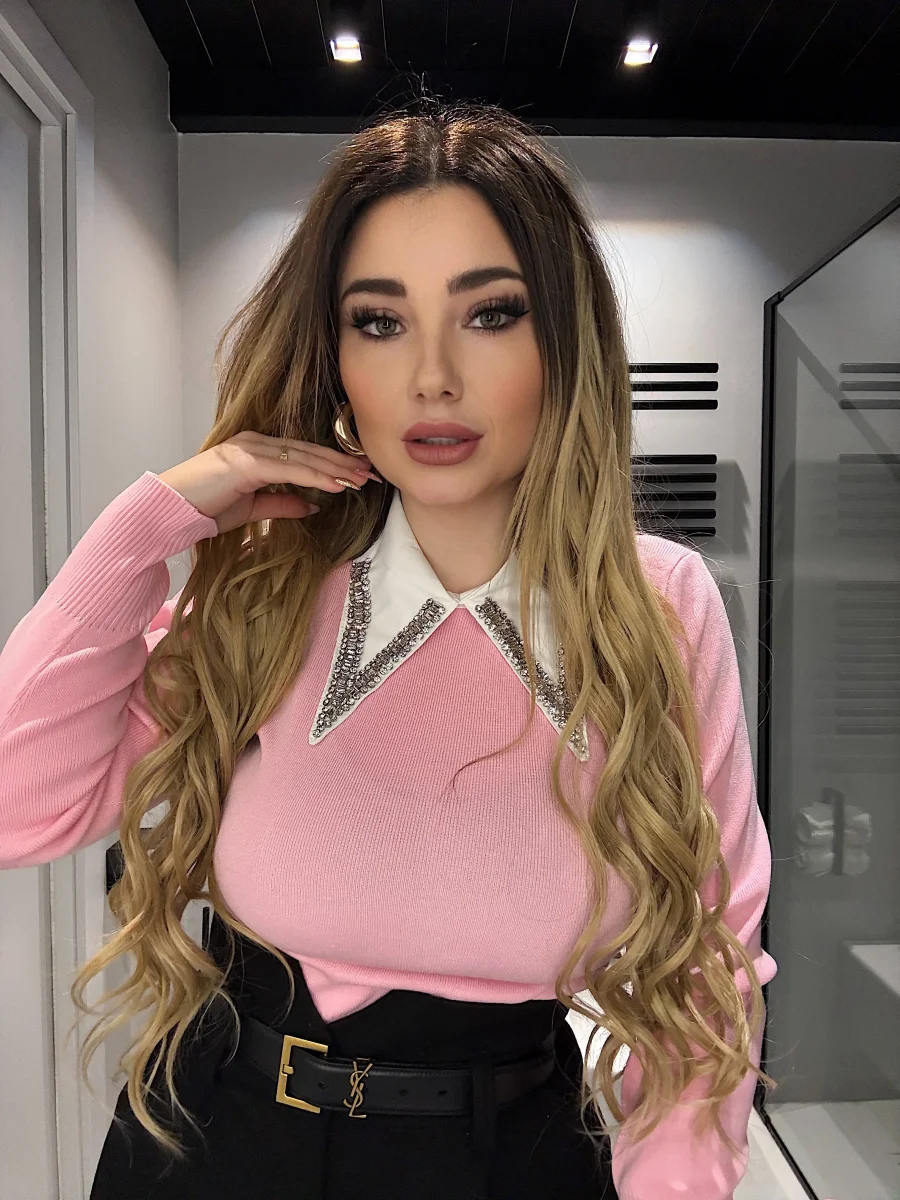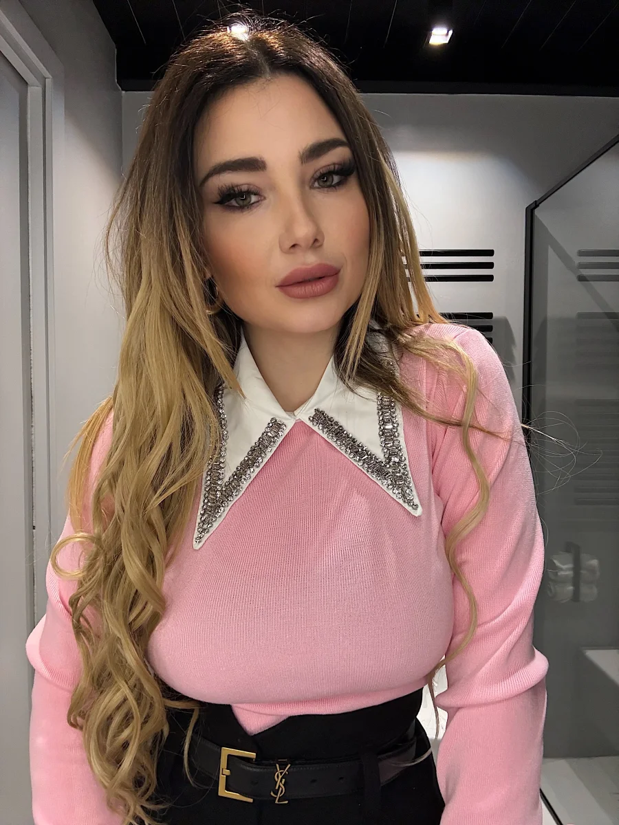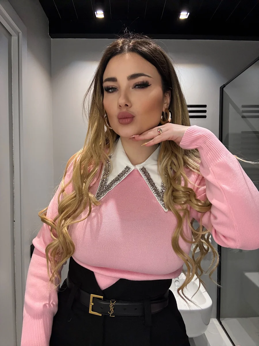 Maglioncino alta qualità con collo in strass effetto camicia.