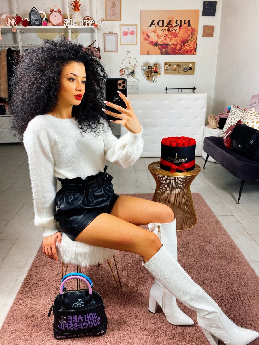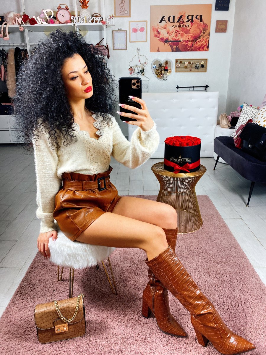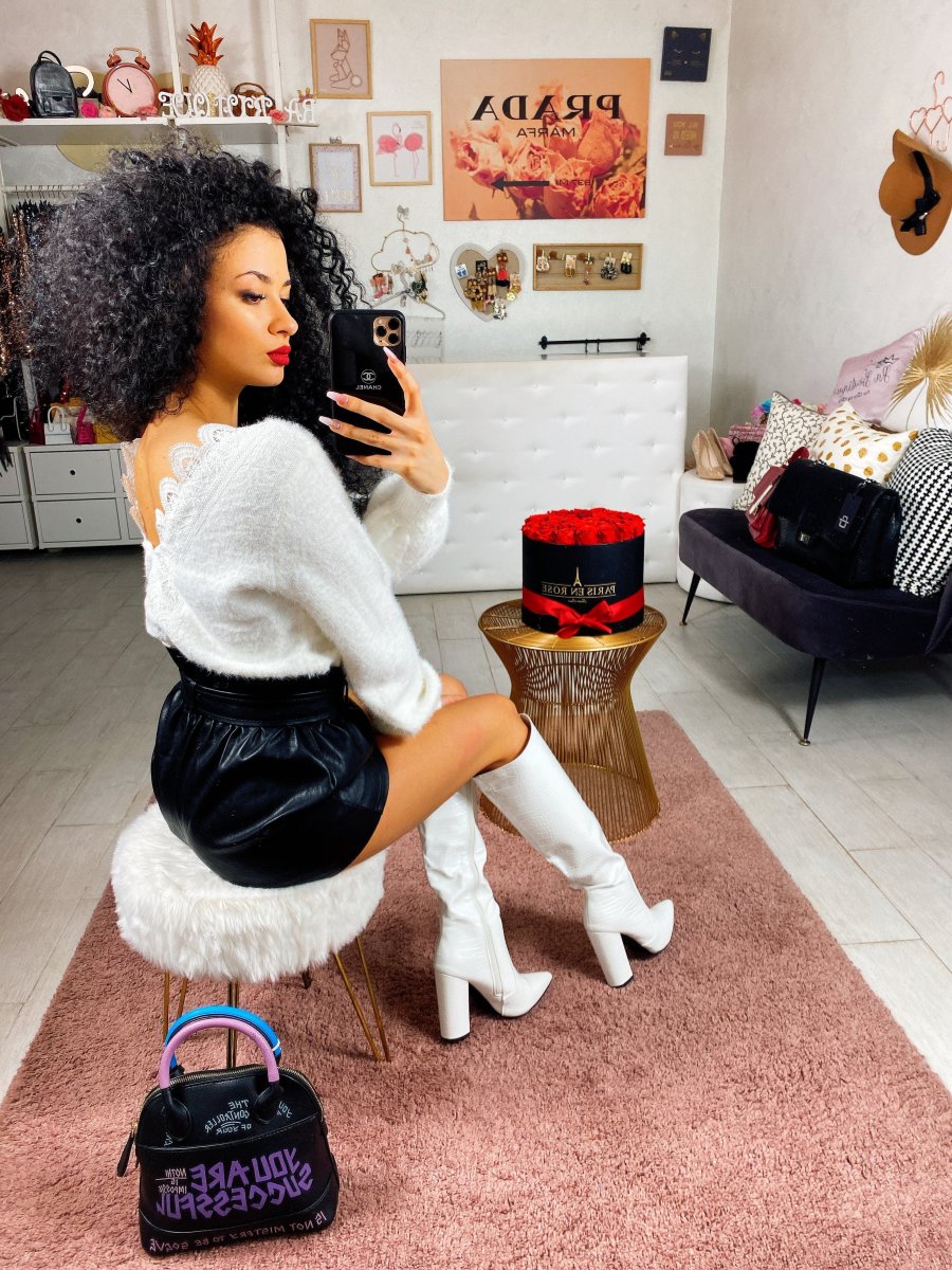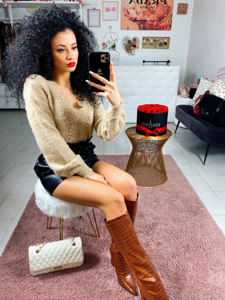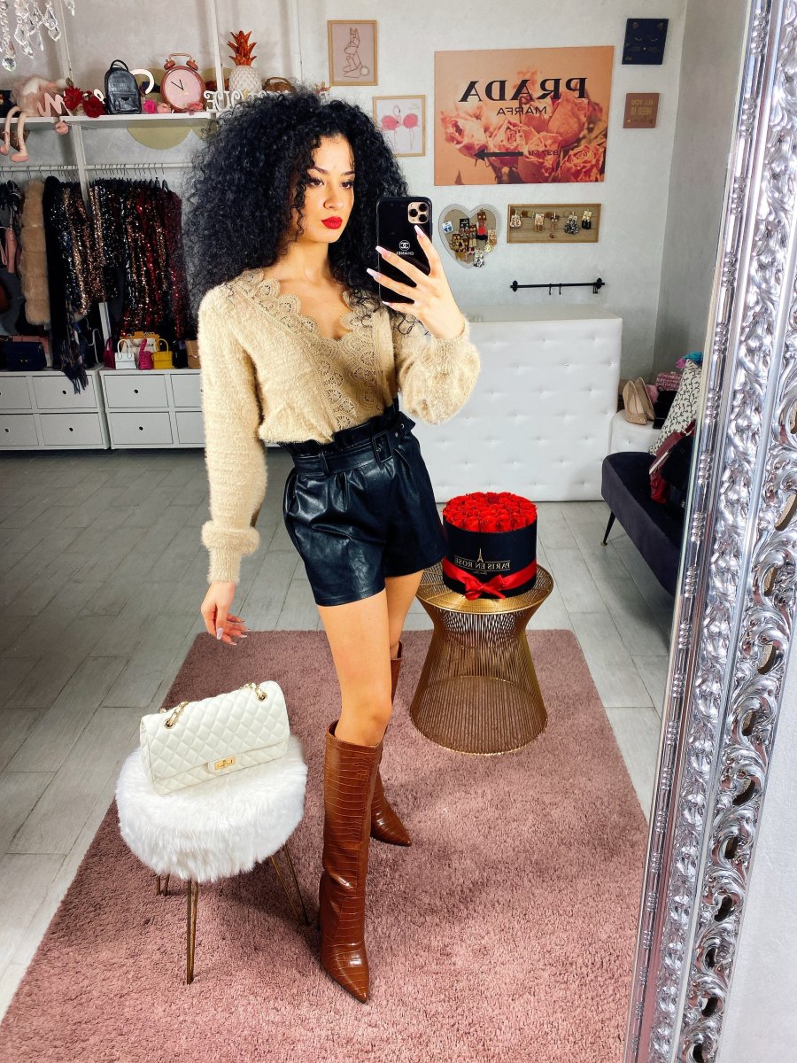 Morbidissimo maglione in lana. Particolare nello scollo a V arricchito da un prezioso pizzo