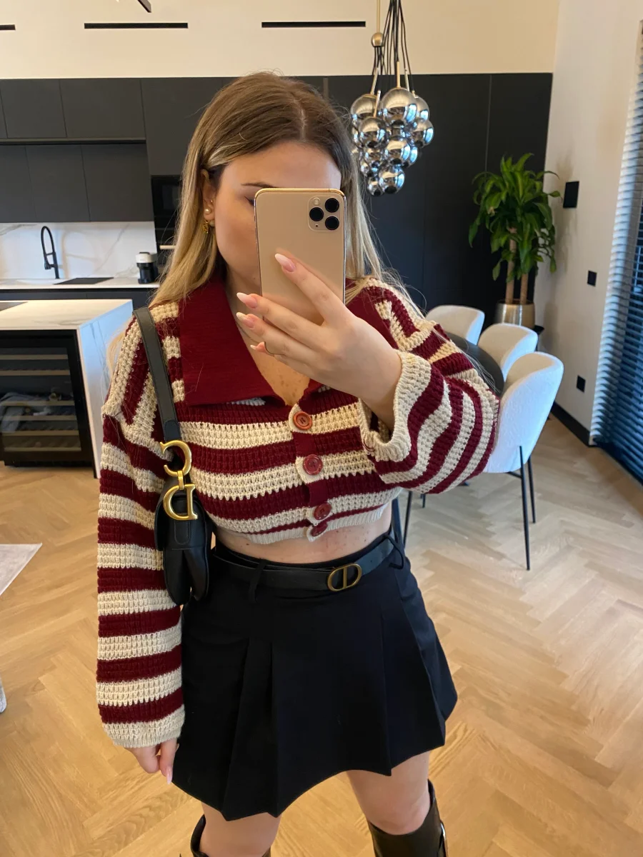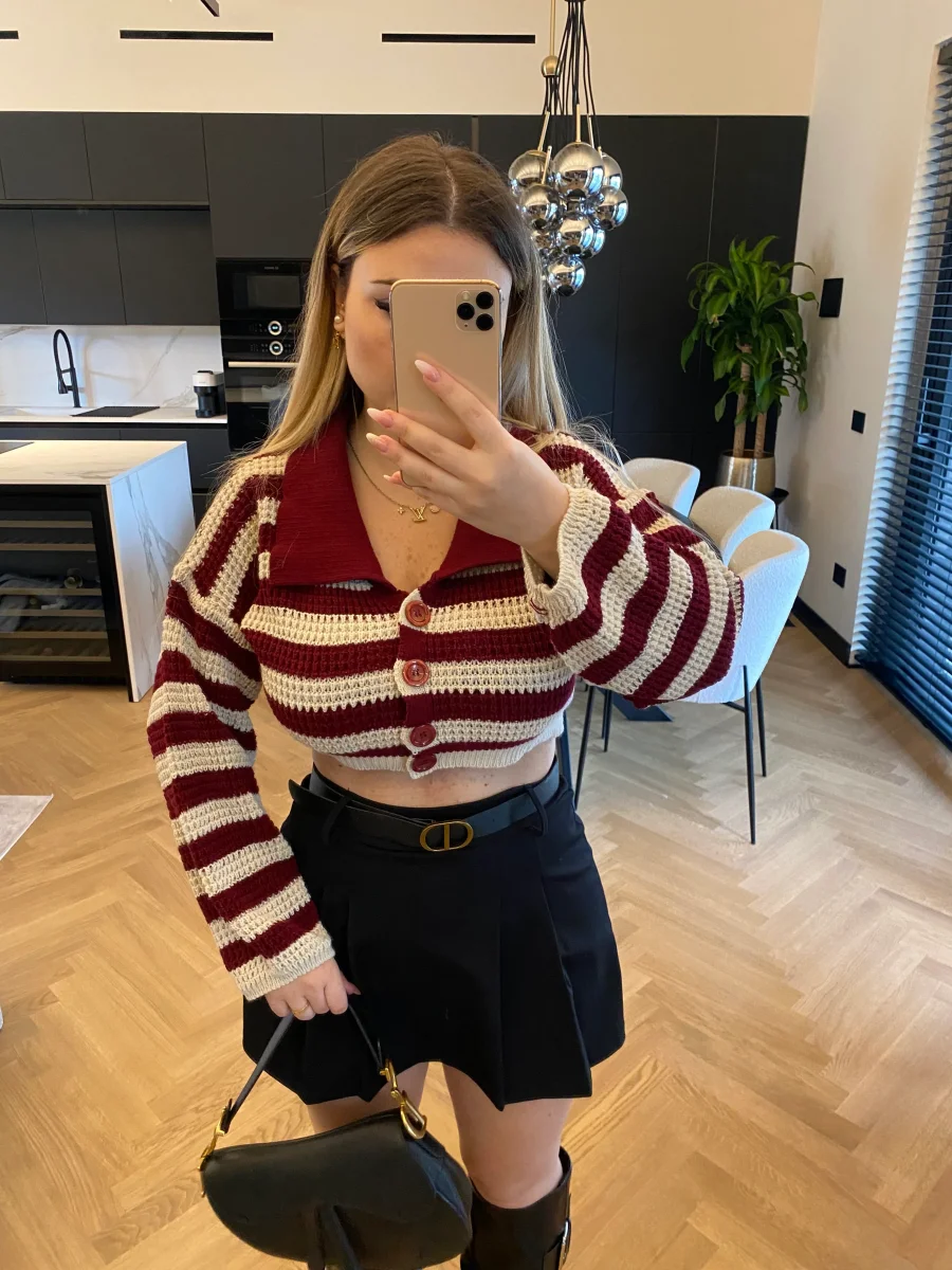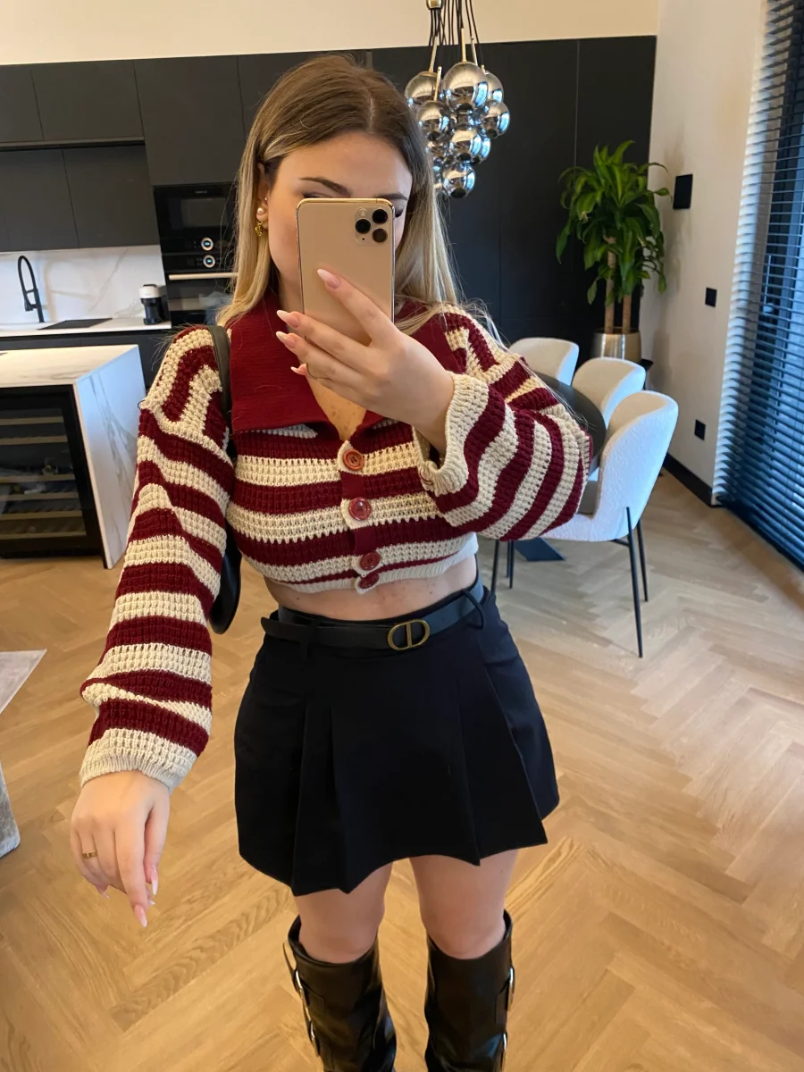 Maglione crop a righe con colletto e bottoncini.